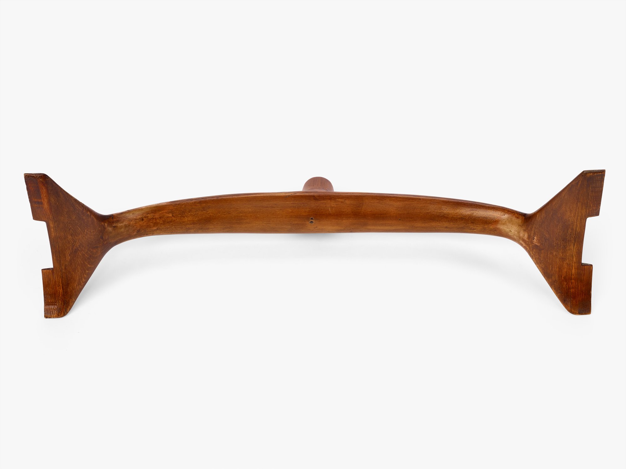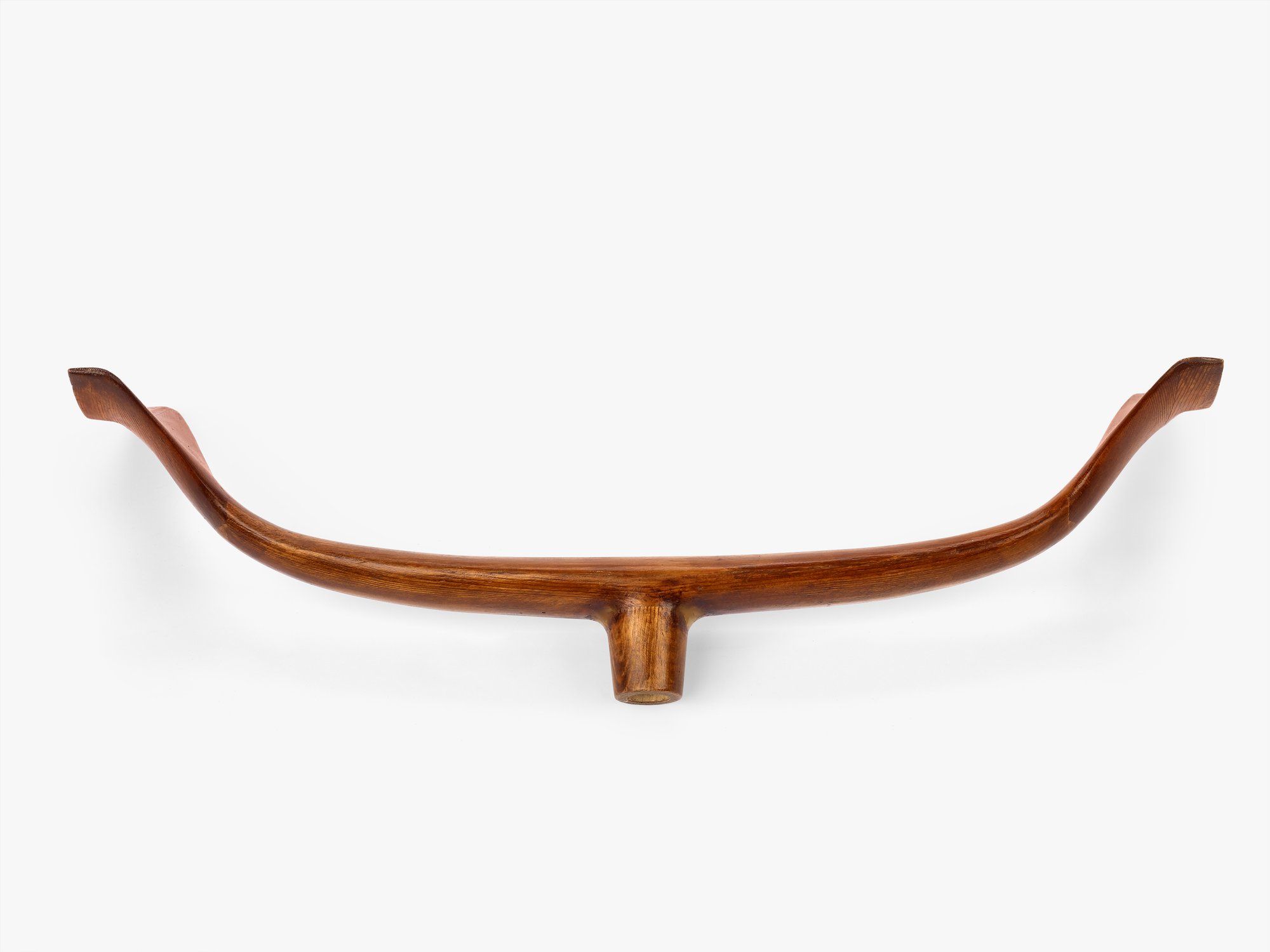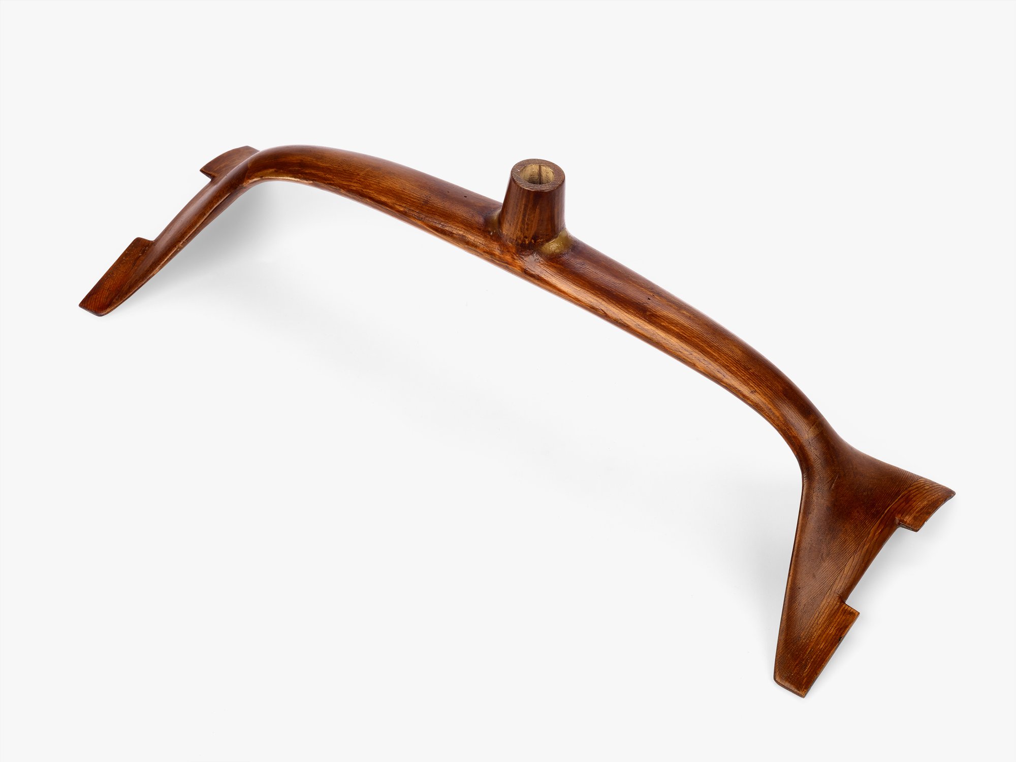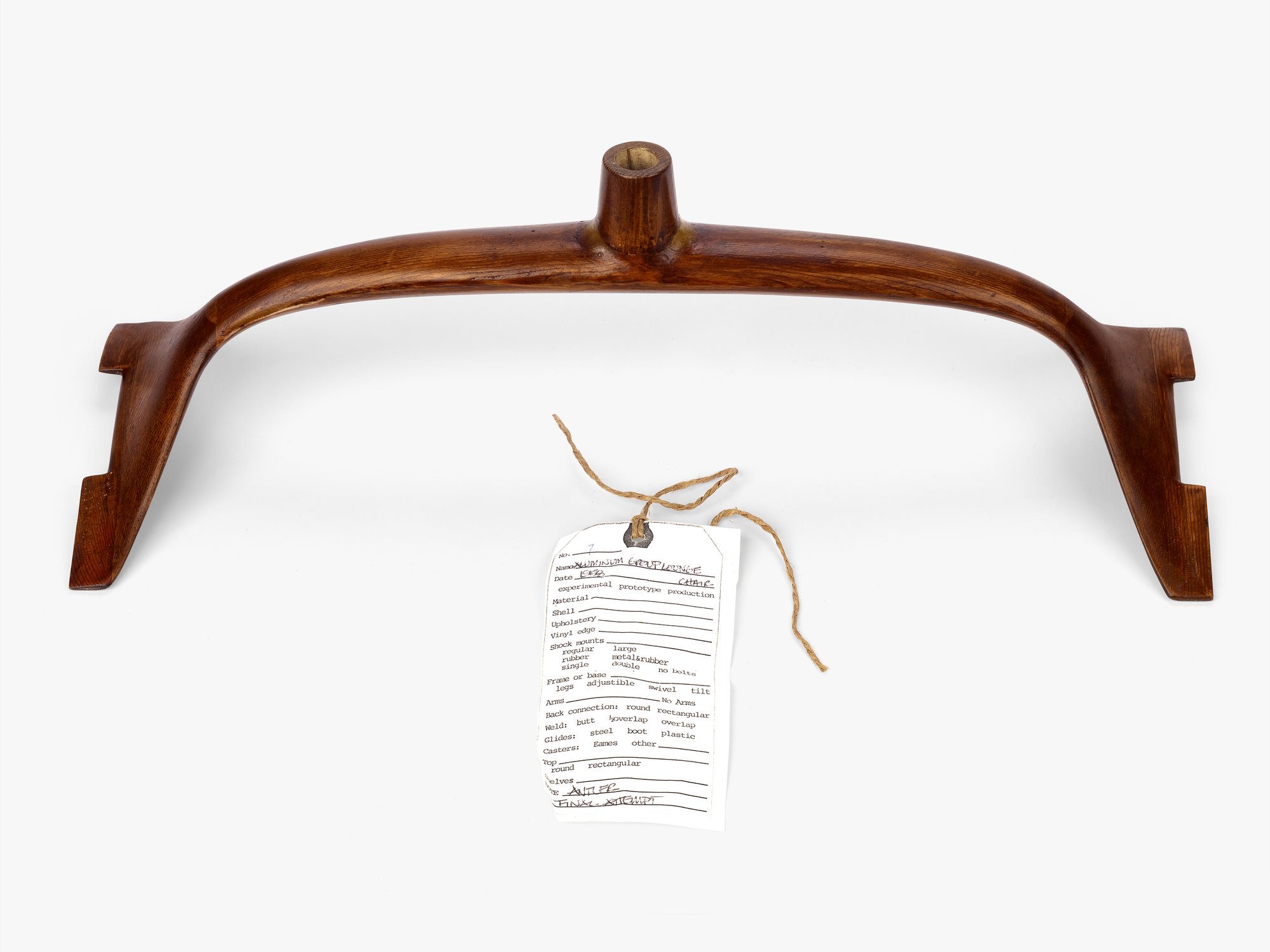A key conceptual feature of the Eames Aluminum Group is the pair of aluminum spreaders that hold the upholstery taut between two aluminum side members. These spreaders create the necessary tension for transforming fabric into a supportive seat and backrest. Dubbed “antlers” by the Eames Office staff thanks to their distinctive shape, one spreader is located midway up the chair’s back and doubles as a handle. The other is located underneath the seat and serves both to stretch the textile and to attach the body of the chair to its base. This is an example of a wooden prototype for the lower spreader, indicated by the small hollow tube at its center that would eventually be used to connect the chair to a base column. Unlike the other experimental wooden versions of the lower spreader, this one does not have notches in the wings that extend from either end. Instead it terminates in a smooth edge, making it more similar in form to the unnotched spreaders that were eventually used on the back of the chair. Comparing these various prototypes gives a sense of the specific design problems that the Eames Office was working out at the beginning of this project. In this case, they appear to have questioned whether or not notches were necessary to secure the chair to its base; based on the final design of the chairs, it seems they concluded that indeed they were.