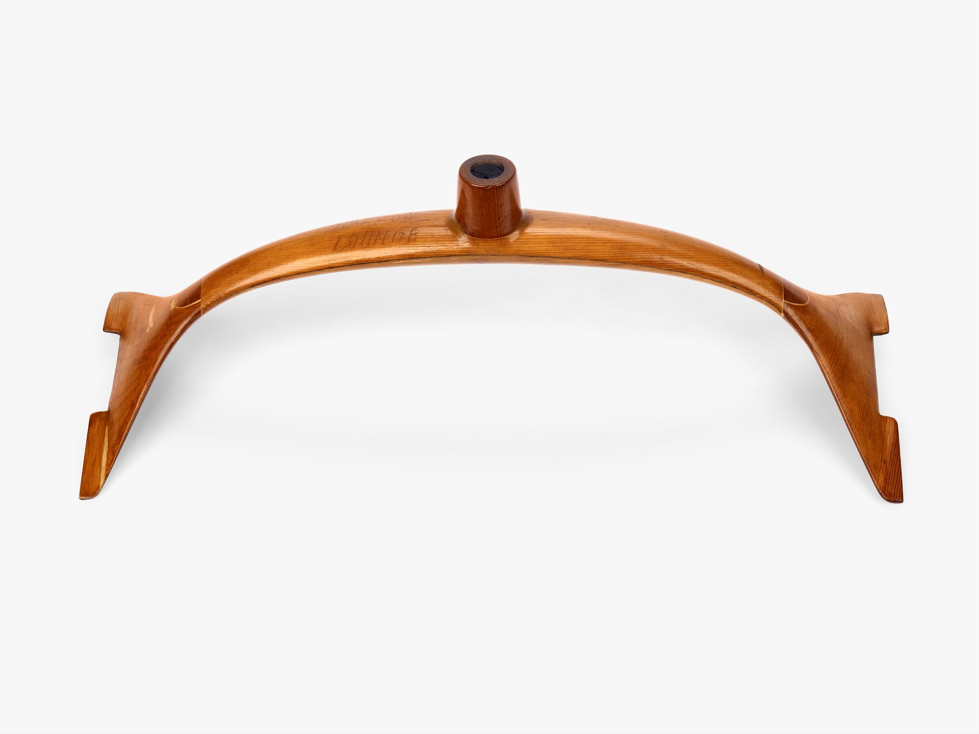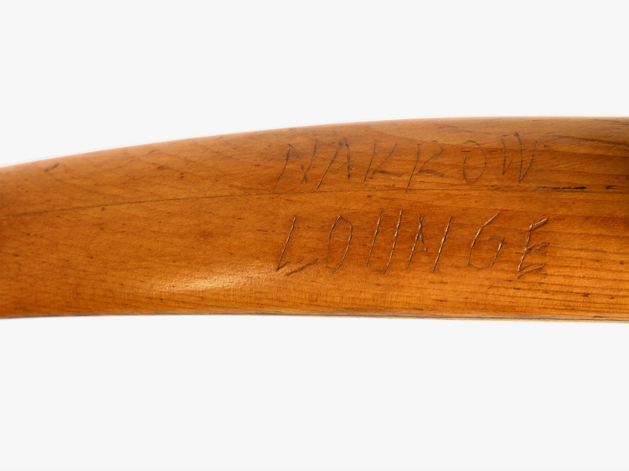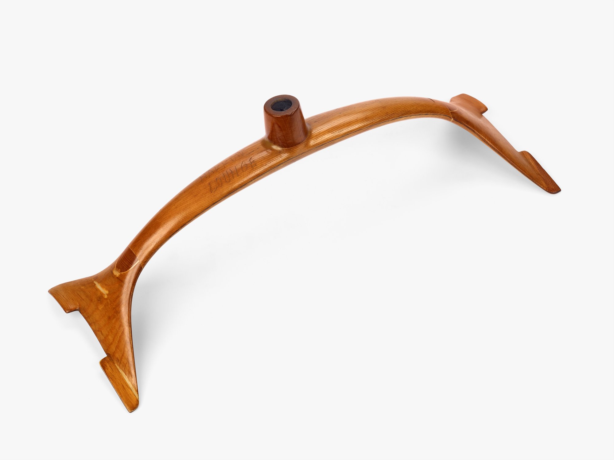 A key conceptual feature of the Eames Aluminum Group is the pair of aluminum spreaders that hold the upholstery taut between two aluminum side members. These spreaders create the necessary tension for transforming fabric into a supportive seat and backrest. Dubbed “antlers” by the Eames Office staff thanks to their distinctive shape, one spreader is located midway up the chair’s back and doubles as a handle. The other is located underneath the seat and serves both to stretch the textile and to attach the body of the chair to its base. This is an example of a wooden prototype for the lower spreader, indicated by the small hollow tube at its center that would eventually be used to connect the chair to a base column. A carved inscription next to the tube reads “NARROW LOUNGE.”