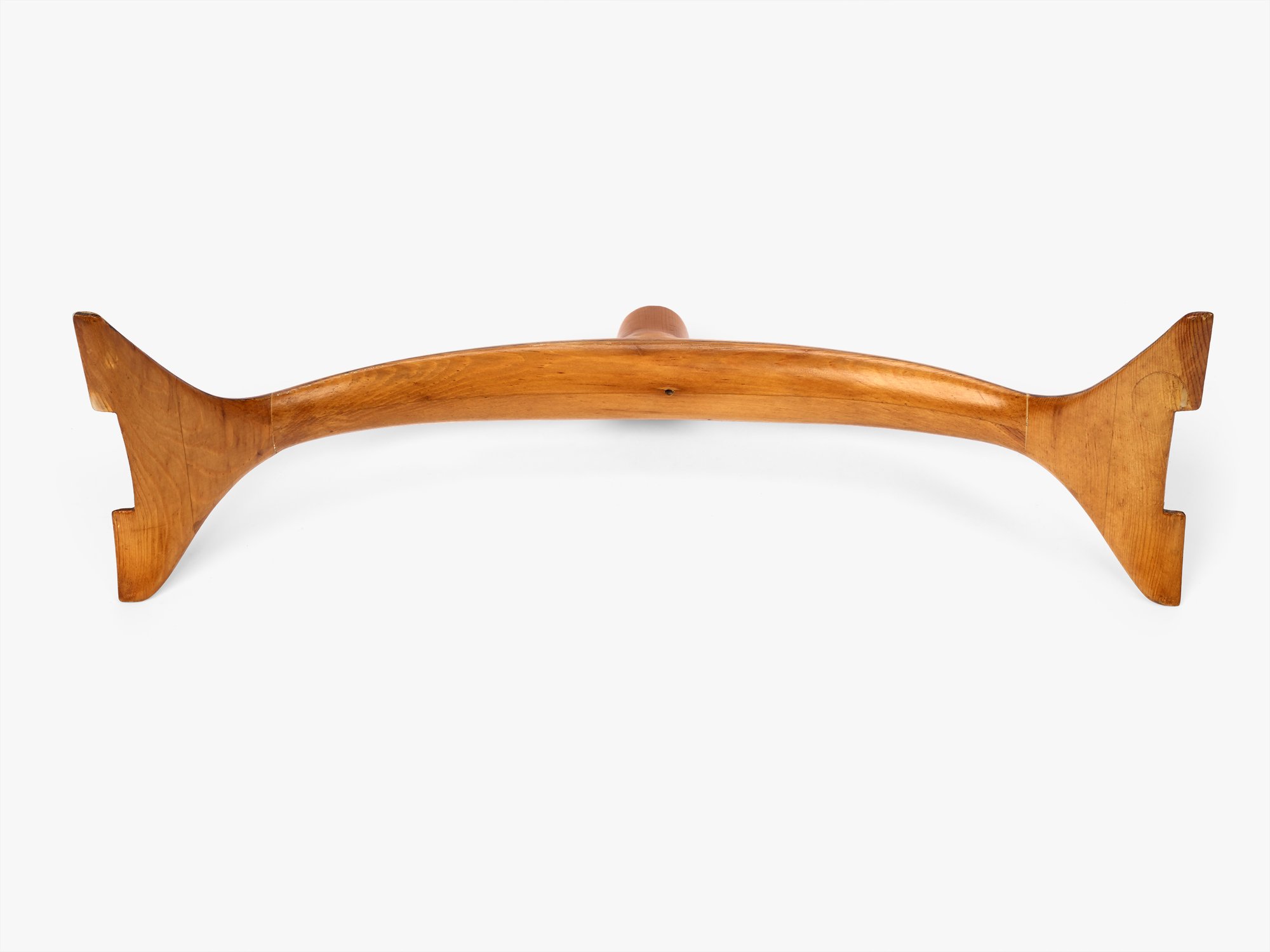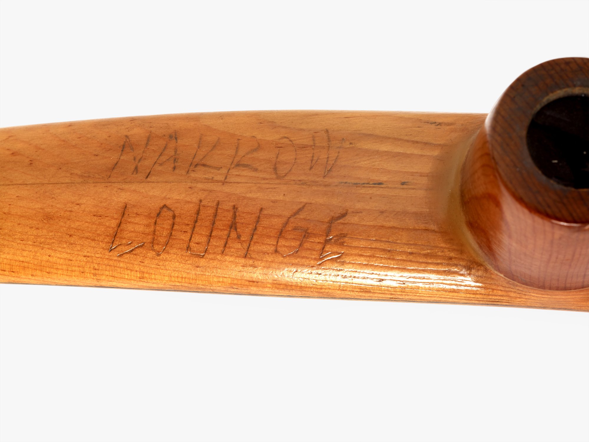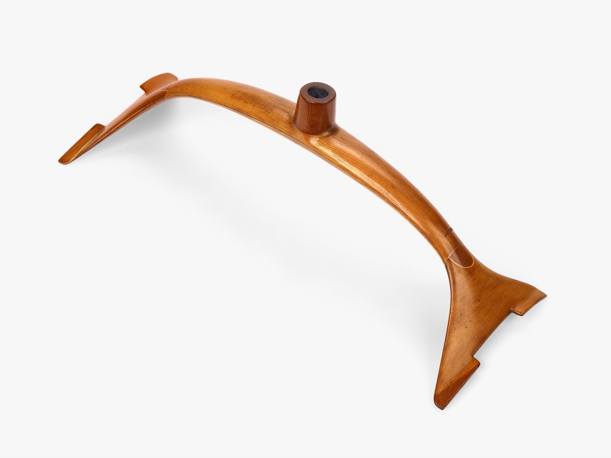 A key conceptual feature of the Eames Aluminum Group is the pair of aluminum spreaders that hold the upholstery taut between two aluminum side members. These spreaders create the necessary tension for transforming fabric into a supportive seat and backrest. Dubbed “antlers” by the Eames Office staff thanks to their distinctive shape, one spreader is located midway up the chair’s back and doubles as a handle. The other is located underneath the seat and serves both to stretch the textile and to attach the body of the chair to its base. This is an example of a wooden prototype for the lower spreader, indicated by the small hollow tube at its center that would eventually be used to connect the chair to a base column. A carved inscription next to the tube reads “NARROW LOUNGE.”