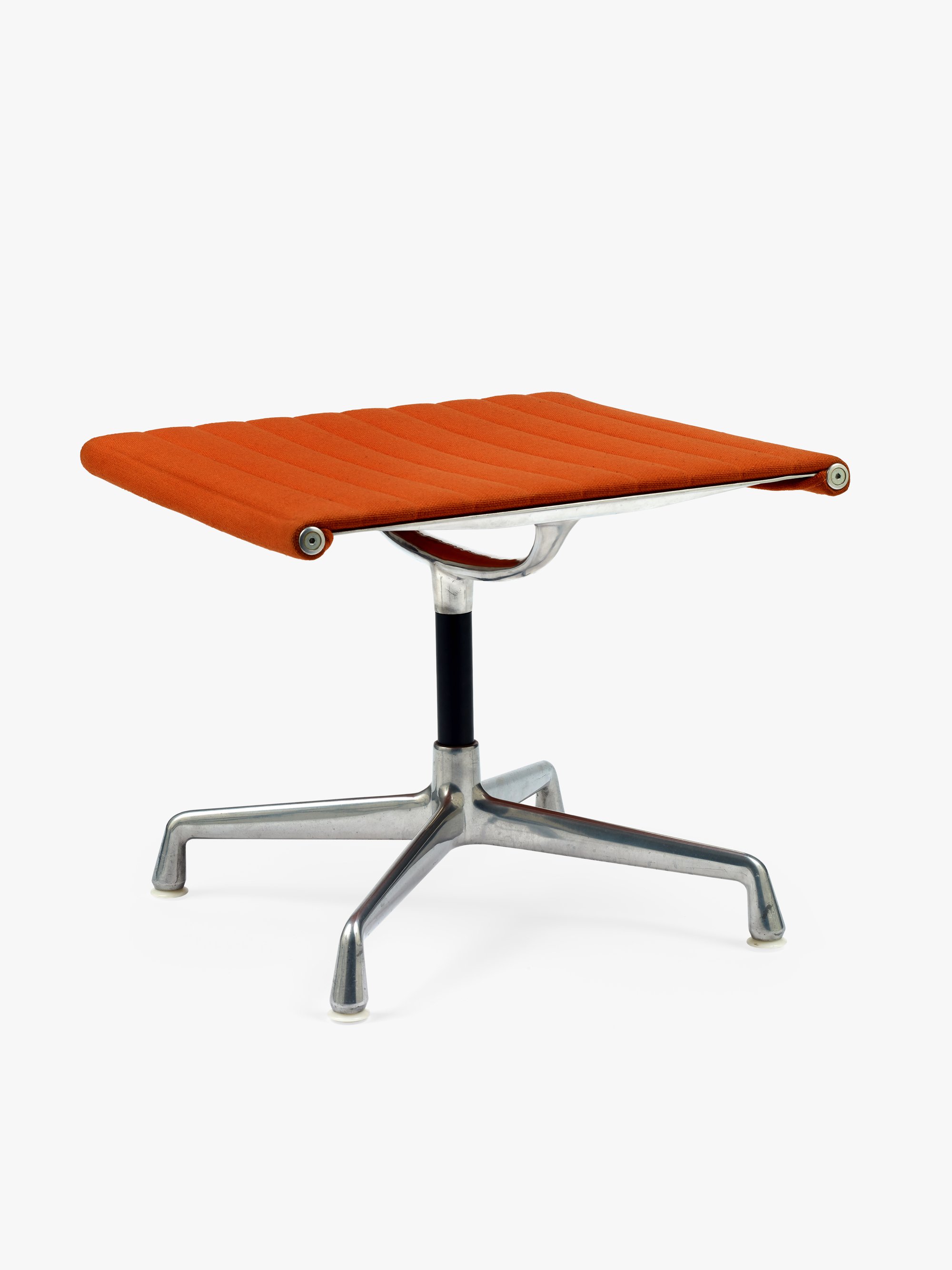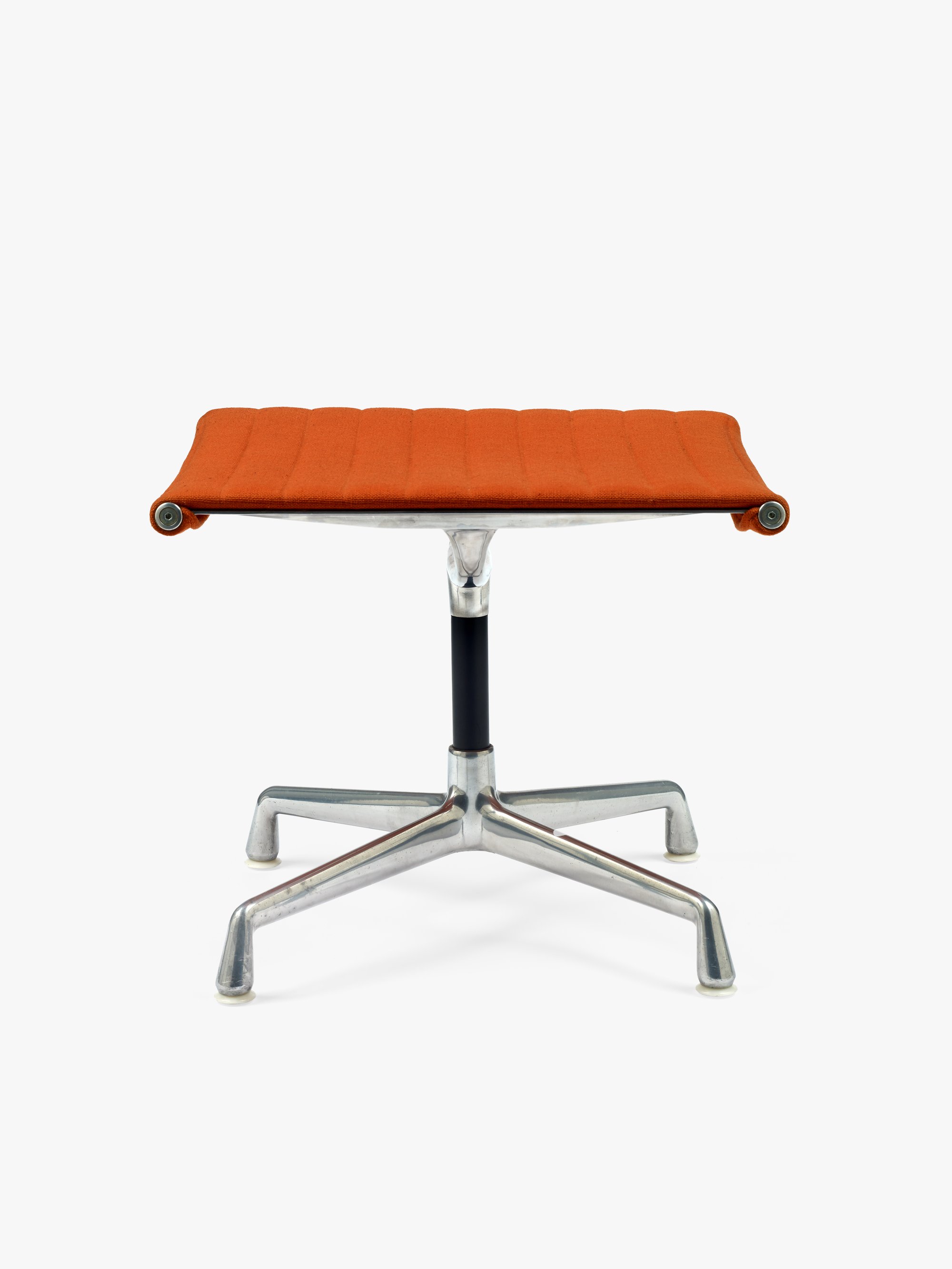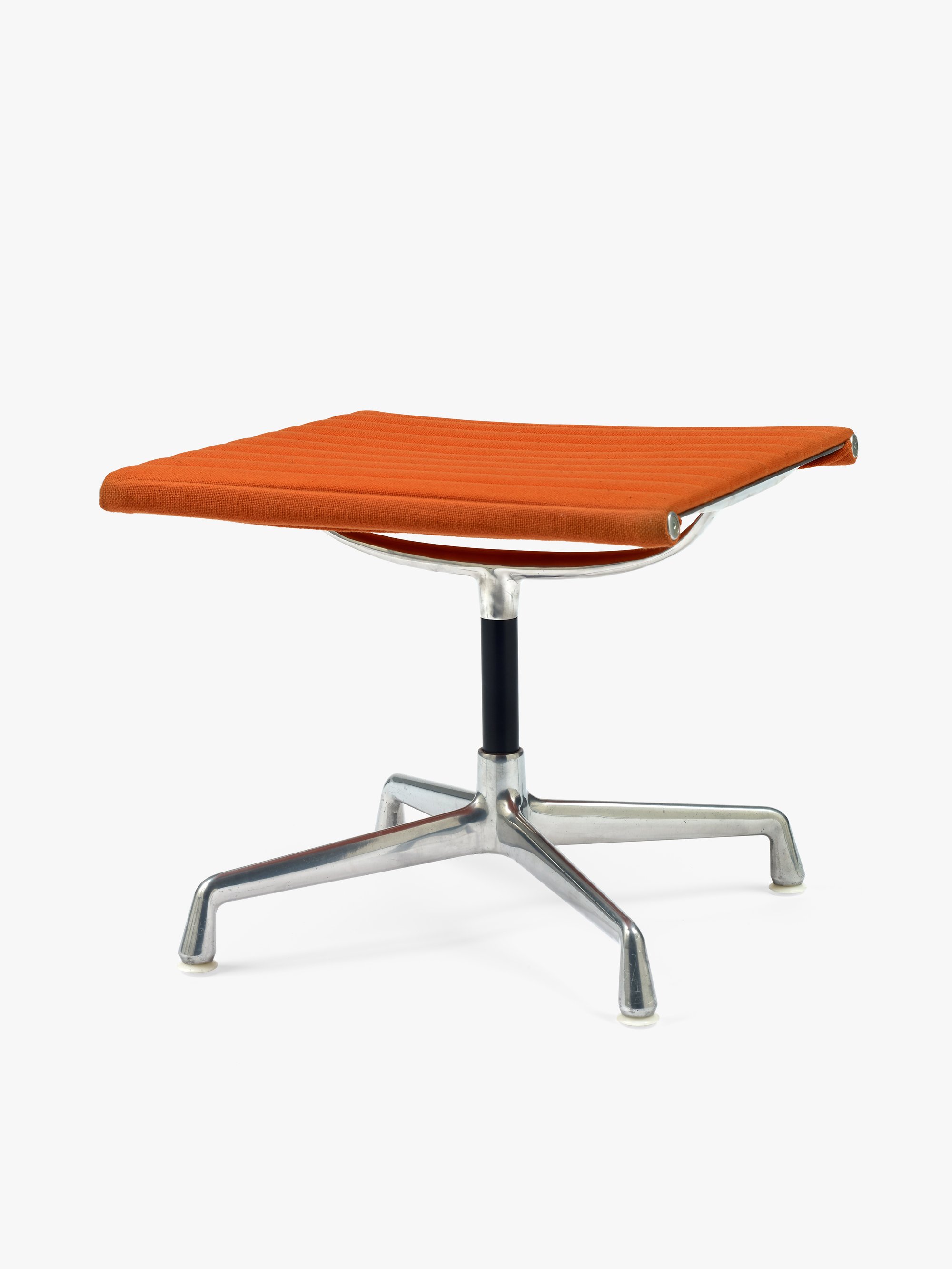 This ottoman uses the “Eames Universal Base,” which was introduced in 1961 as a base for chairs, tables, and ottomans from various Eames collections. This replaced the “Eames Contract Base” used in earlier models, which had been first designed in the early 1950s and also modified over time. Though both the Contract and Universal bases were made of polished aluminum and included four arms extending from a central column, the newer base swapped the straight, fin-like arms of the Eames Contract Base for a more slender and rounded design. In particular, whereas the Eames Contract Base terminated with cylinders that looked like rather distinct appendages to the legs, the Eames Universal Base featured a more continuous line. Each leg terminated with a seamlessly connected foot that flared slightly at the end (for greater stability). This ottoman is also distinguished by its orange Hopsack textile. Unlike the Eames Aluminum Group’s original synthetic upholstery, Hopsack is made of natural wool fibers and woven in a fairly loose weave that creates a visible, though subtle, grid. The bright orange color is emblematic of the vivid and warm color palette that became popular in U.S. fashion, interior design, and more in the late 1960s and 1970s; a result of multiple overlapping cultural currents, from the hippie counterculture to the influence of British mod.