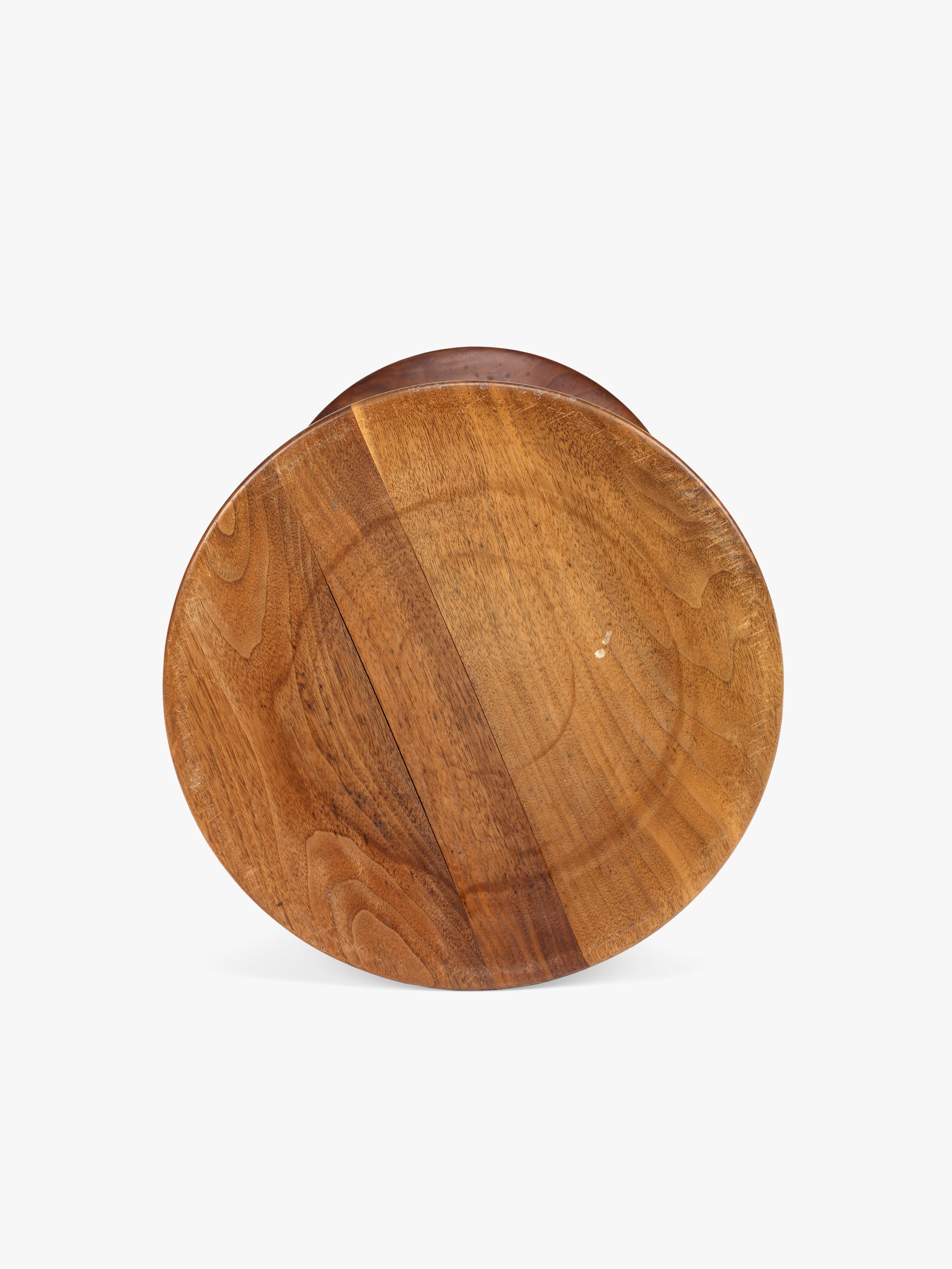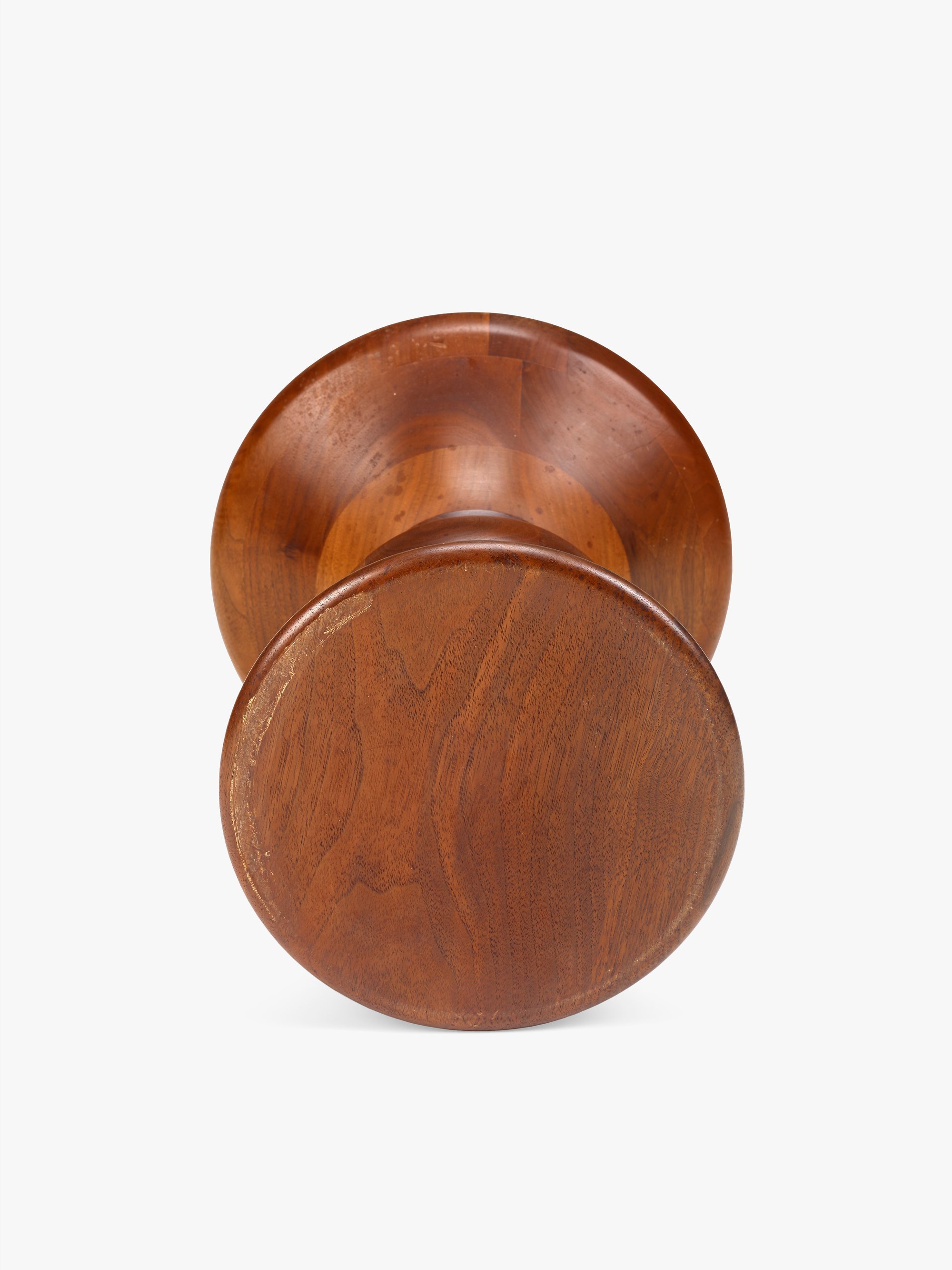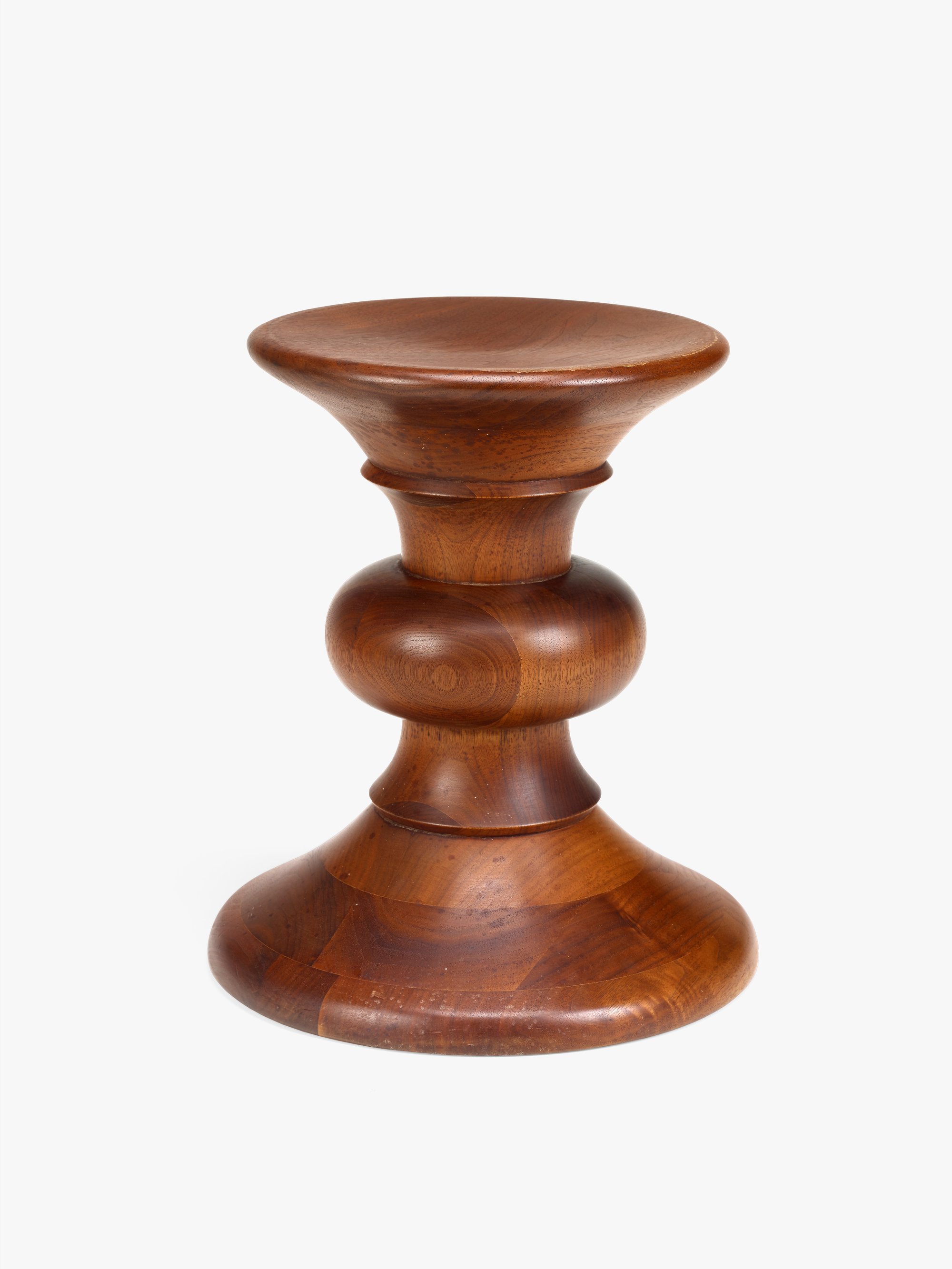 This is one of several walnut stools that the Eameses designed in 1960 for the Time & Life Building in New York, and together the stools formed a furniture system. Such systems generally involve a series of related furniture designs, all of which utilize an array of standardized elements that can be combined in various ways. This allows consumers to select the combination of parts that best suits their taste and needs. It also reduces manufacturing costs, a savings that can be passed along to the consumer. In the case of the Eameses' walnut stools, they each consisted of a flared base, short pedestal, and shallow bowl-shaped top. The bases and tops were the same in all cases, but the pedestal was produced in multiple forms. It is the pedestals’ angles and curves that bring visual interest to the stools, but Ray claimed that the most challenging part of producing them was designing the standardized top. This was because it had to achieve a tricky balance: be deep enough to make for a comfortable seat, but not so deep that you couldn’t safely set a cup of coffee on it.