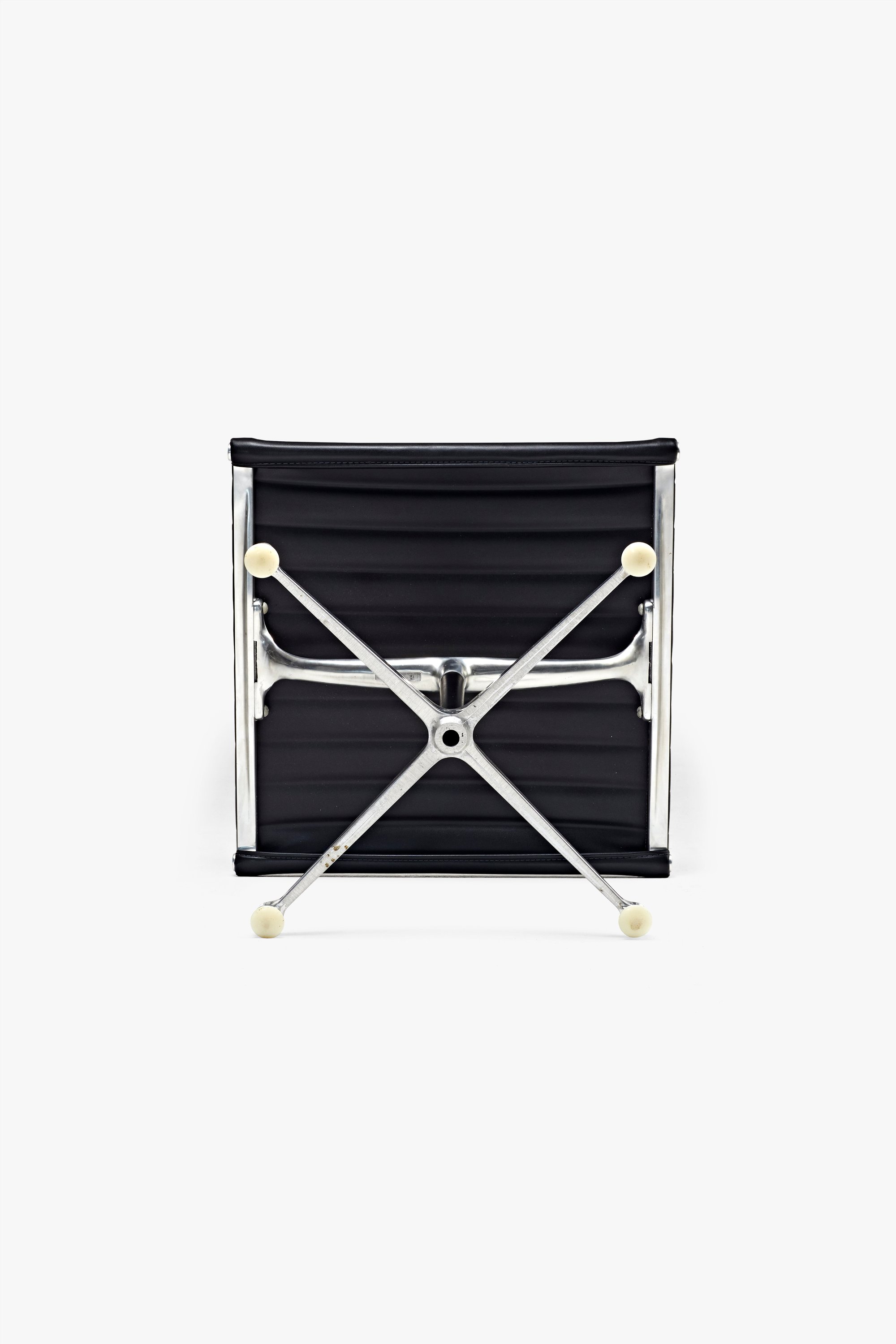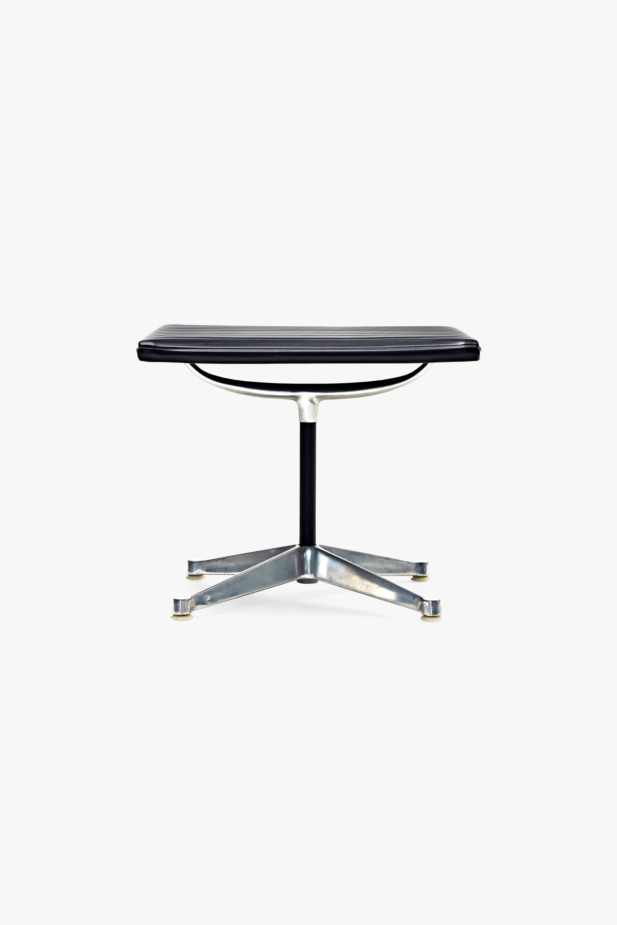 The Eames Aluminum Group ottoman uses the same approach to framing and stretching a Naugahyde pad as the collection’s chairs. Unlike the chairs, however, only one aluminum spreader is used. The ottoman’s single spreader bisects its underside and parallels the lines of the Naugahyde upholstery pad— a subtle design detail that results in an overall sense of measured symmetry for the piece. In the early Eames Aluminum Group brochures, the ottoman is shown paired with the reclining chair. In one case, a lounging model uses it as a footrest; in another, an open book rests upon the ottoman in a way that suggests the absent reader will return at any moment. In other words, the ottoman— and its promotional staging— heightens the sense of the collection as an instrument of rest and relaxation. This aim was highlighted by the name “Leisure Group” that was used at times during the collection’s development; a somewhat surprising moniker given its later success as office furniture and a reminder of the way that both the designers and the collection’s manufacturer Herman Miller readily adapted the Eames Aluminum Group based on consumer reception and use.
