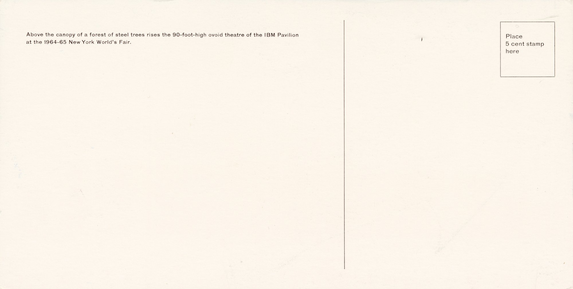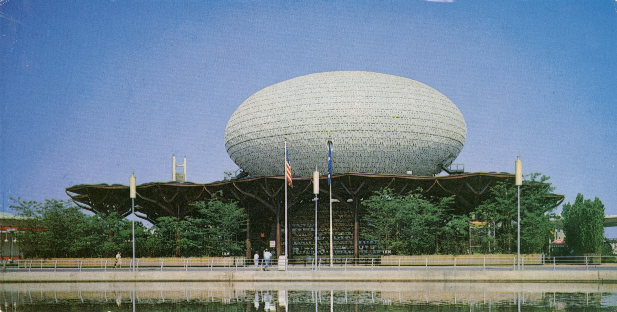 The Eames Office collaborated with the architectural office of Eero Saarinen (followed by Kevin Roche and John Dinkeloo after Saarinen’s sudden passing), on the IBM Pavilion for the 1964 New York World’s Fair. The pavilion’s overall concept was to demonstrate the role of the computer in everyday life. While the Eames Office focused on the development of the exhibition content, Roche and Dinkeloo tackled the overall site planning and architecture, including the grove of Cor-Ten steel “trees” that formed the base of the pavilion, and the 155-foot-wide “egg” hovering above. Clad with 3000 vacuum-formed iterations of the IBM logo, the ovoid theater was reminiscent of the typing element found in IBM’s latest Selectric typewriters. During the fair’s two six-month runs it’s estimated that some 16,000 people ascended into the theater each day to witness the 22-screen multimedia spectacle, Think!, the Eames Office had crafted within. Through its organic architecture and playful exhibitions, the pavilion’s stated objective was to “take the curse off the image of the soulless giant computer.”