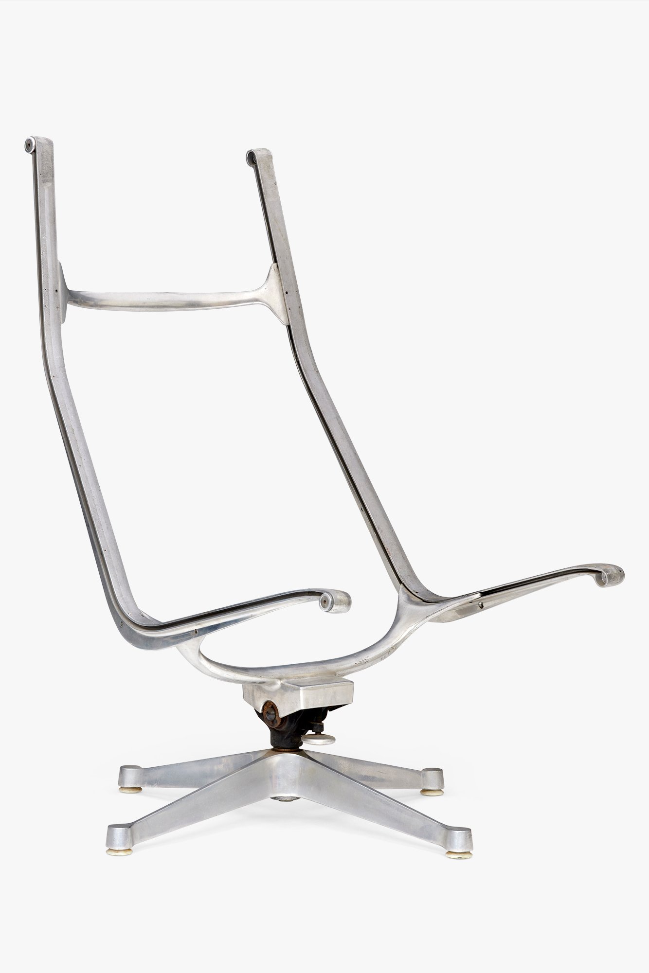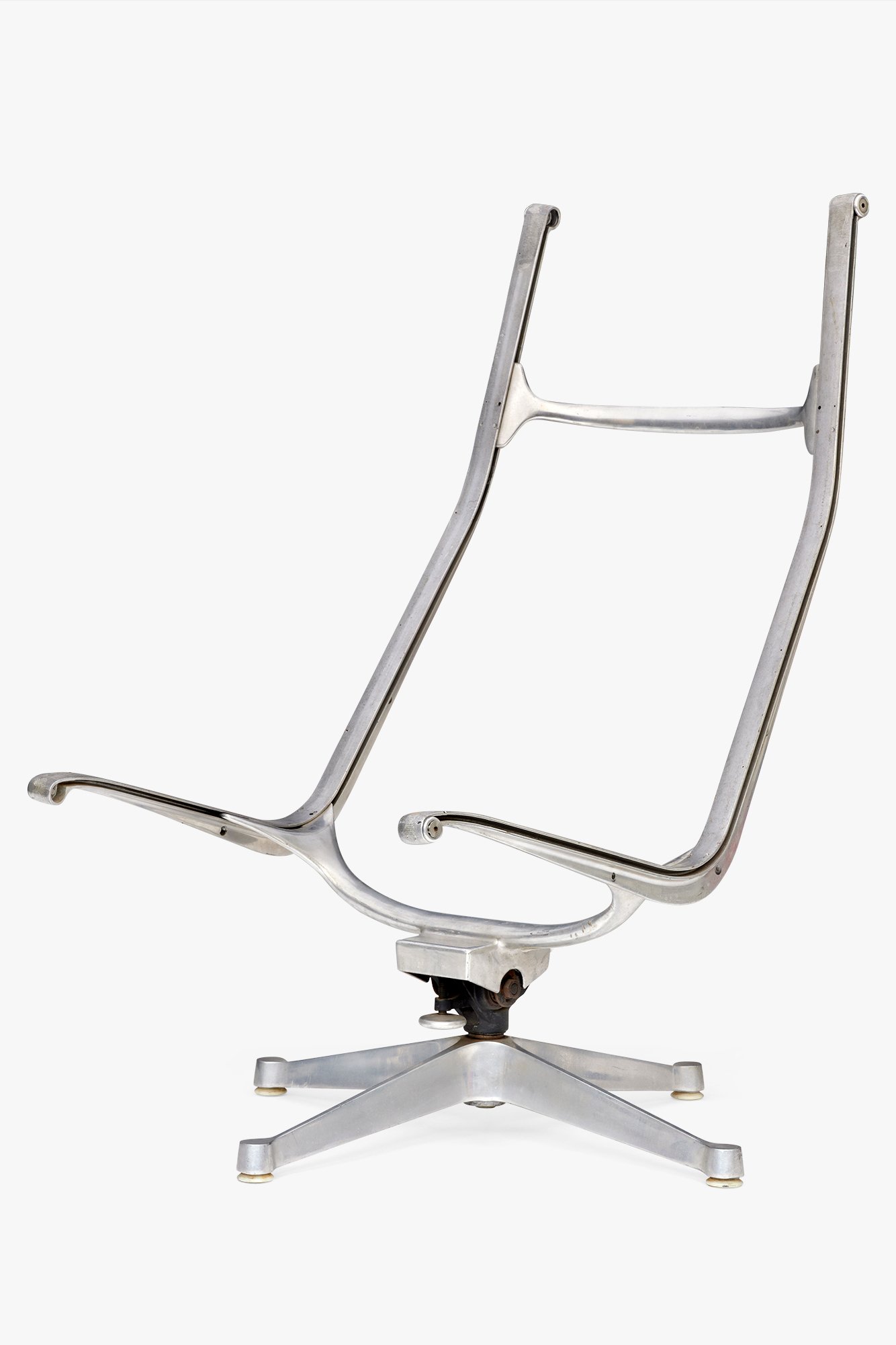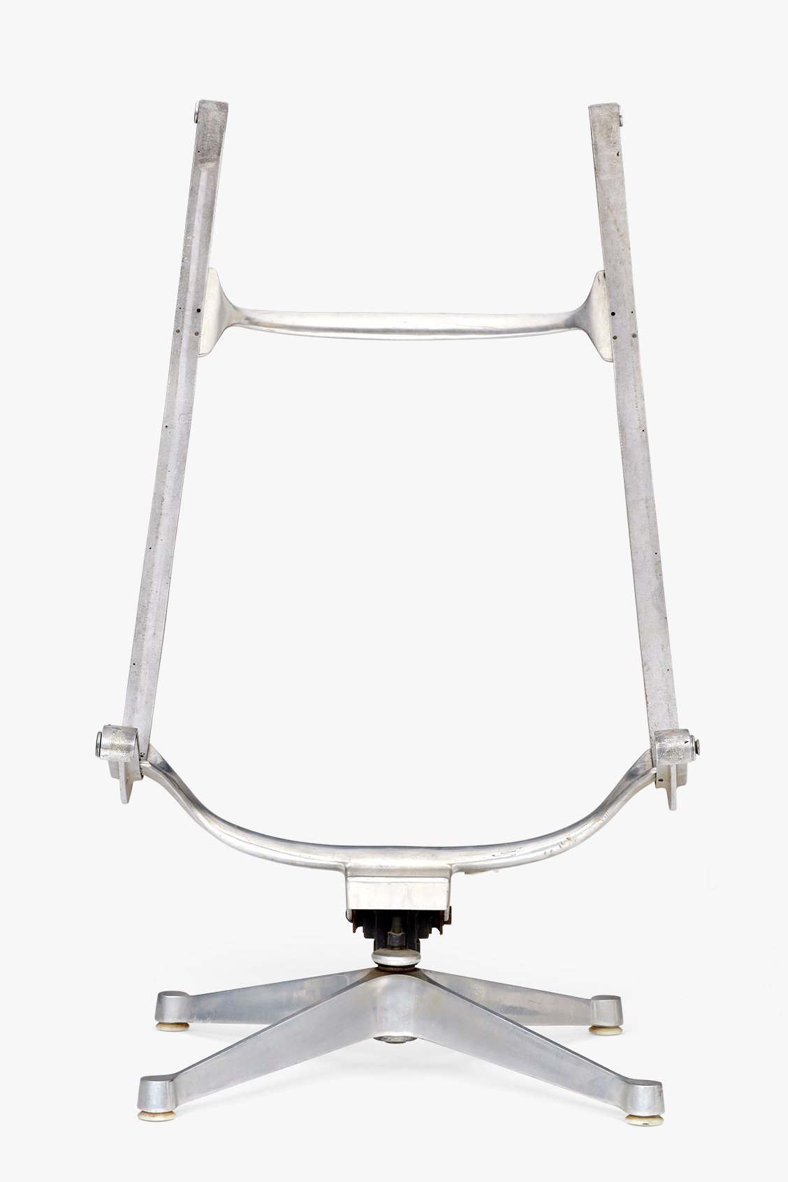 This frame for the model 683 reclining chair appears almost more sculptural than functional. This is fitting considering an observation Charles once made about the casting process, which he described as so open-ended that at times, “you find yourself face to face with sculpture, and it can scare the pants off you.” Regarding the frame as a work of art can also prompt fresh consideration of its structure and form. For instance, without its pad it becomes more apparent that the reclining chair’s two side members end in a subtle curve that produces the illusion of a scroll-like terminus. These kinds of details resulted from the Eameses’ painstaking design process, which was highly responsive to user feedback. They gathered such feedback from multiple sources, including not only their clients but also their staff. As Charles once put it when discussing the EAG chairs, it was “the people that work in the factory with us day by day who would flop down in one at the end of a hard day and from whom we would really get our feedback, our clues.”