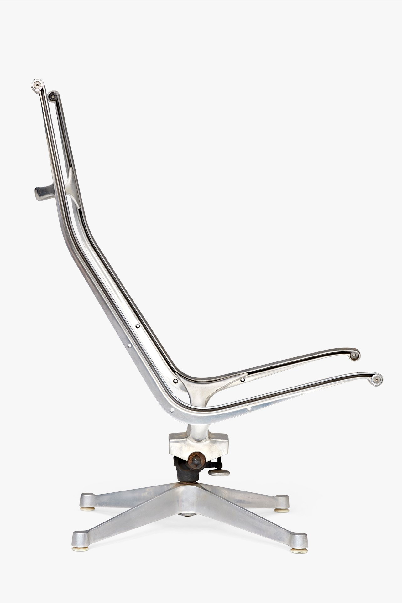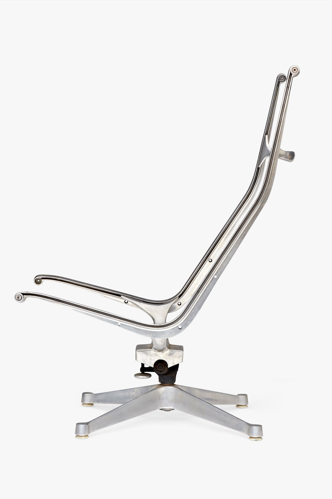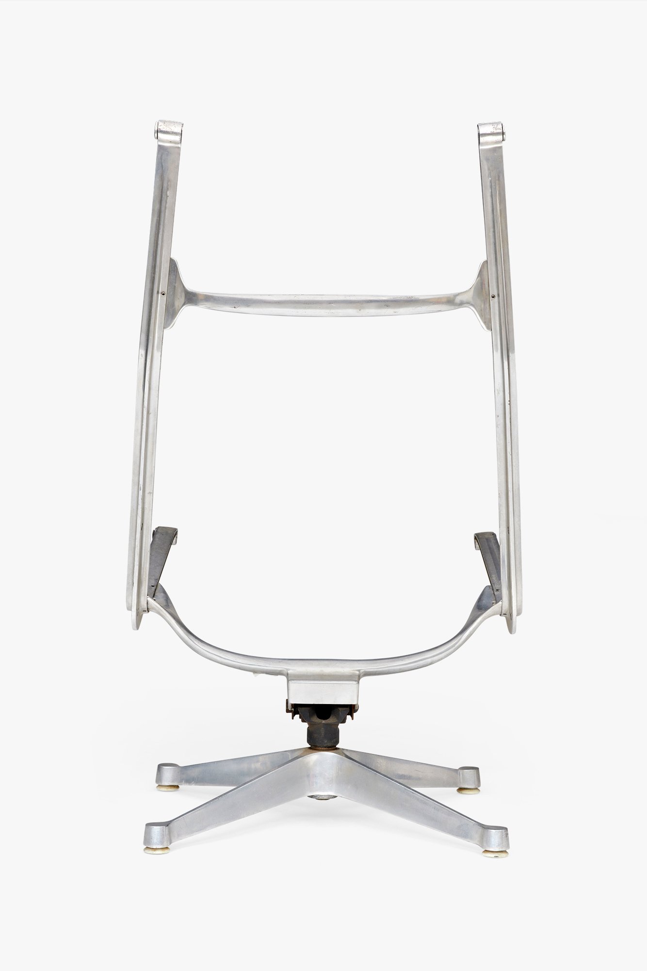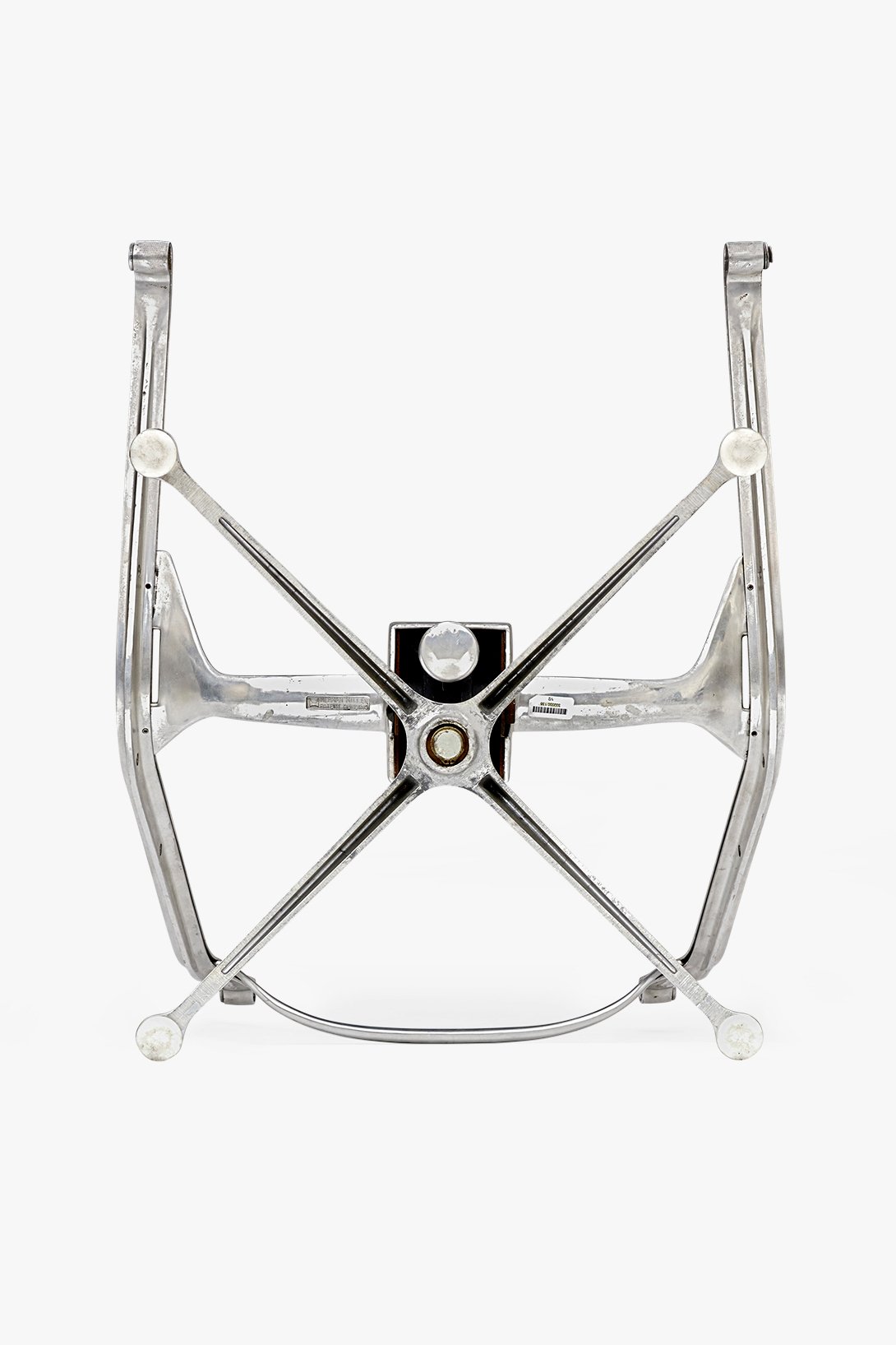 This frame for the model 683 reclining chair appears almost more sculptural than functional. This is fitting considering an observation Charles once made about the casting process, which he described as so open-ended that at times, “you find yourself face to face with sculpture, and it can scare the pants off you.” Regarding the frame as a work of art can also prompt fresh consideration of its structure and form. For instance, without its pad it becomes more apparent that the reclining chair’s two side members end in a subtle curve that produces the illusion of a scroll-like terminus. These kinds of details resulted from the Eameses’ painstaking design process, which was highly responsive to user feedback. They gathered such feedback from multiple sources, including not only their clients but also their staff. As Charles once put it when discussing the EAG chairs, it was “the people that work in the factory with us day by day who would flop down in one at the end of a hard day and from whom we would really get our feedback, our clues.”
