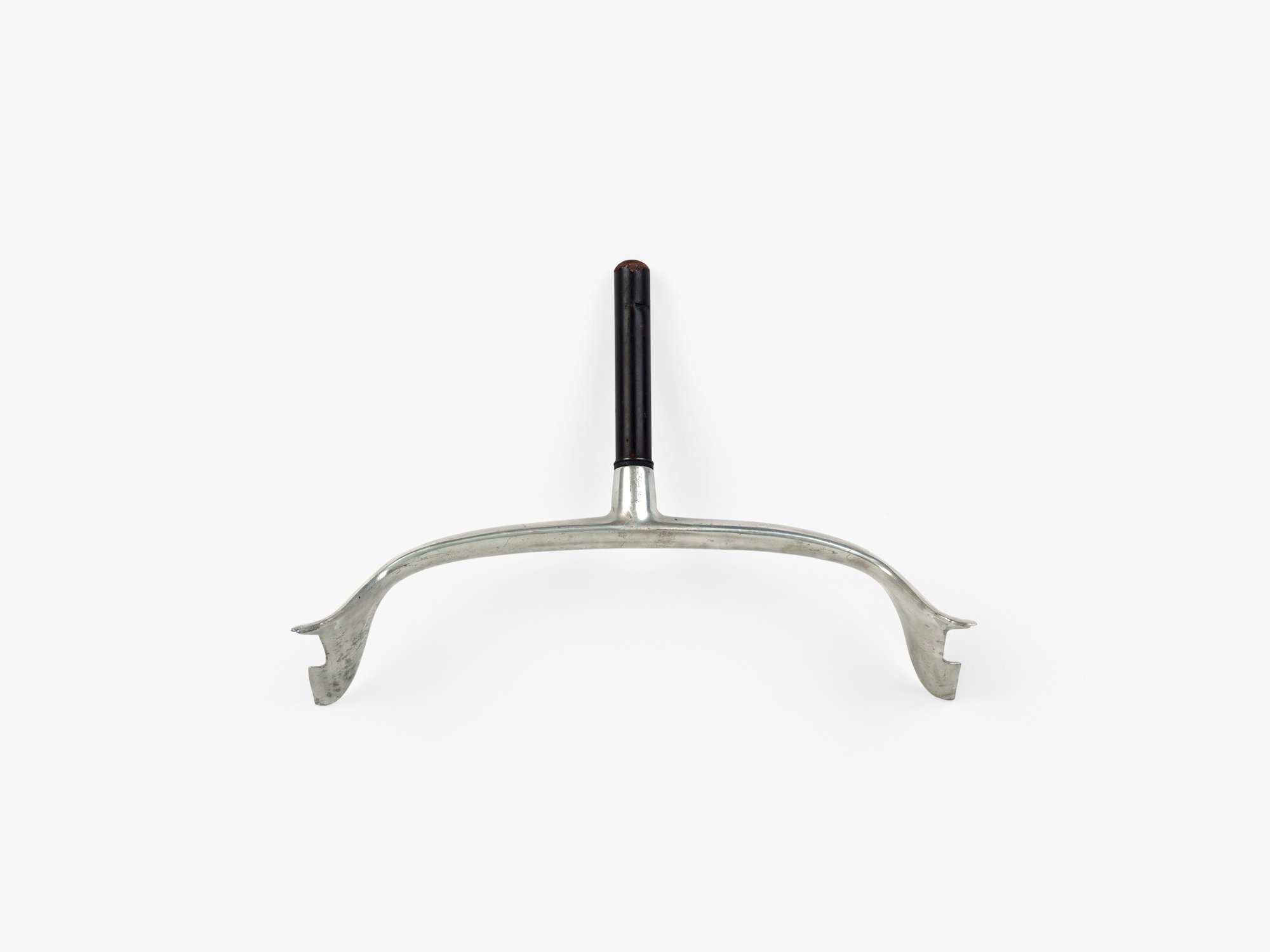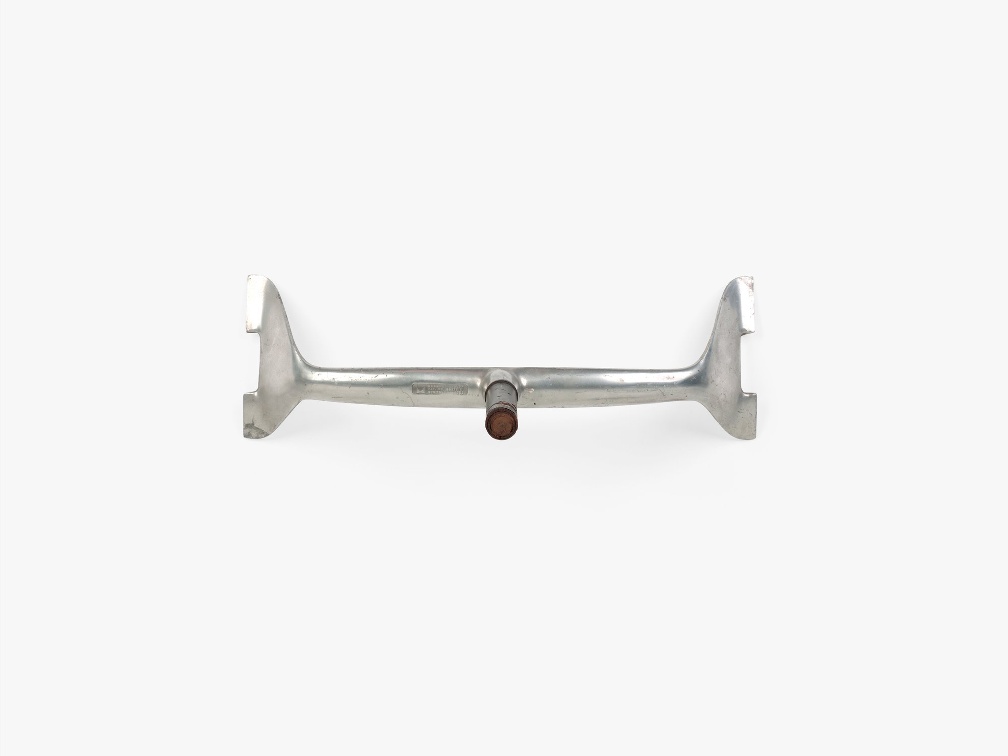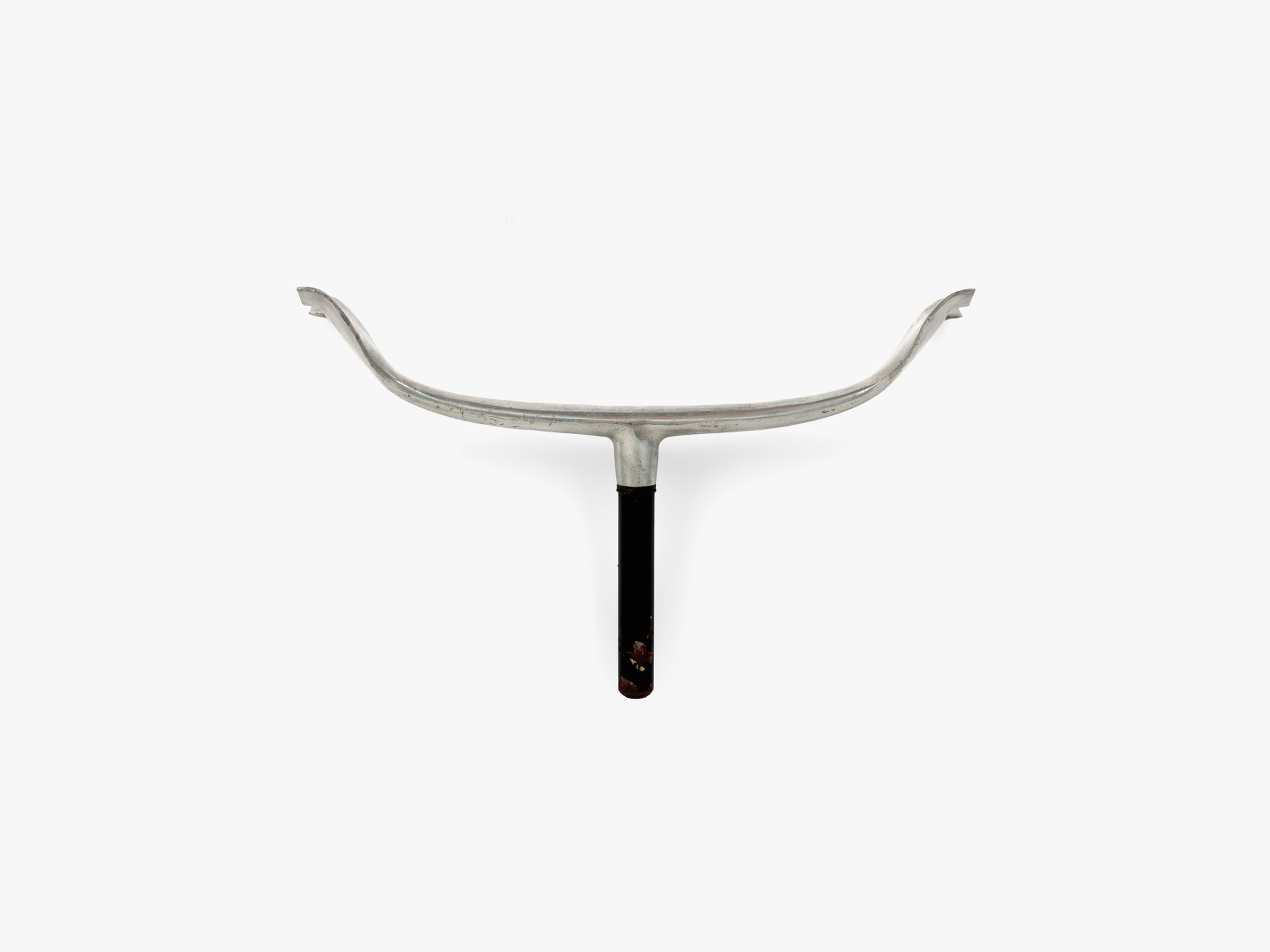 A key conceptual feature of the Eames Aluminum Group is the pair of aluminum spreaders that hold the upholstery taut between two aluminum side members. These spreaders create the necessary tension for transforming fabric into a supportive seat and backrest. Dubbed “antlers” by the Eames Office staff thanks to their distinctive shape, one spreader is located midway up the chair’s back and doubles as a handle. The other is located underneath the seat and serves both to stretch the textile and to attach the body of the chair to its base. This prototype highlights the point of connection between the lower spreader and the slender column that would extend down to the four-pronged Eames Contract Base (a design used for this collection as well as for other Eames designs). The column is a hollow tube made of rolled steel, and is very sturdy. The underside of the antler is stamped with a patent number and Herman Miller’s trademarked name and logo.