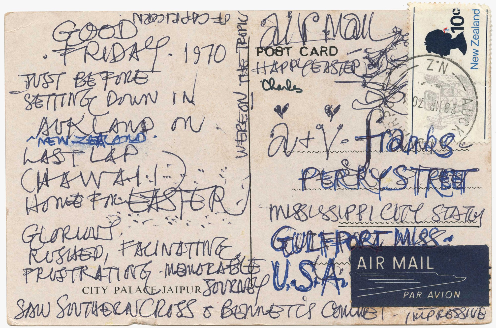 As evidenced by this postcard sent by Ray Eames to her sister- and brother-in-law, she and Charles traveled to India in 1970—one of many trips where their attention was largely focused on developments with the National Institute of Design in Ahmedabad, located in the western state of Gujarat, but also allowed for travel to other destinations such as the city of Jaipur pictured here. Ray notes that the experience had been a “glorious, rushed, facinating [sic], frustrating, memorable journey.” Although the postcard was purchased in India, it is postmarked from Auckland, New Zealand, a penultimate stopover before returning to Los Angeles via Hawaii.