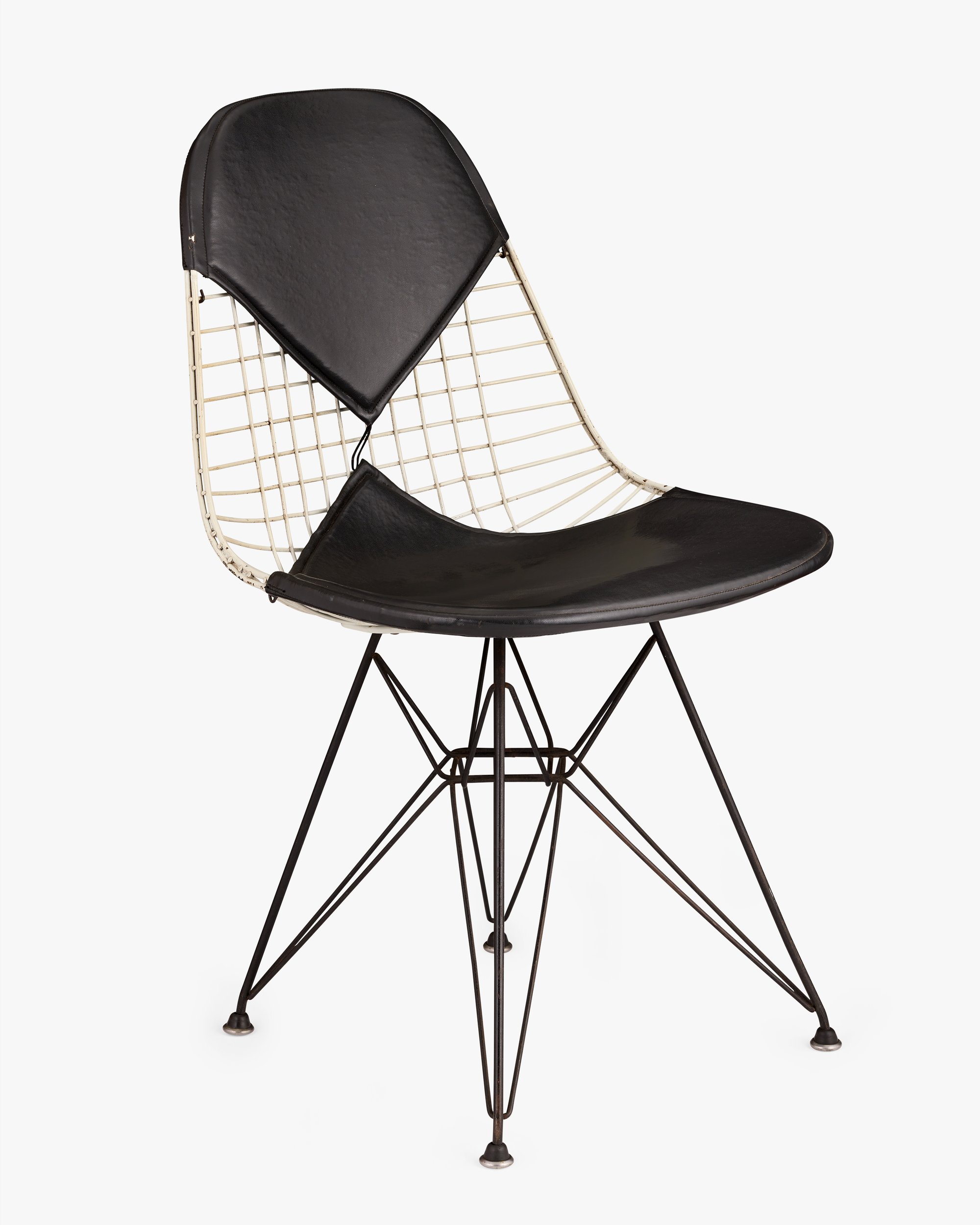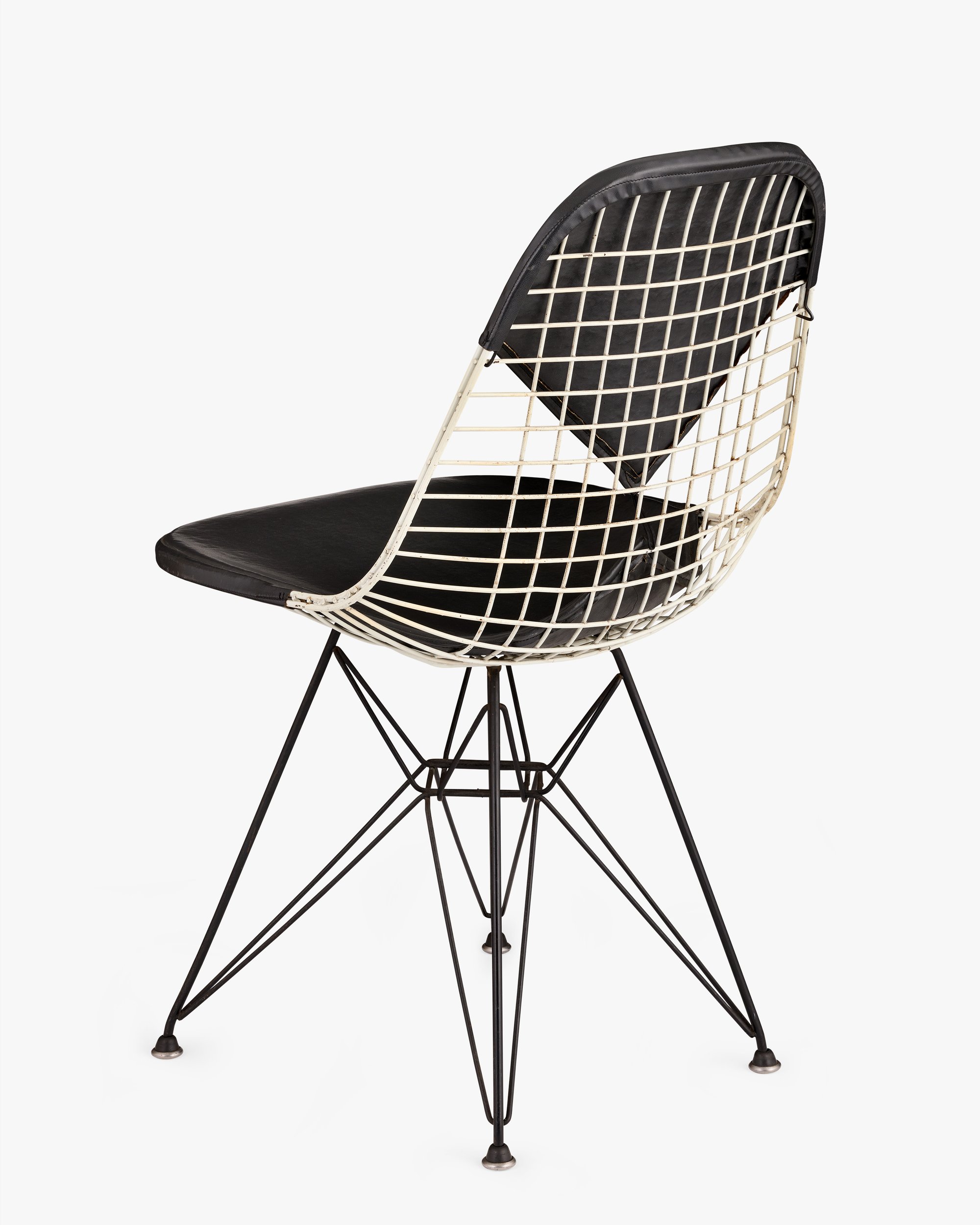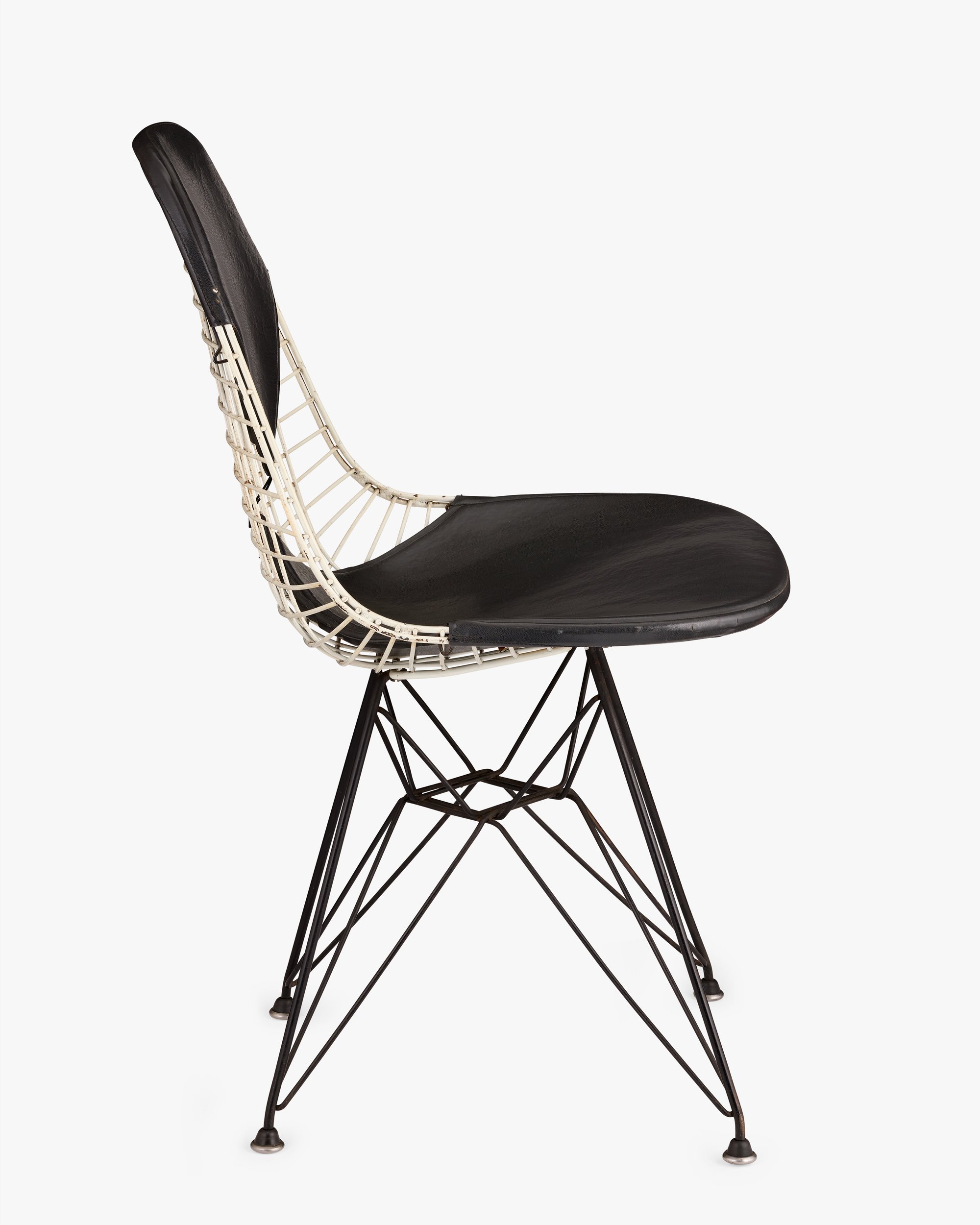 This is an Upholstered Eames Wire Chair with the two-piece pad that has come to be known as the “Bikini Pad” and a steel rod base, which enthusiasts now refer to as the “Eiffel Tower Base.” Ray and Charles were not imitating the Eiffel Tower in designing this base. Rather, they discovered that they could make a four-legged chair base with the best strength-weight ratio by bending and welding the steel rods. This base is lighter by two pounds than the DKX four-legged base. DKR-2 stands for Dining (height) K-wire (chair) Rod (base) 2 (2-piece upholstered pad).
