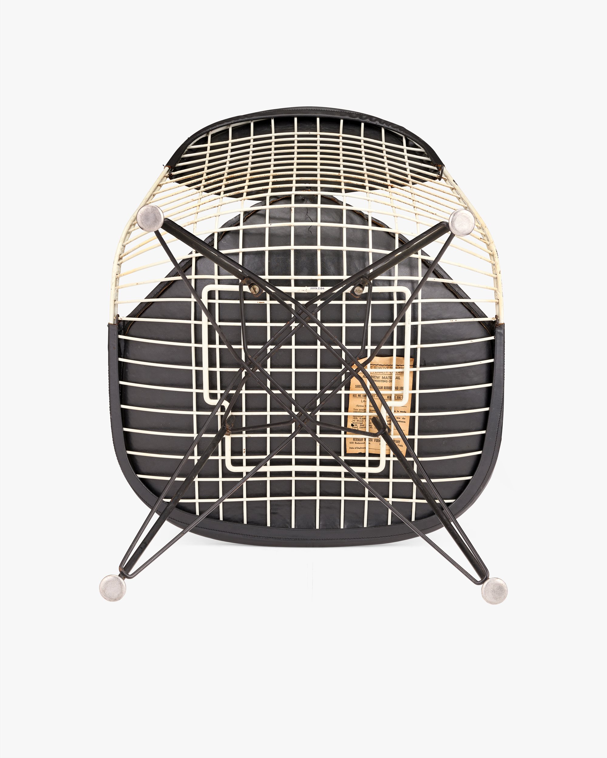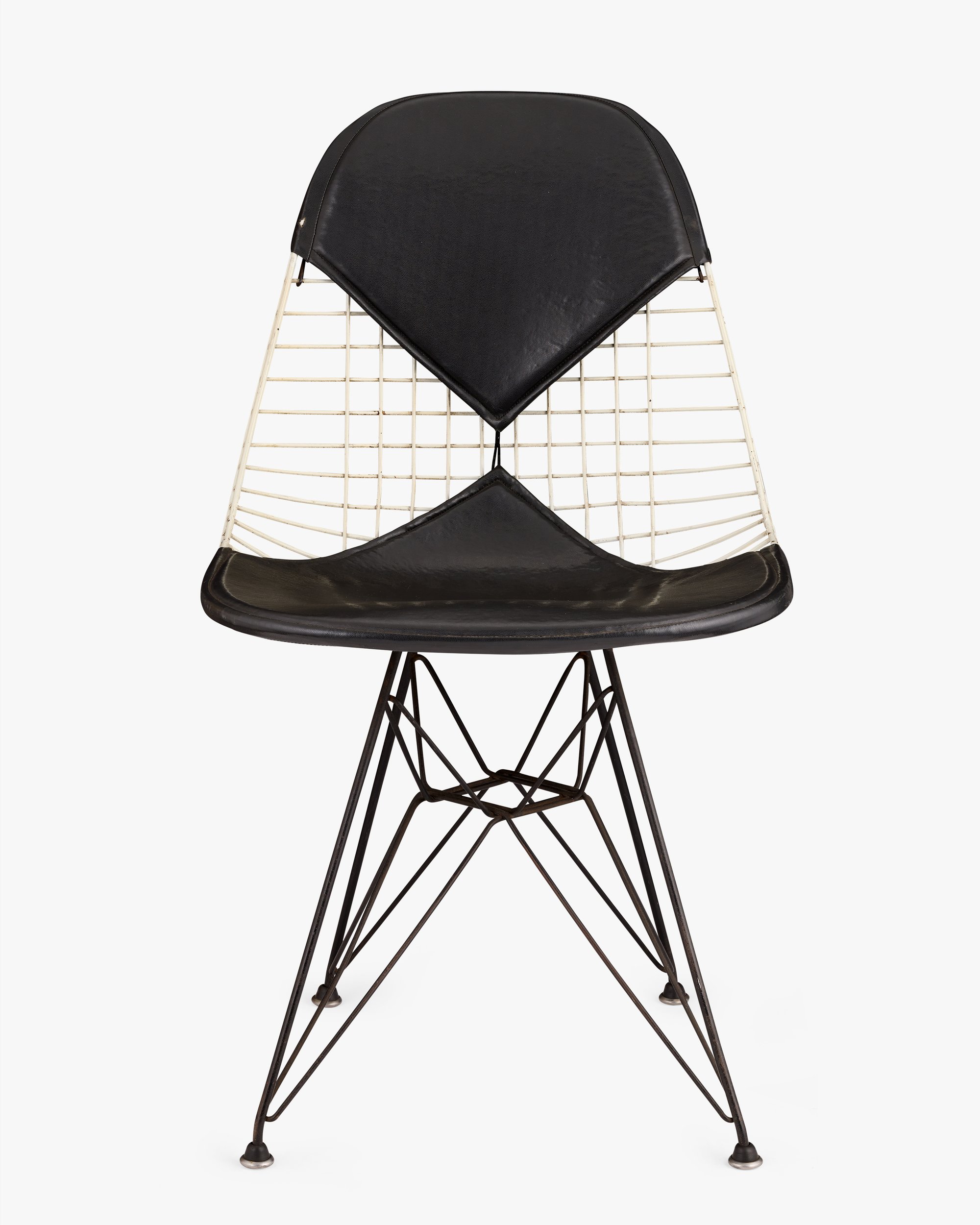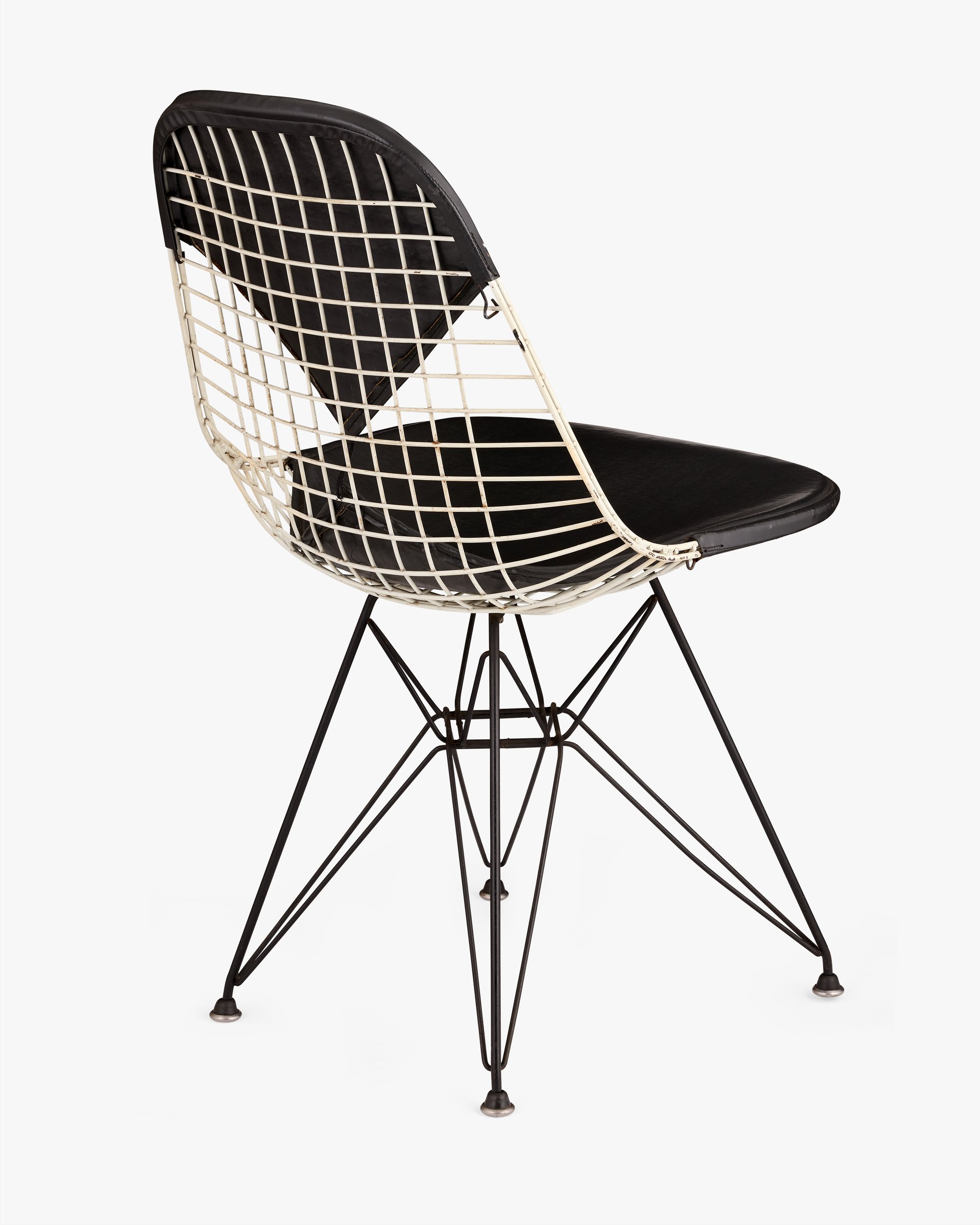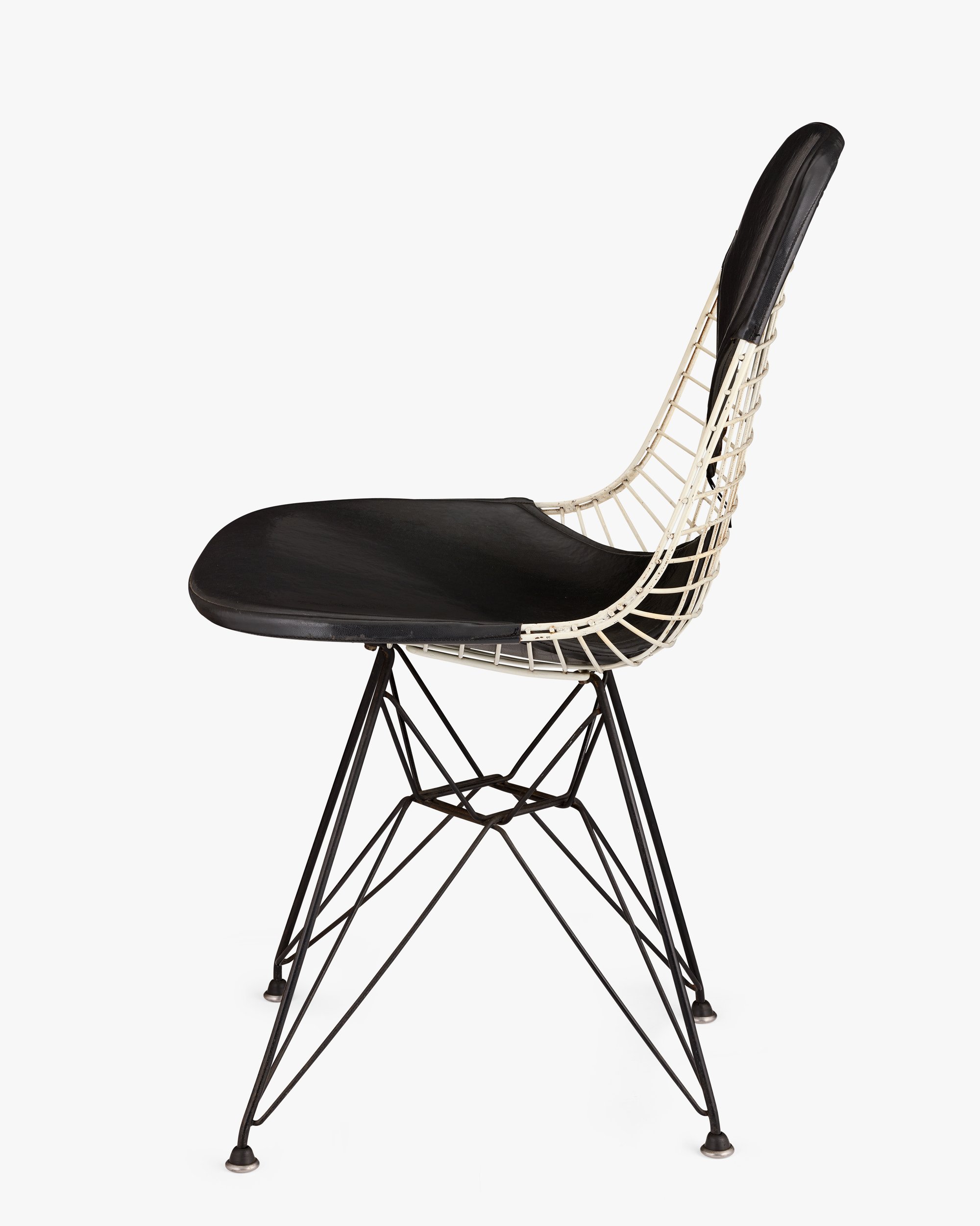 This is an Upholstered Eames Wire Chair with the two-piece pad that has come to be known as the “Bikini Pad” and a steel rod base, which enthusiasts now refer to as the “Eiffel Tower Base.” Ray and Charles were not imitating the Eiffel Tower in designing this base. Rather, they discovered that they could make a four-legged chair base with the best strength-weight ratio by bending and welding the steel rods. This base is lighter by two pounds than the DKX four-legged base. DKR-2 stands for Dining (height) K-wire (chair) Rod (base) 2 (2-piece upholstered pad).