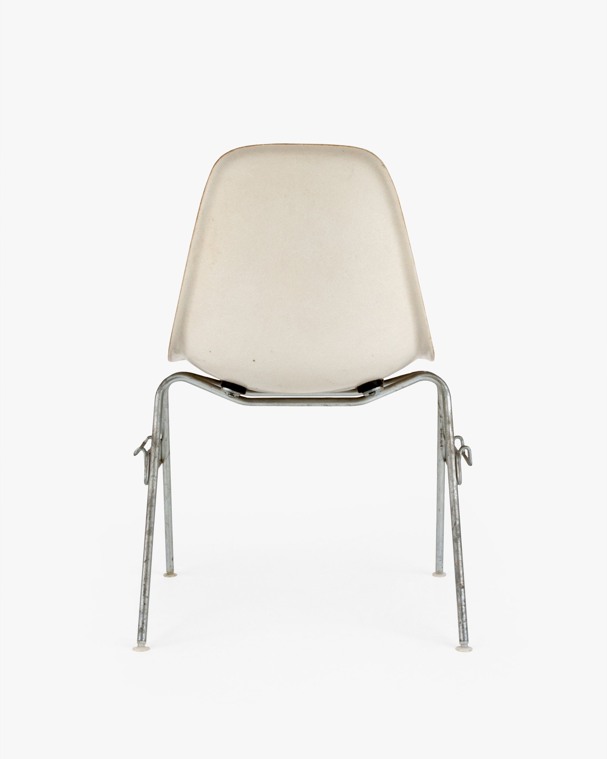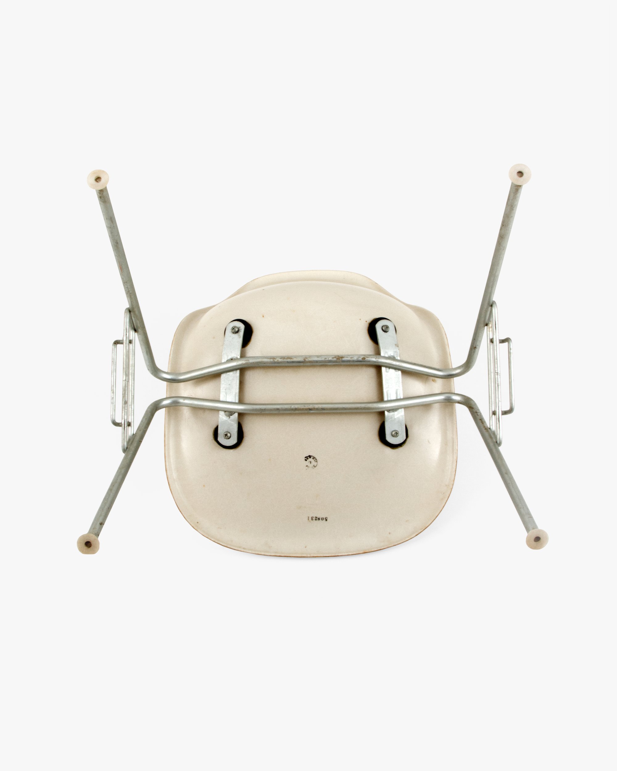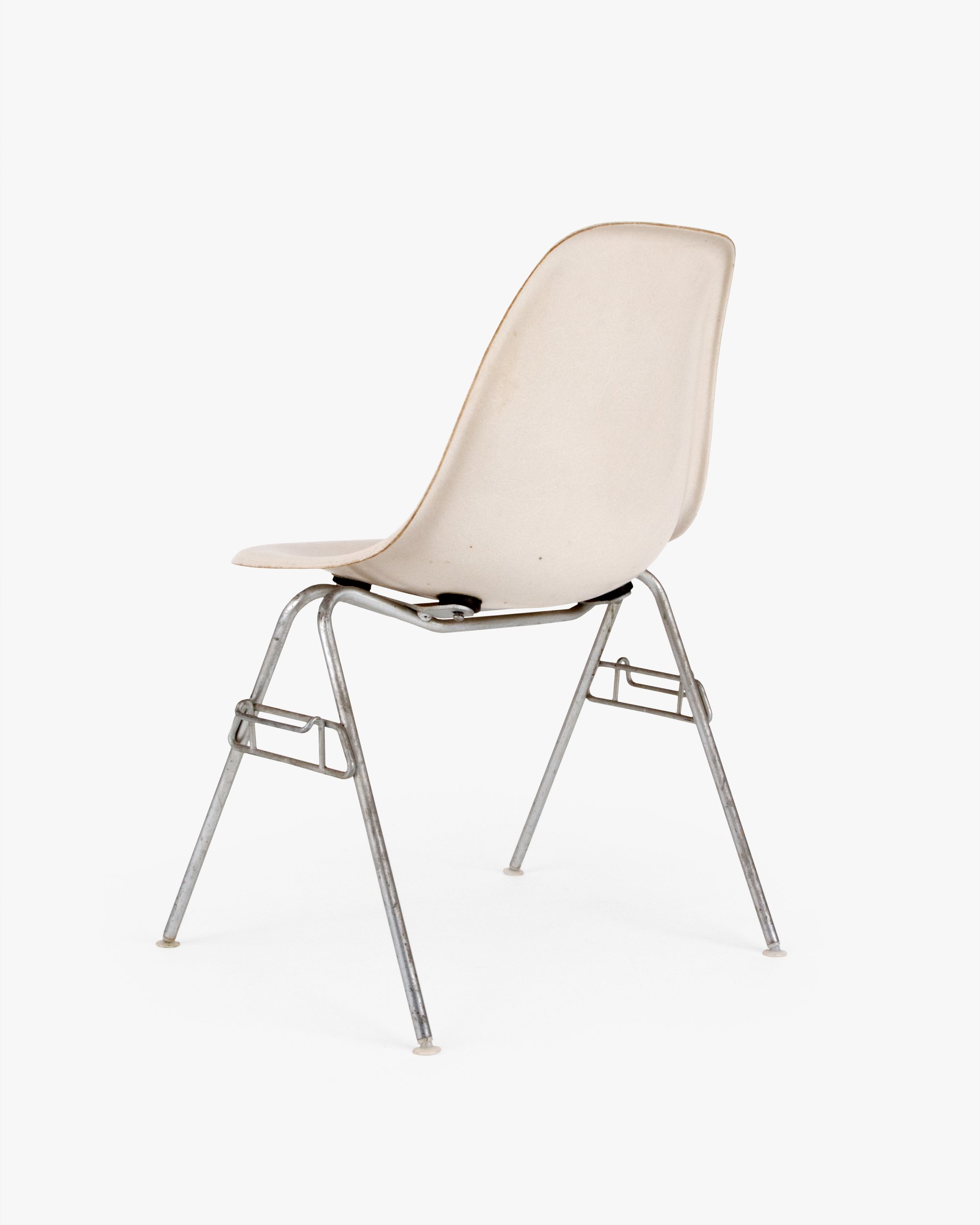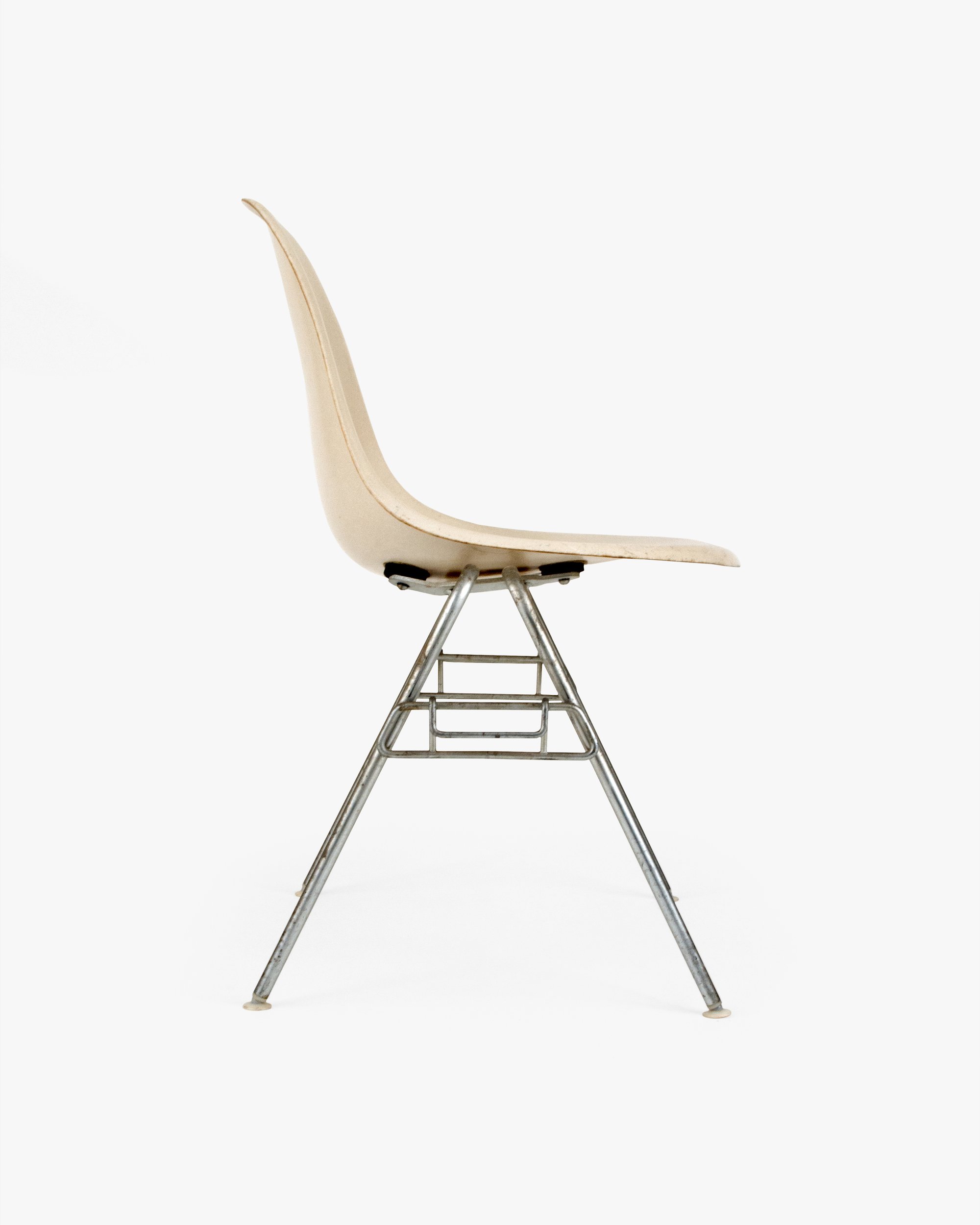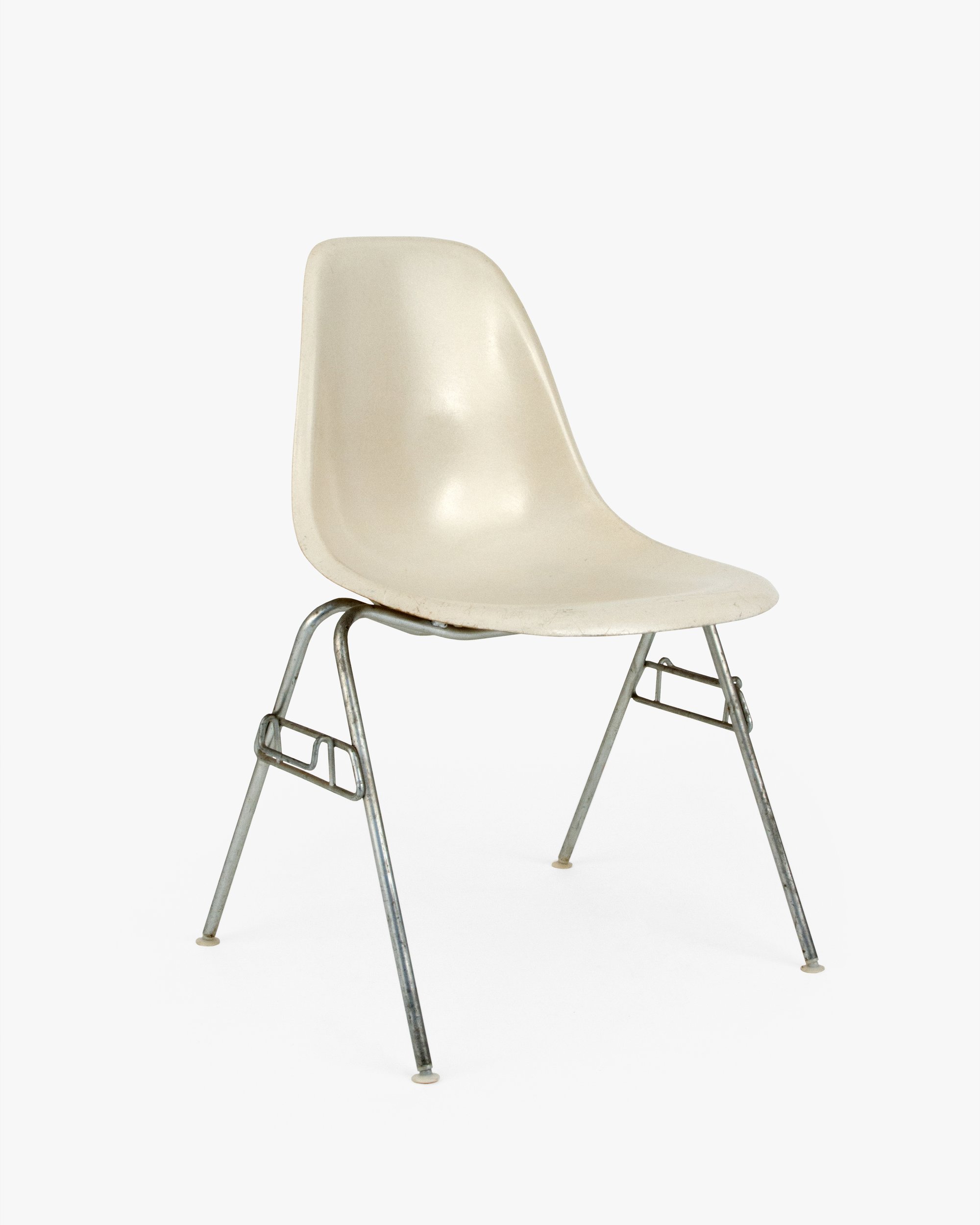 The DSS model was a game changer for Ray and Charles. Herman Miller sold these chairs to schools and auditoriums in the tens of thousands. The innovative base allowed fourteen chairs to stack in the floor space of one, and the ganging feature helped create long, tidy rows of chairs. This base was developed just as the Eameses perfected the thickness and strength of the Side Shell. DSS stands for Dining (height) Side (chair) Stacking (base).