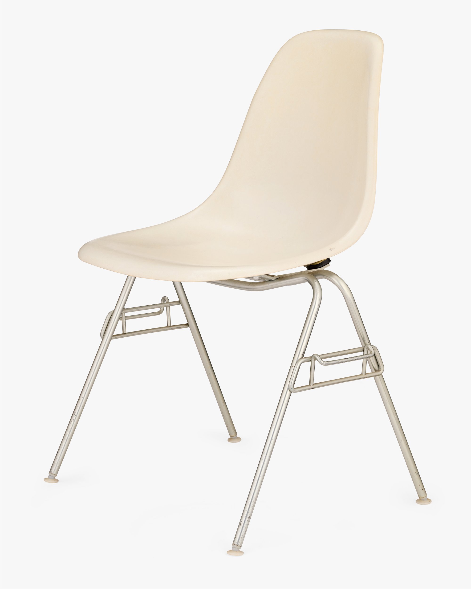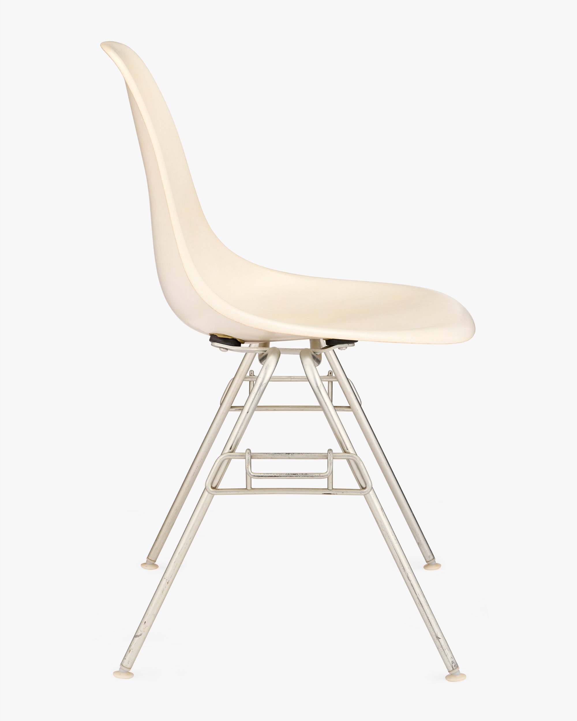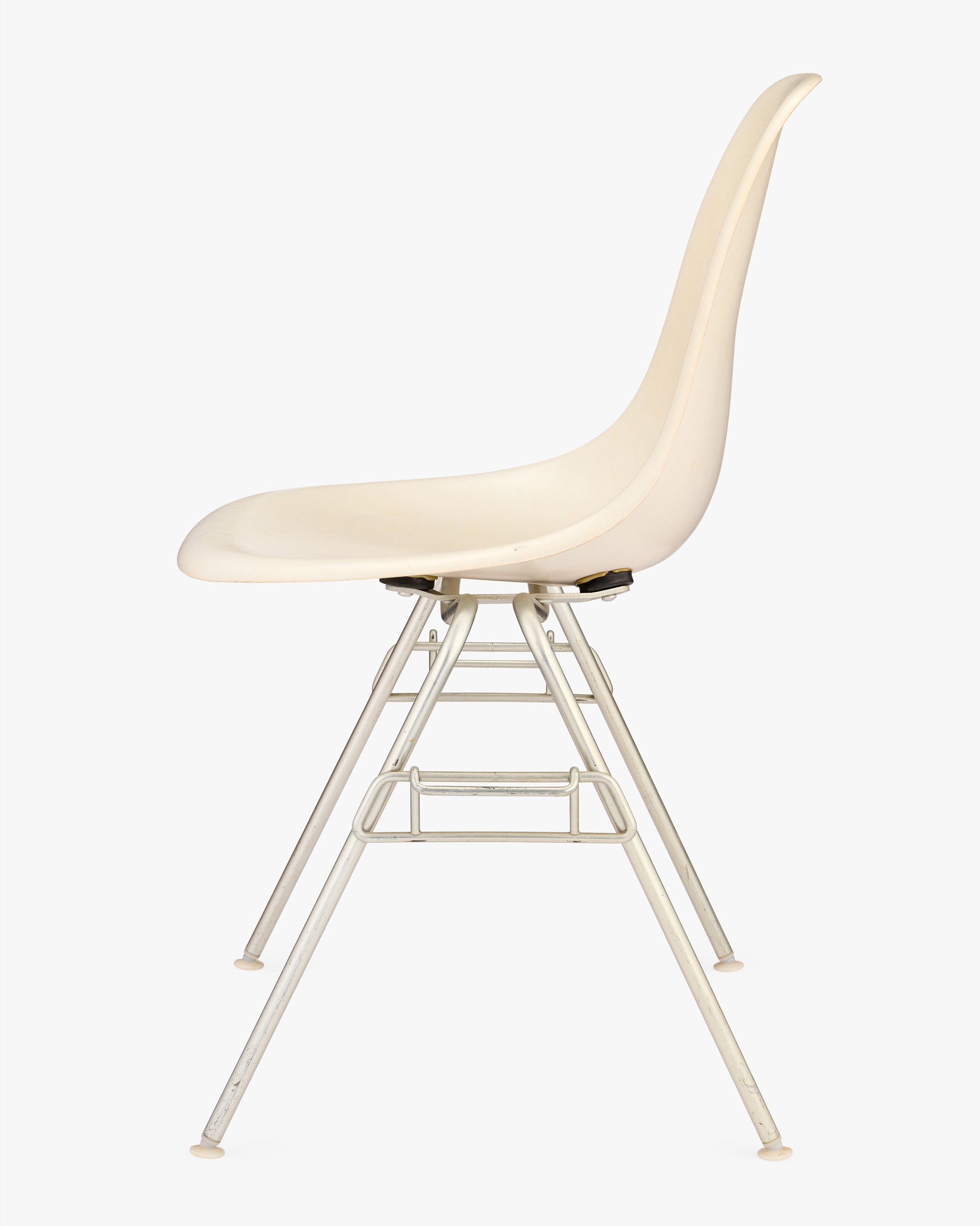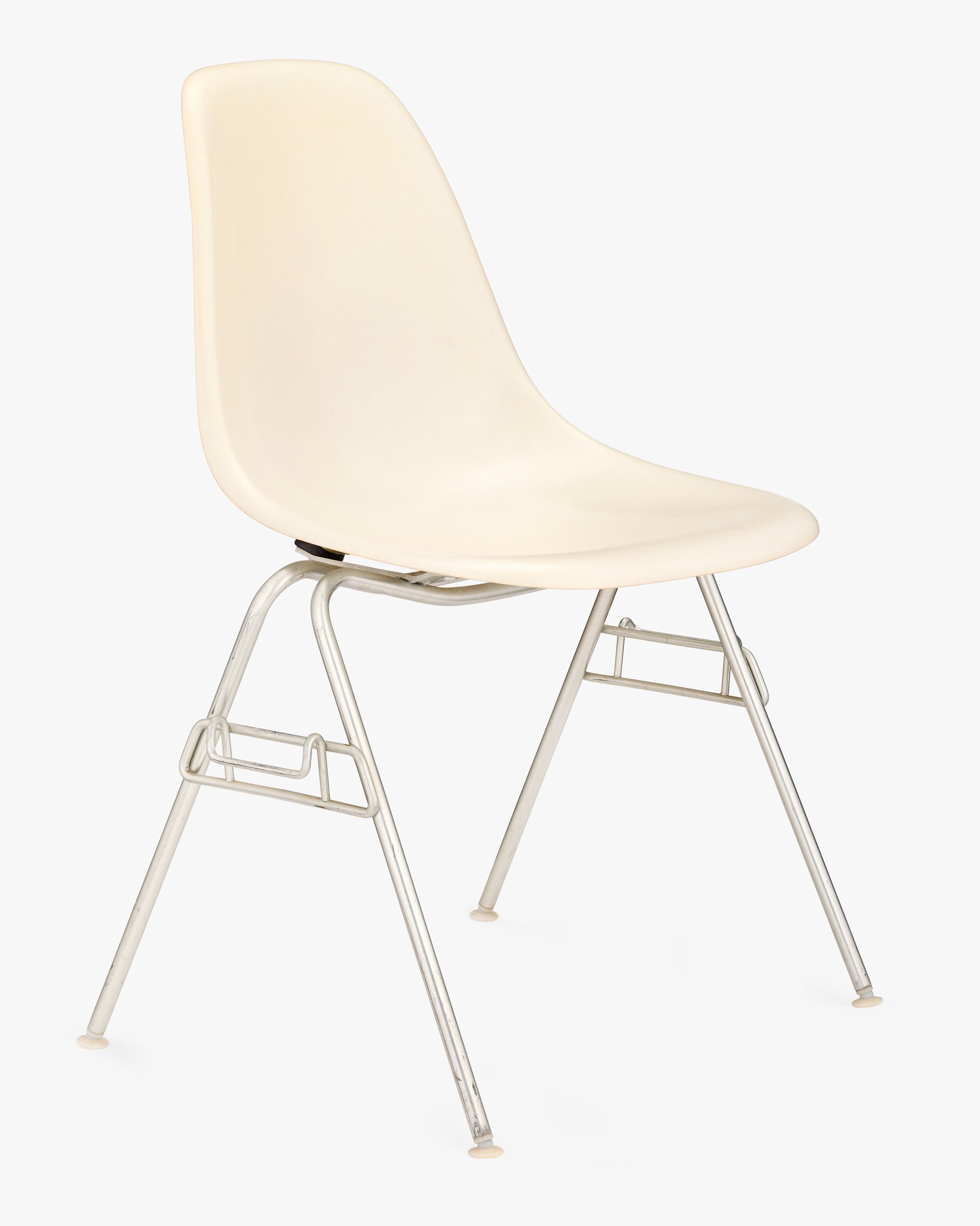 The DSS model was a game changer for Ray and Charles. Herman Miller sold these chairs to schools and auditoriums in the tens of thousands. The innovative base allowed fourteen chairs to stack in the floor space of one, and the ganging feature helped create long, tidy rows of chairs. This base was developed just as the Eameses perfected the thickness and strength of the Side Shell. DSS stands for Dining (height) Side (chair) Stacking (base).