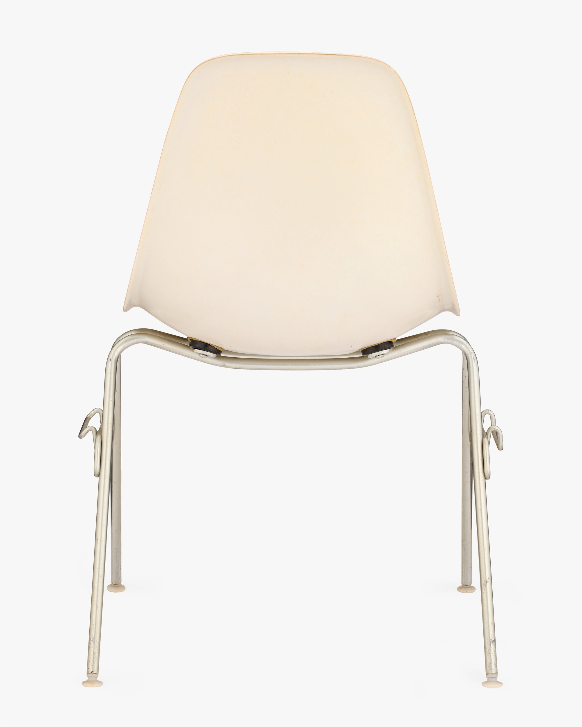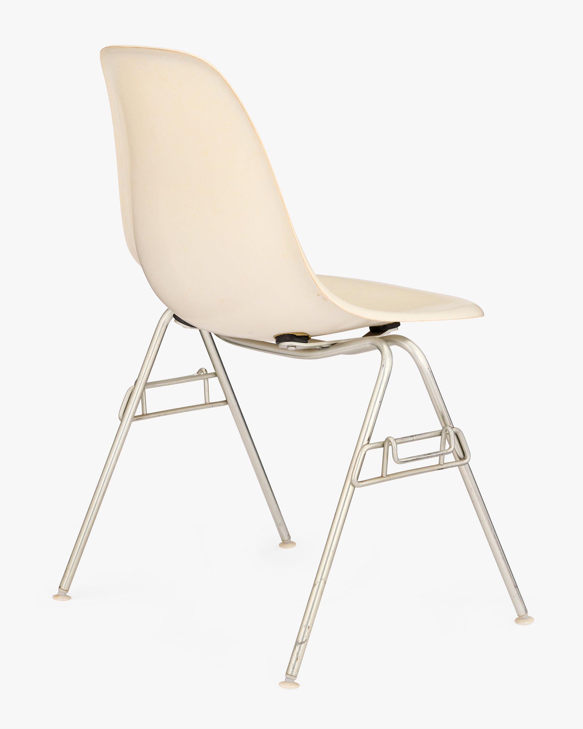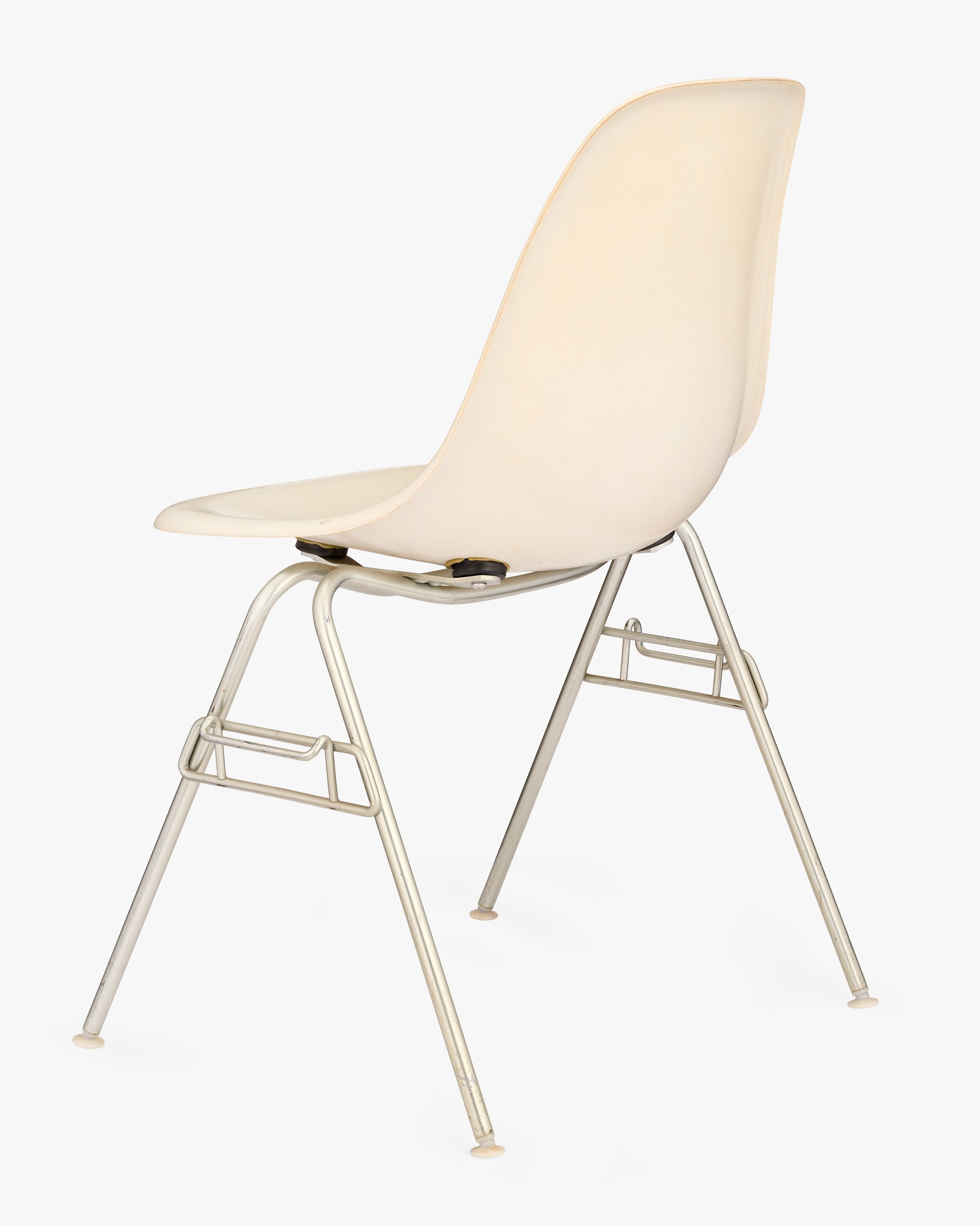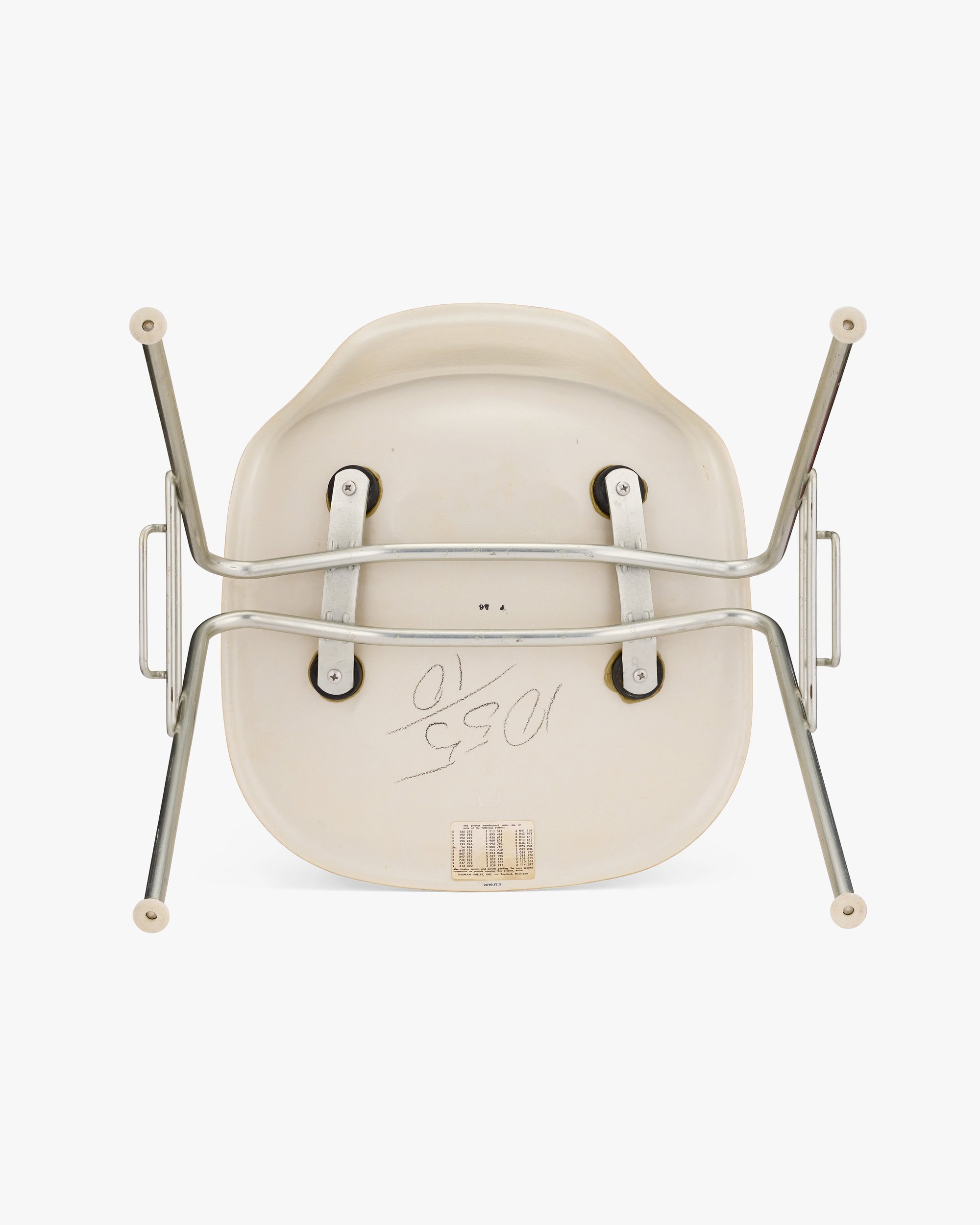The DSS model was a game changer for Ray and Charles. Herman Miller sold these chairs to schools and auditoriums in the tens of thousands. The innovative base allowed fourteen chairs to stack in the floor space of one, and the ganging feature helped create long, tidy rows of chairs. This base was developed just as the Eameses perfected the thickness and strength of the Side Shell. DSS stands for Dining (height) Side (chair) Stacking (base).