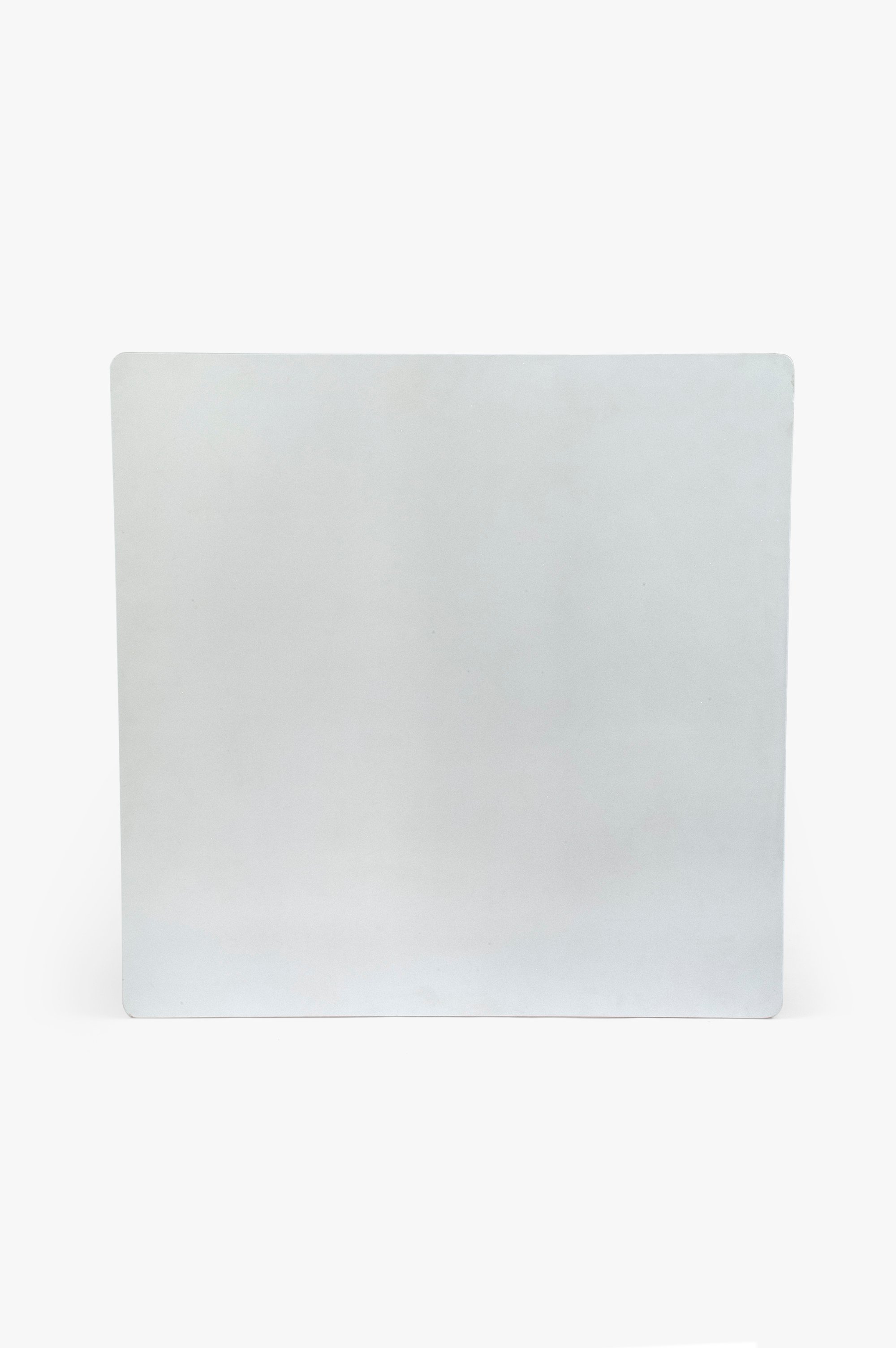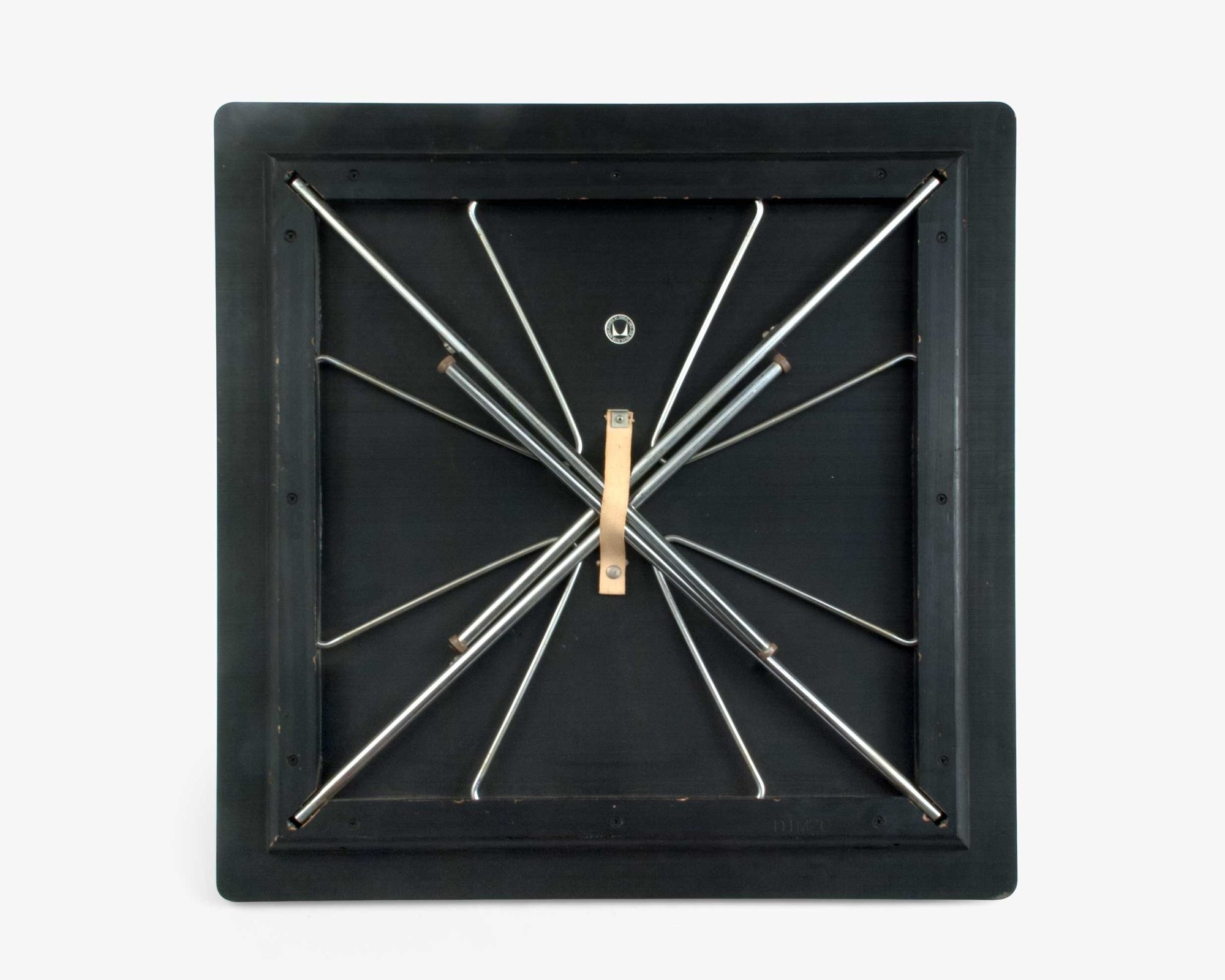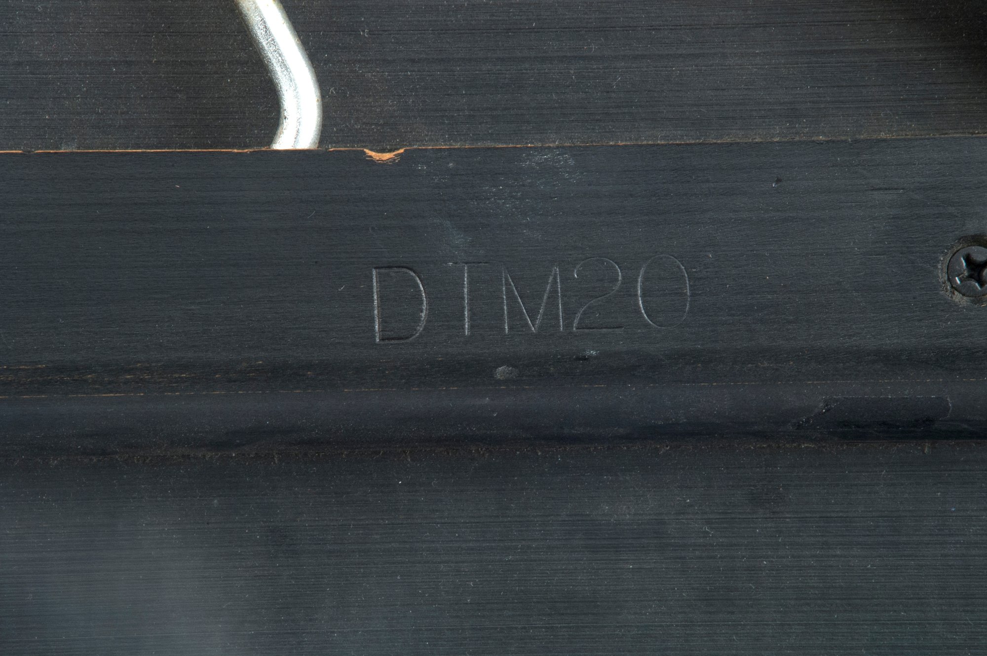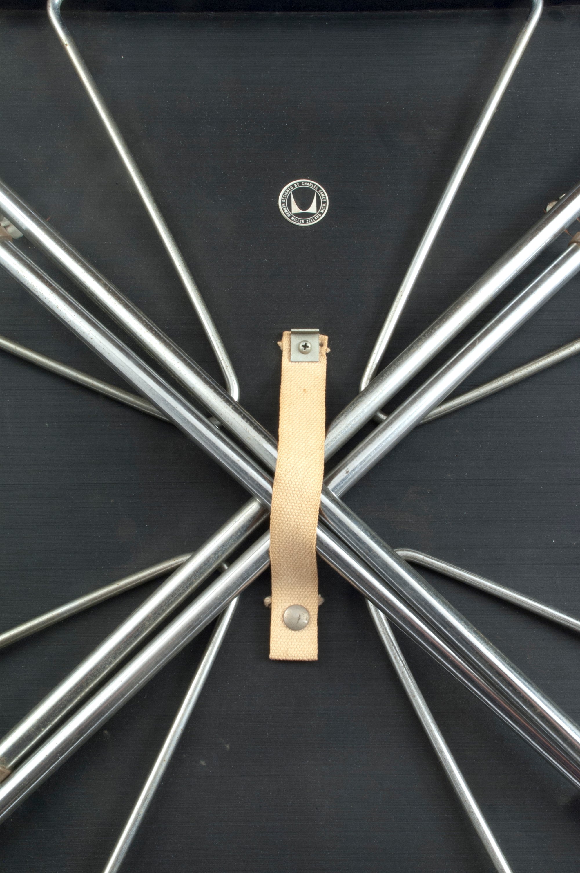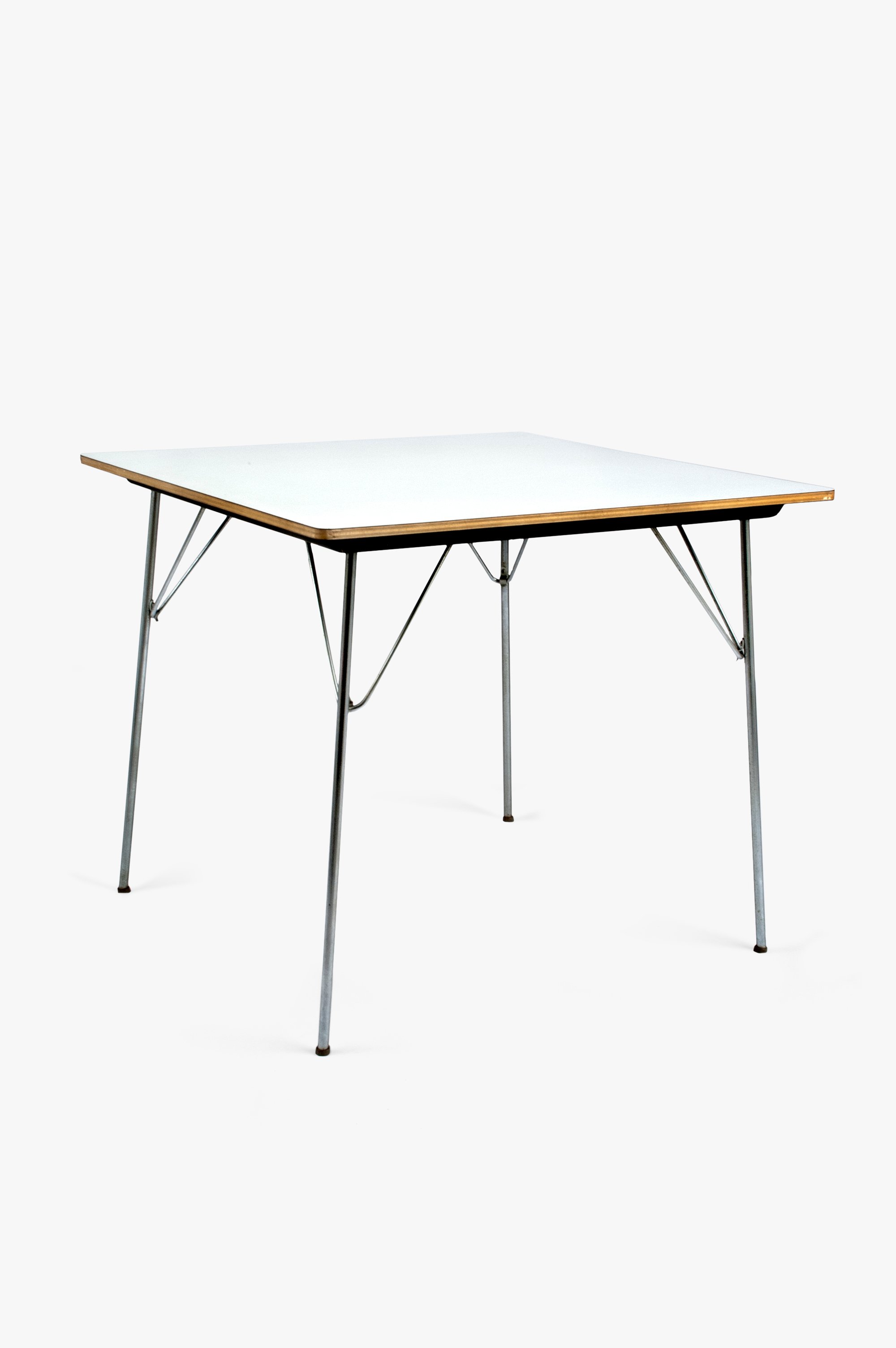 This square table could be used as a stand-alone card table or set up as an extension at the end of the larger DTM-1 dining table. The design’s steel legs fold into a recess underneath its top, making it easy to move and store. This example has its original canvas straps, which secure the folded legs in place for shipping or storage. Promotional material for the DTMs often included images of the table in its collapsed form; when the legs are folded into the tops’ underside, they create a surprisingly attractive pattern that made for an eye-catching image in catalogs and brochures. This aspect of the series epitomizes the Eameses’ belief that every detail of a design should be resolved in as simple and attractive a manner as possible. This approach is also evident in the mechanism by which the table’s legs are held in place when unfolded: simple bent metal clips and stability brackets.