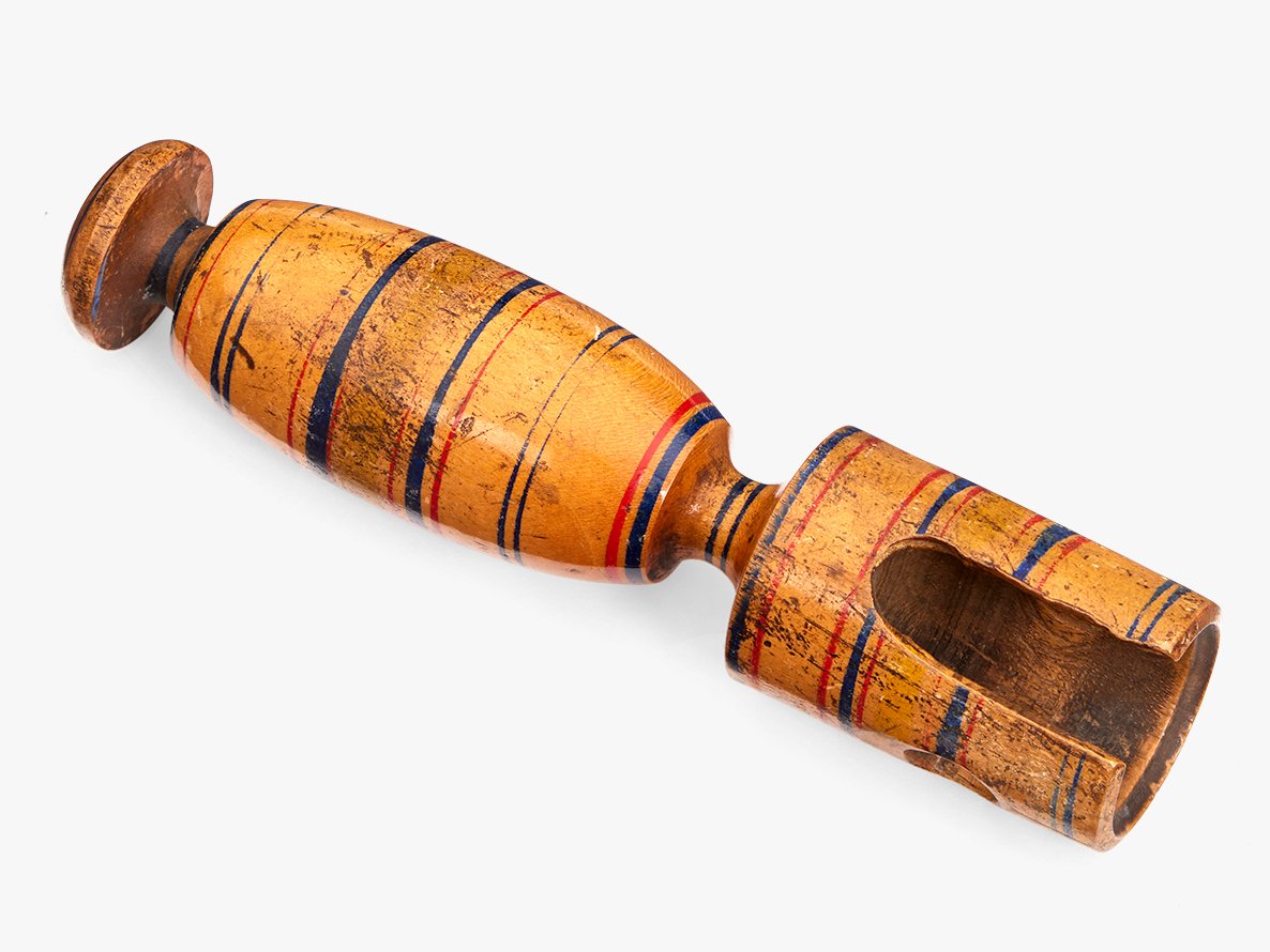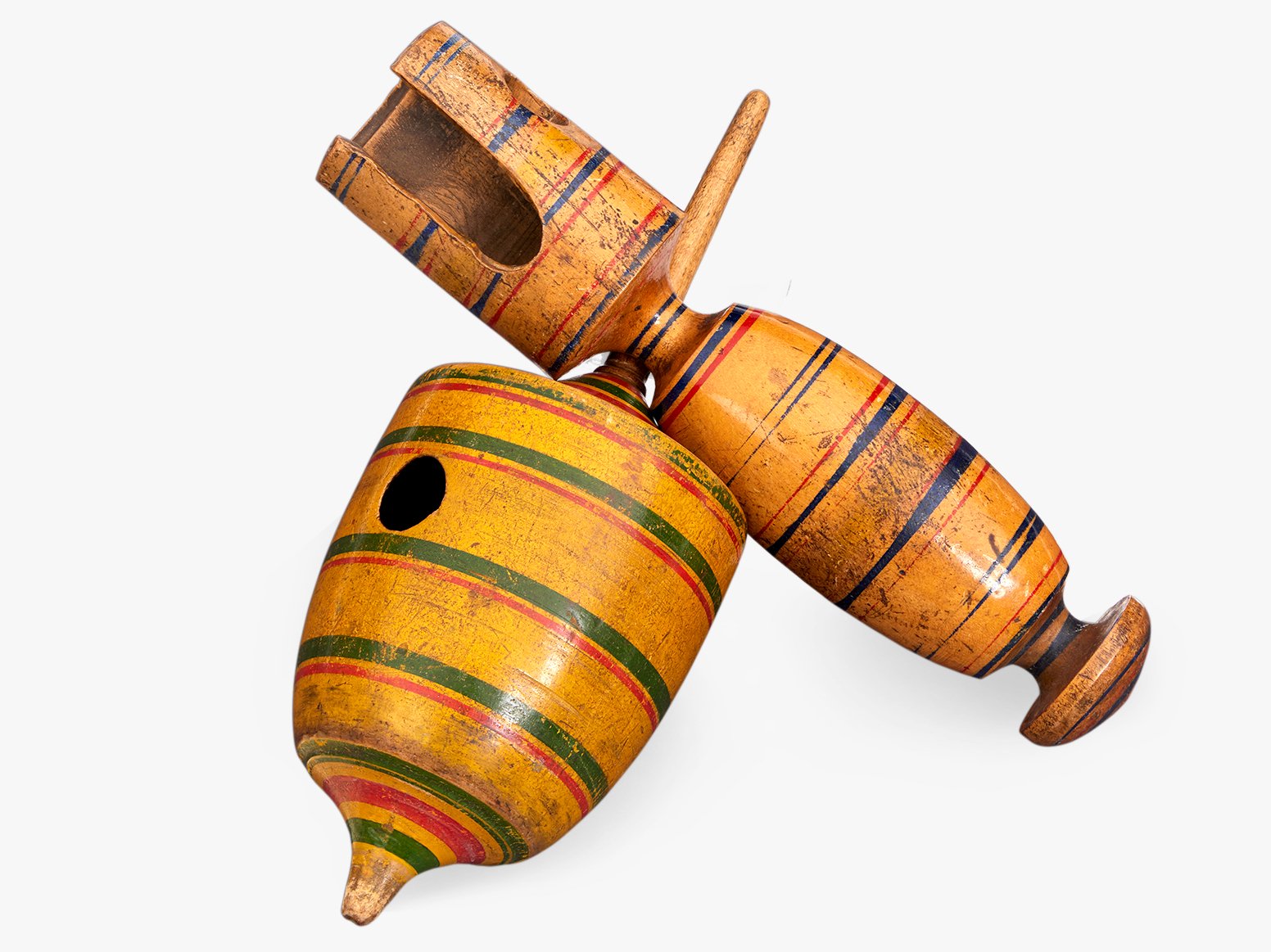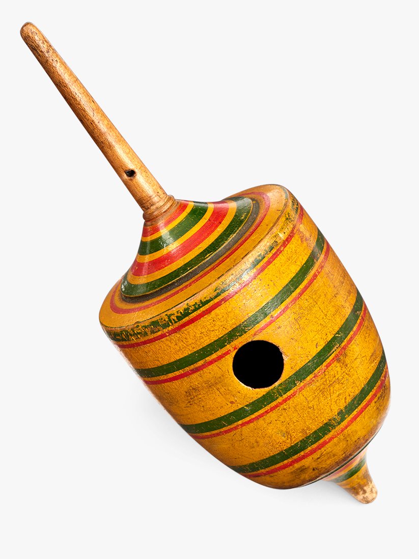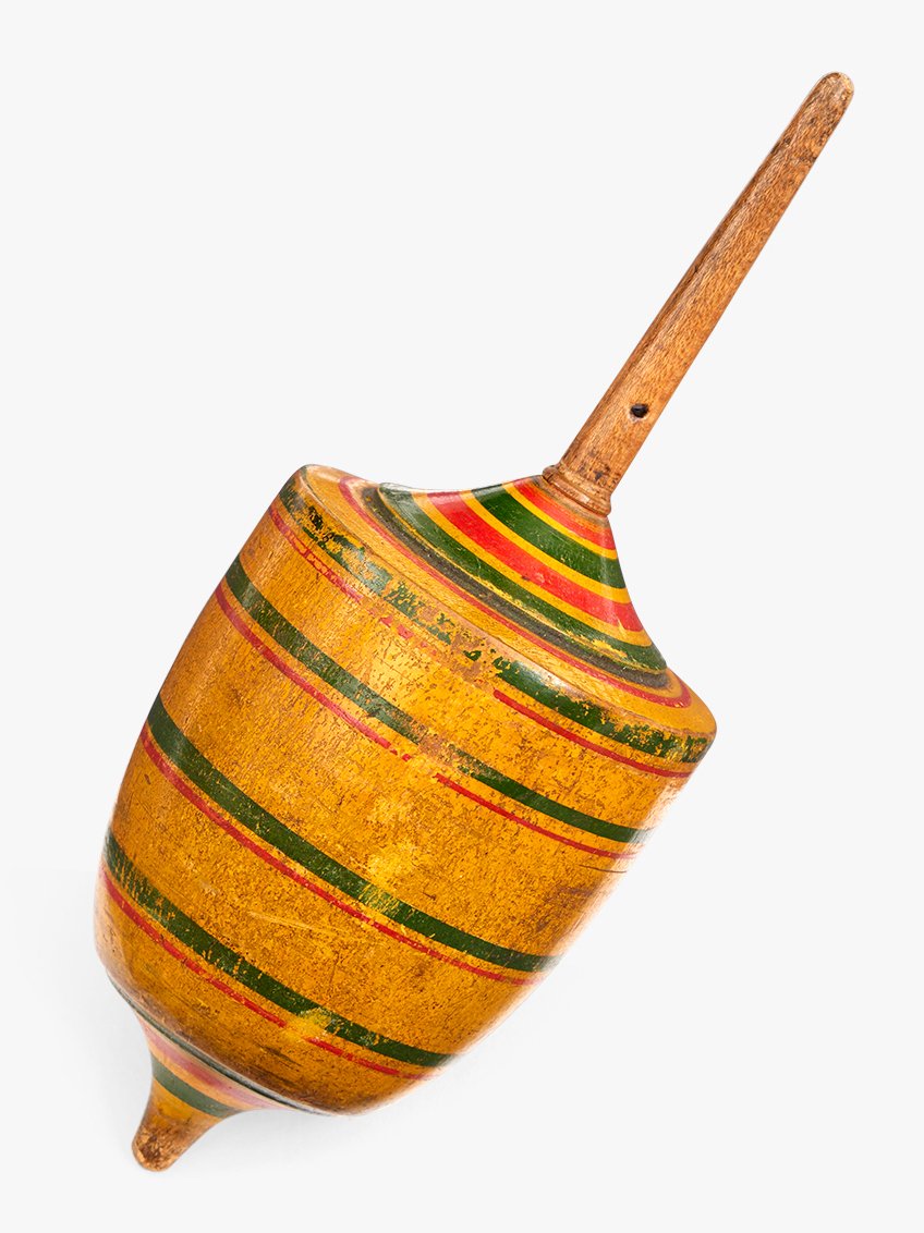 Of all the kinds of toys found in the Eameses’ collection, tops were one of the most numerous, totaling over 100. The majority are made of wood or metal, and they represent a wide range of designs that are powered in various ways. Some are spun with the tug of a coiled string, others use spiral plungers (called augers), and in many cases, a flick of one’s fingers is all that is needed to set them twirling. Ray and Charles amassed their top collection by acquiring examples from countries all over the world, including Mexico, India, Japan, Taiwan, Egypt, Turkey, Lebanon, England, Switzerland, Holland, Germany, France, the Scandinavian nations, and the United States. This example comes from England. It is one of several English painted wood tops included in the collection, and consists of two parts: the top itself and a handle that helps wind and release the toy. To use it, first you insert the top’s stem into the handle and wind a string around the stem, leaving one end extending outward. Then, you quickly yank the end of the string to set the toy in motion.