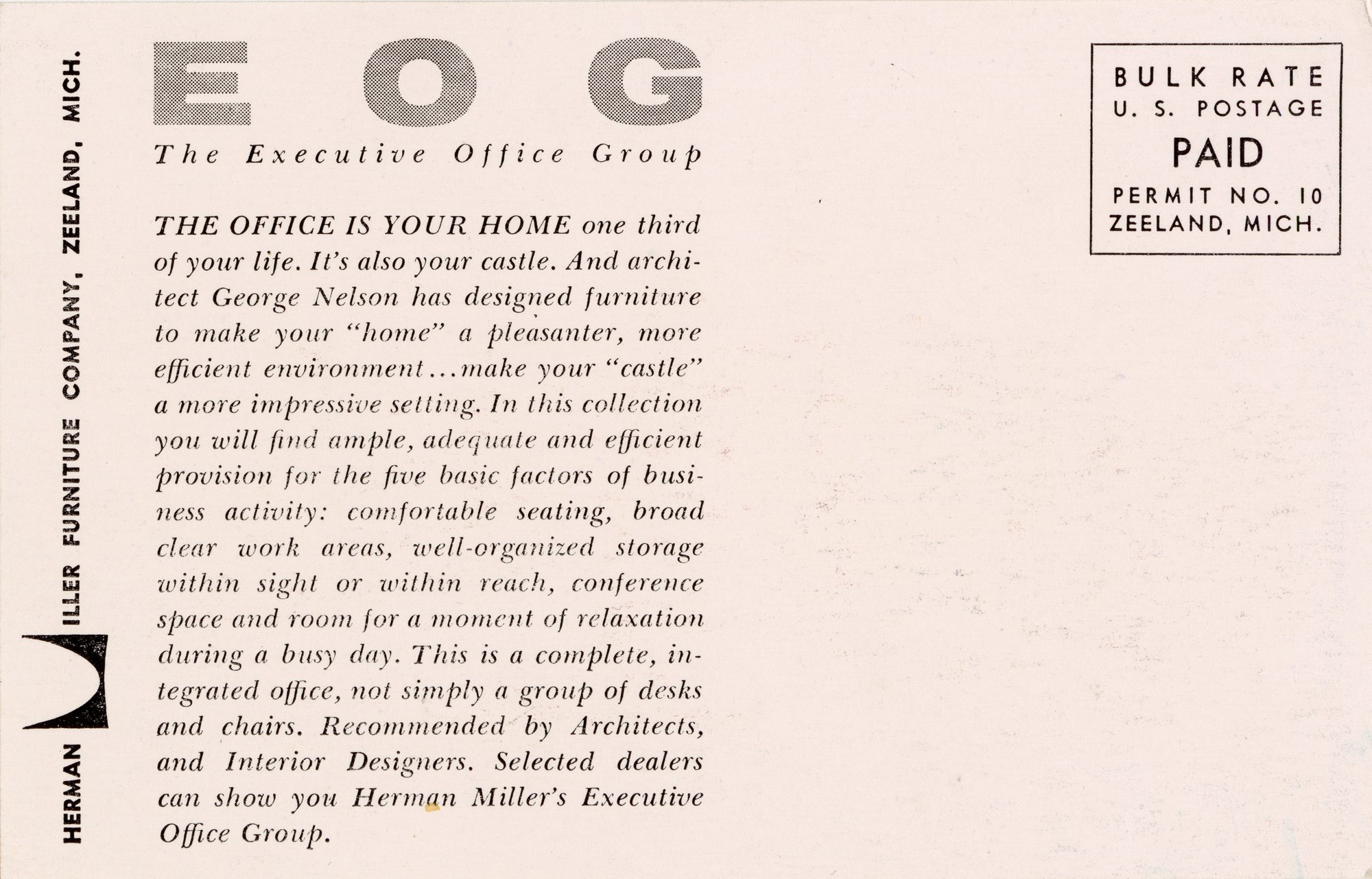 While the Eameses usually saw to the creation of promotional materials related to their designs, they would do so in coordination with George Nelson, who as Herman Miller’s design director was responsible for leading the company’s overall brand image and communications strategy. While this promotional postcard for George Nelson’s Executive Office Group carries no attribution, based on the contextual similarities to other Eames-designed postcards and inclusion of a colorful Eames DAT-1 swiveling and tilting desk chair, it is likely to have been staged, photographed, and designed by the Eames Office.