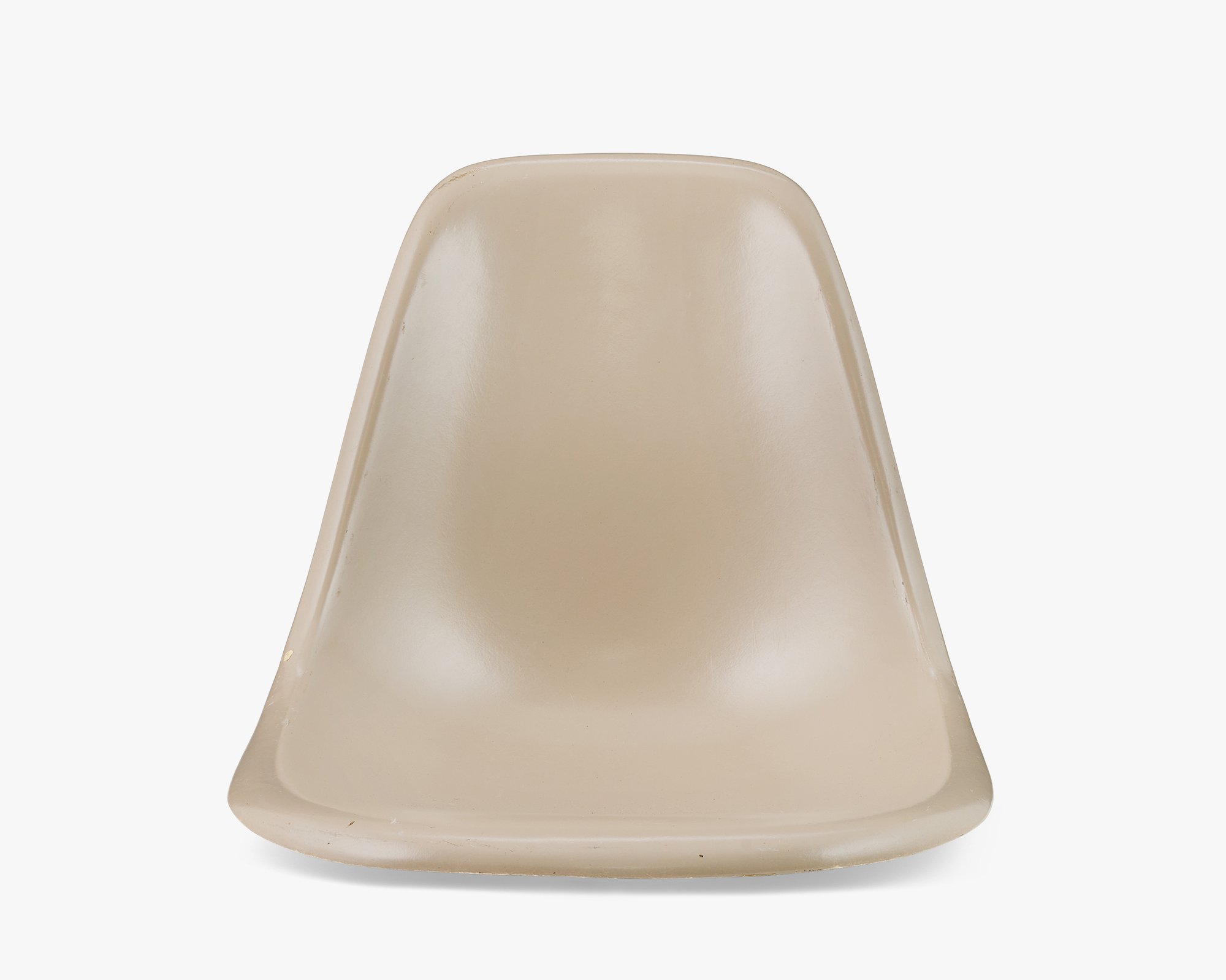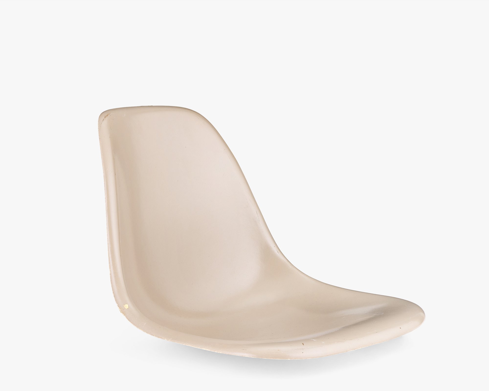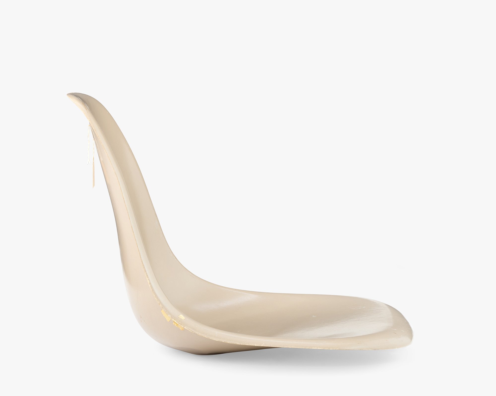 This is a special artifact in the collection. The uniform and consistent appearance is something Charles said was “always the objective.” This experimental shell was made with the same process used to produce earlier shells with one exception—they added a screen. This extra step filtered longer glass threads, which created the fibrous appearance. The result was a smooth, fine-grained texture, particularly apparent on the back of the shell. It was a step on the way to new fiberglass chairs introduced by Charles and Ray in the 1970s.