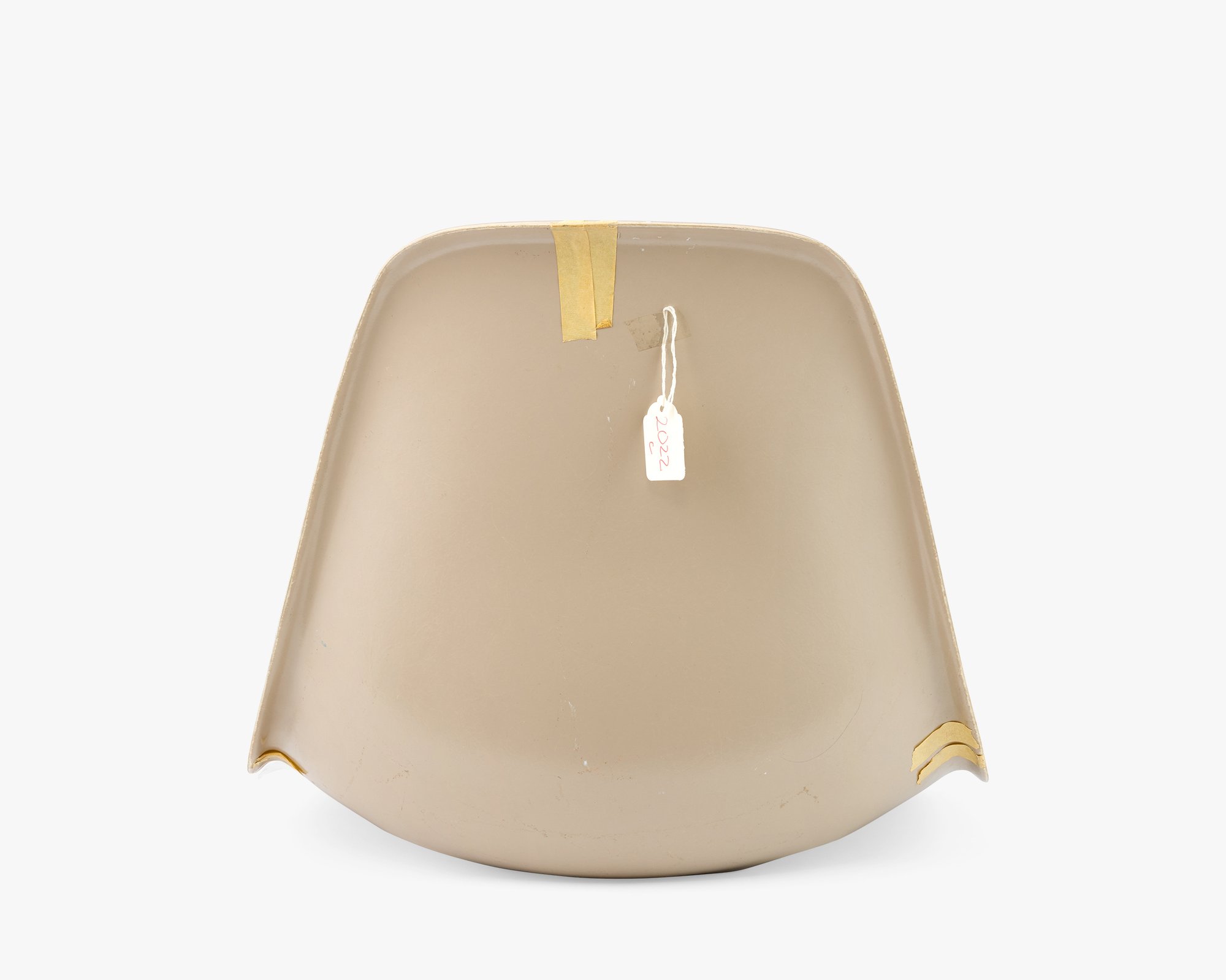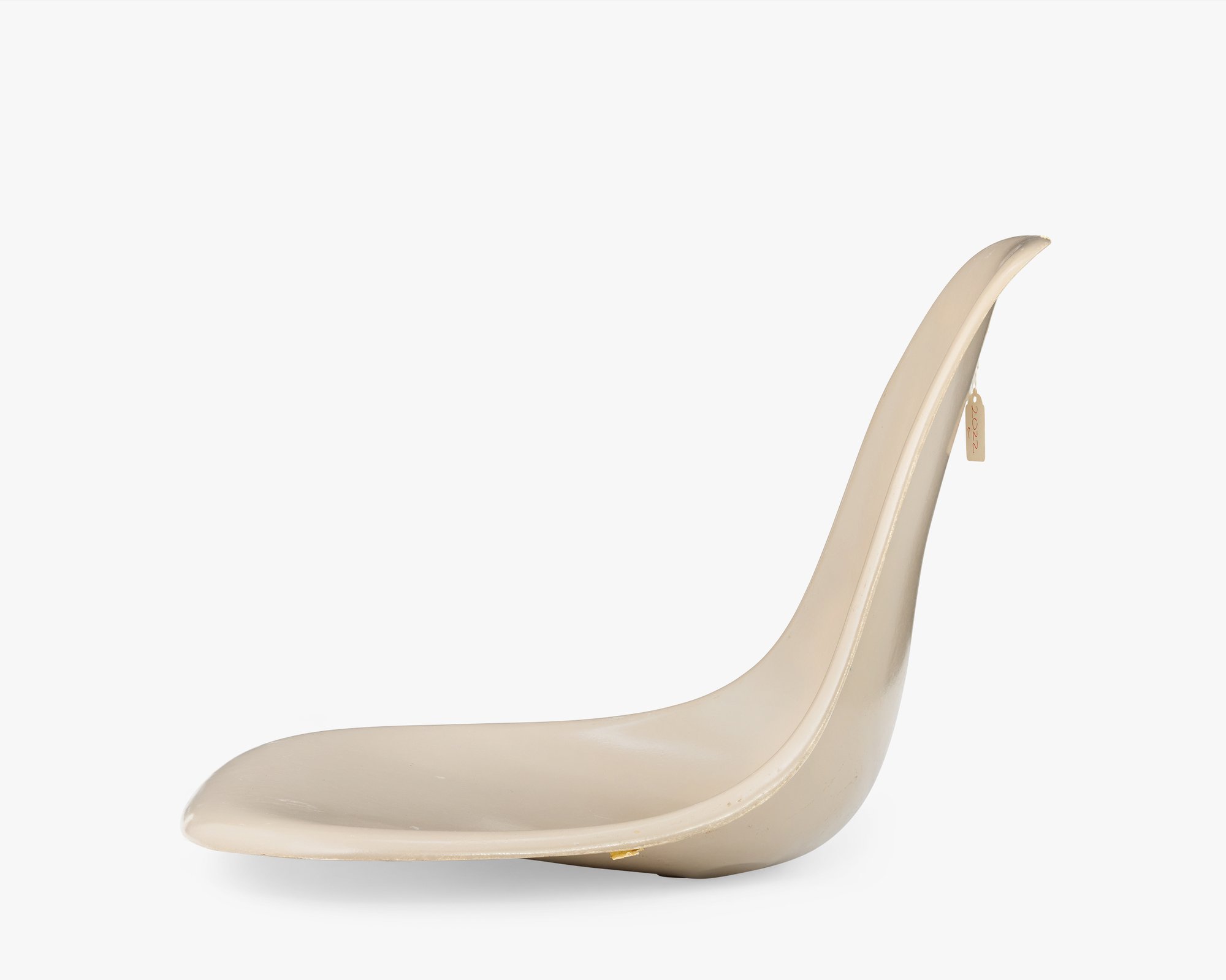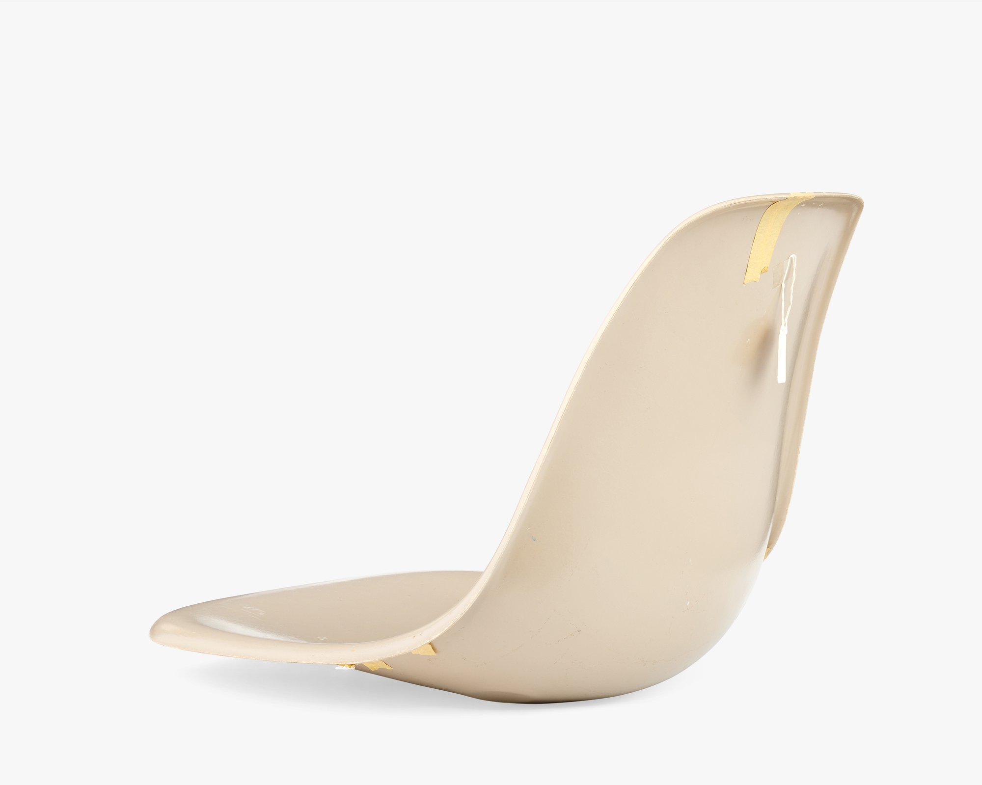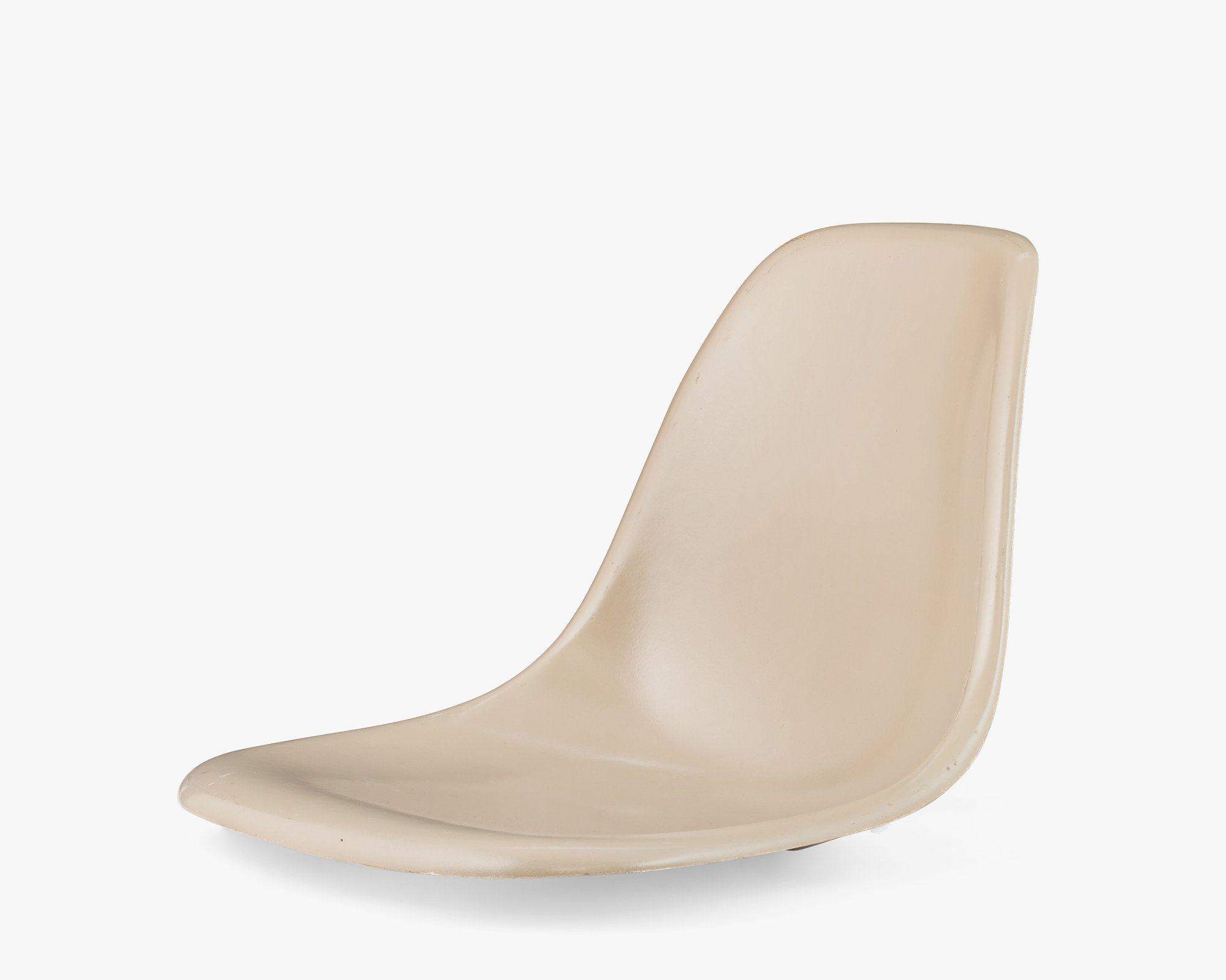 This is a special artifact in the collection. The uniform and consistent appearance is something Charles said was “always the objective.” This experimental shell was made with the same process used to produce earlier shells with one exception—they added a screen. This extra step filtered longer glass threads, which created the fibrous appearance. The result was a smooth, fine-grained texture, particularly apparent on the back of the shell. It was a step on the way to new fiberglass chairs introduced by Charles and Ray in the 1970s.