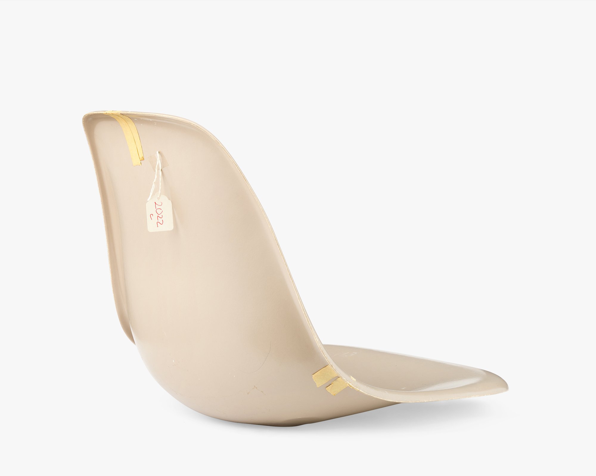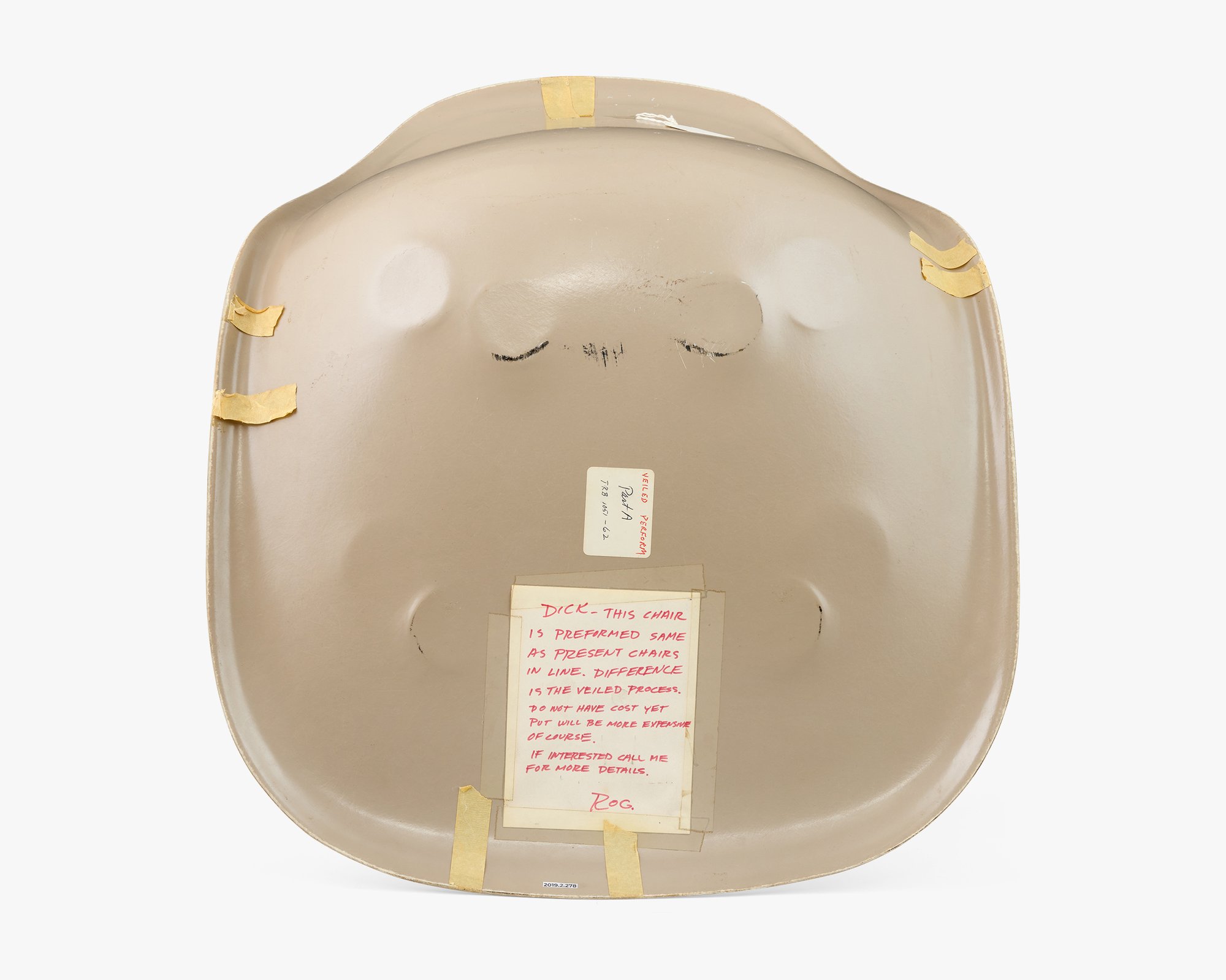 A note taped to the bottom of the shell handwritten in red ink reads, “DICK—THIS CHAIR IS PREFORMED SAME AS PRESENT CHAIRS IN LINE. DIFFERENCE IS THE VEILED PROCESS. DO NOT HAVE COST YET BUT WILL BE MORE EXPENSIVE OF COURSE. IF INTERESTED CALL ME FOR MORE DETAILS. ROG.” There is a white, rectangular sticker handwritten in red ink, “VEILED PERFORM” and handwritten in black ink, “Part A, TRB 1051-62”.