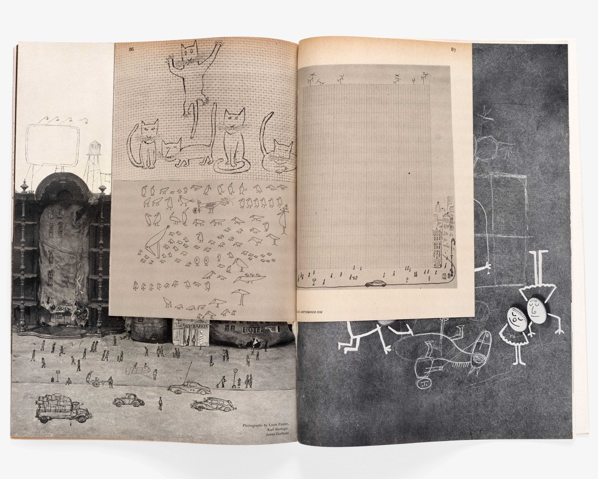 The September 1950 “New York Issue” of Flair magazine featured a cover by artist Federico Pallavicini and a multi-page insert by Saul Steinberg in which his intricate drawings overlaid photographs by Louis Faurer, Karl Bissinger, and James Godbold. Flair was a short-lived but celebrated art magazine that debuted in February 1950 and ceased publication the following year after only 12 issues. Steinberg’s contribution, titled “The City,” playfully explored relationships between people, buildings, and things by transforming one thing into another through his drawing. By adding faces to inanimate objects, he turned lamps into commuters waiting at a bus stop or a flower pot into a figure lounging on the floor. He also tapped into his architectural training—he completed his degree at Milan's Regio Politecnico in 1940—to morph graph paper into a massive modernist edifice, file cabinets into a commercial street, and a tall chest of drawers into an imposing skyscraper. The result was a charming and clever study of urban form and the social worlds that unfold within it, and the work closely parallels his drawings on actual furniture in the Eames Office that same year.