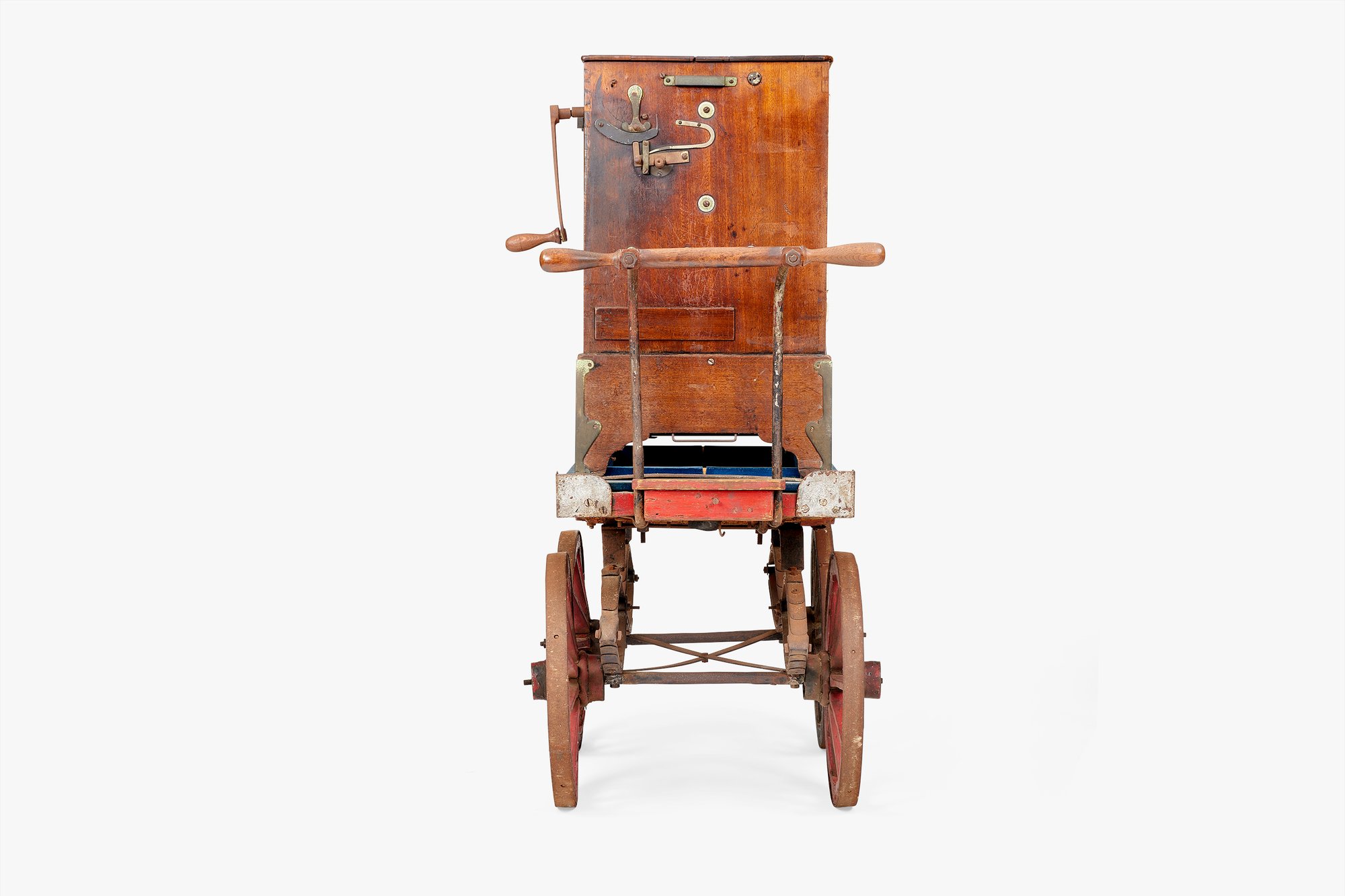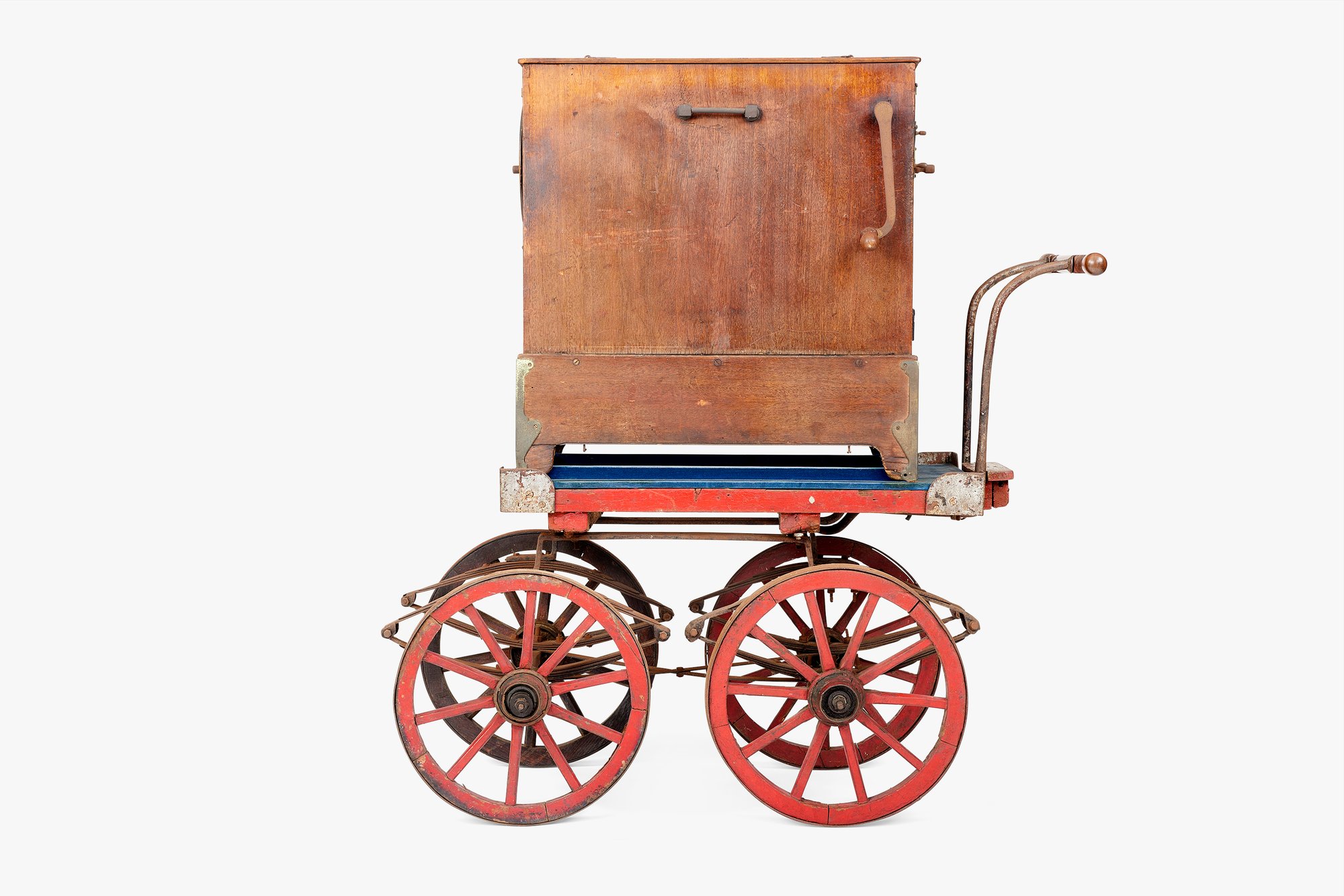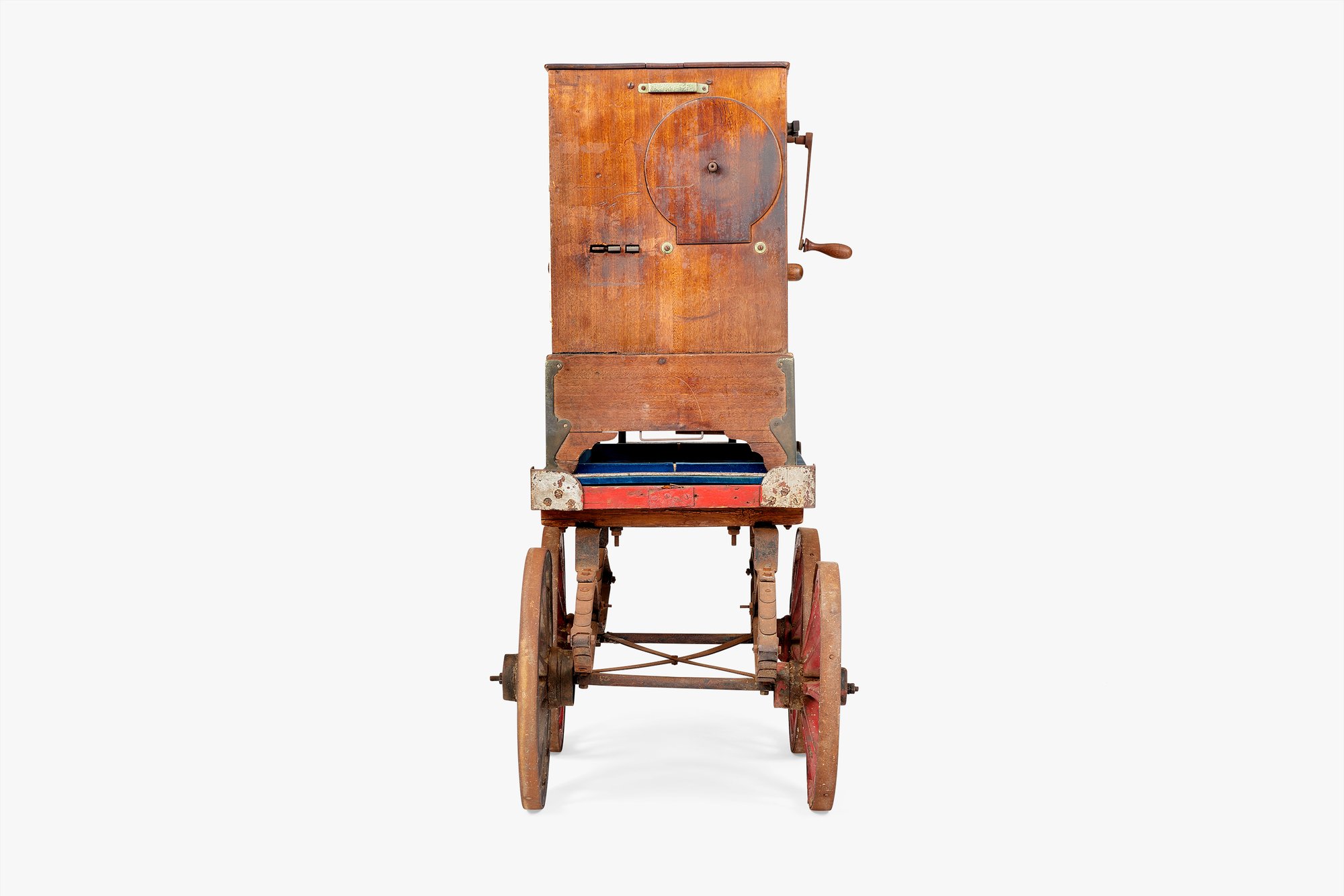 Charles was especially fond of this barrel organ and often played it on special occasions. Barrel organs are French in origin (though this one bears a German inscription across its front). They contain a series of bellows and pipes that are played mechanically by hand-cranking a wheel. The instrument is known by many different names in English alone, including roller organ, crank organ, hand organ, and street organ. The latter name refers to their common use by street performers and they were commonly mounted on wheels for easy transport. The Eameses took advantage of their barrel organ’s portability by moving it back and forth between their home/studio and office as desired. They also affectionately referred to it as a “hurdy gurdy,” a name that in fact describes another instrument, one which is also played by cranking a wheel but contains strings, not pipes. In any case, the Eameses delighted in the combination of music and machine that this piece represented.