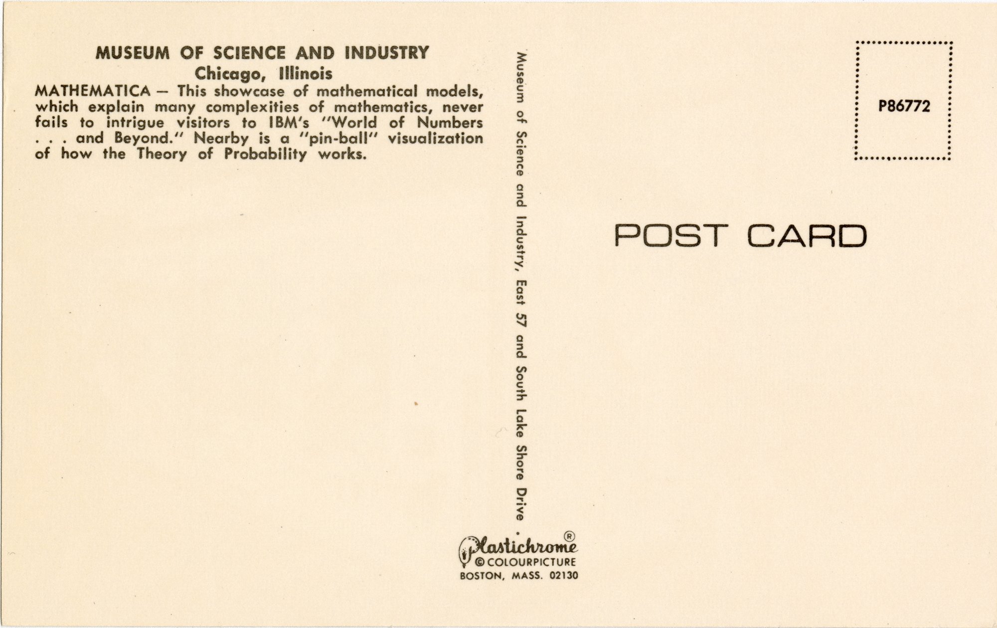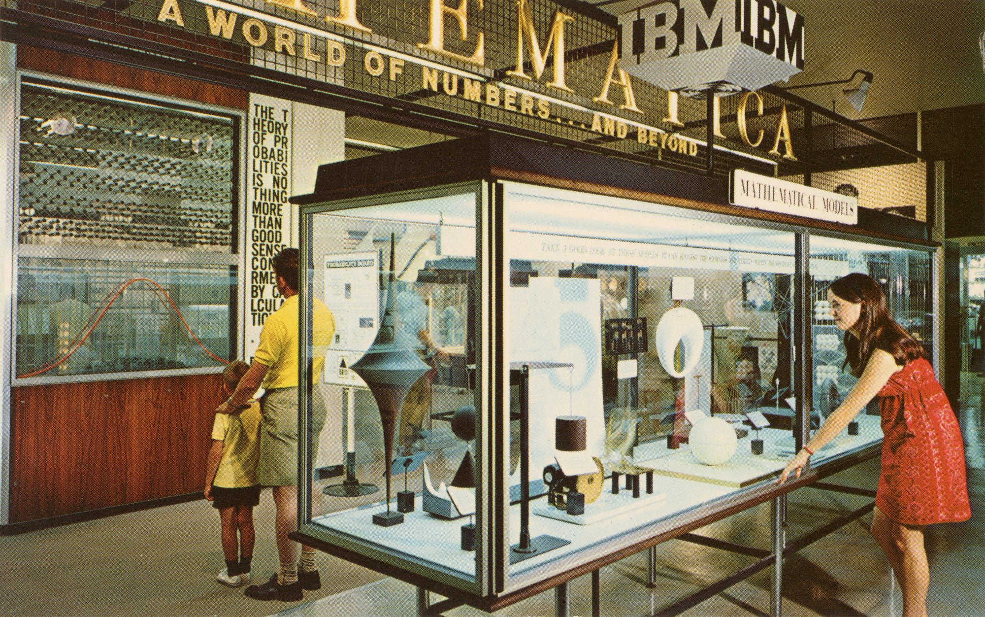 Pairing fundamental mathematical concepts with interactive displays was integral to the planning of Mathematica. Charles stated that the exhibition “should be of interest to a bright student and not embarrass the most knowledgeable…One of the best kept secrets in science is how unpompous scientists are at their science, and the amount of honest fun that for them is part of it. In doing an exhibition, as in Mathematica, one deliberately tries to let the fun out of the bag.” Pictured here is the entrance to the second version of Mathematica created by the Eames Office and IBM for the Museum of Science and Industry in Chicago. A model showcase houses forms representing various mathematical principles. Directly behind is the Probability Machine and a graphic panel explaining the law of probability. When visitors push the button of the Probability Machine, 30,000 plastic balls fall through a maze of 200 steel pegs, randomly forming the classic bell curve.