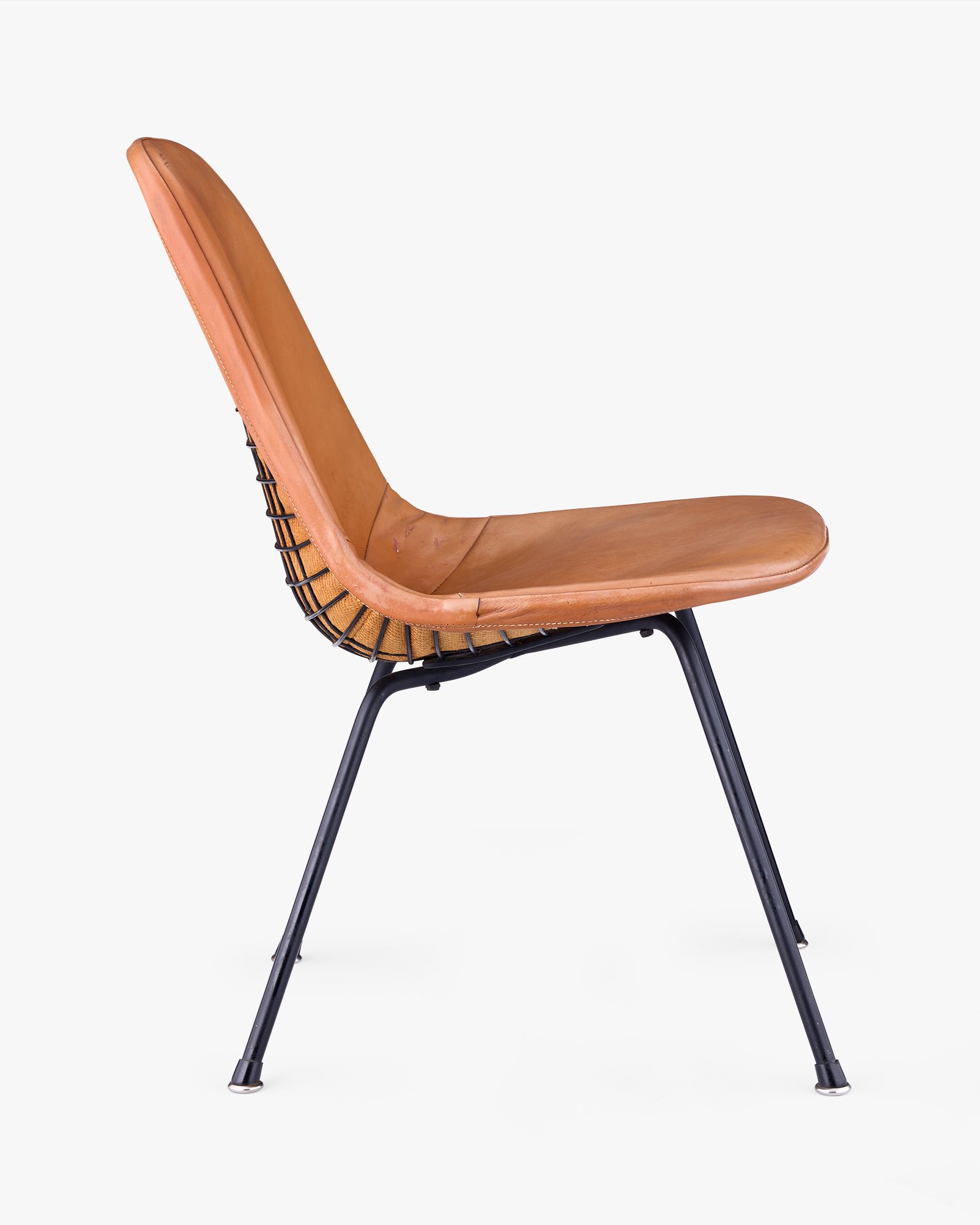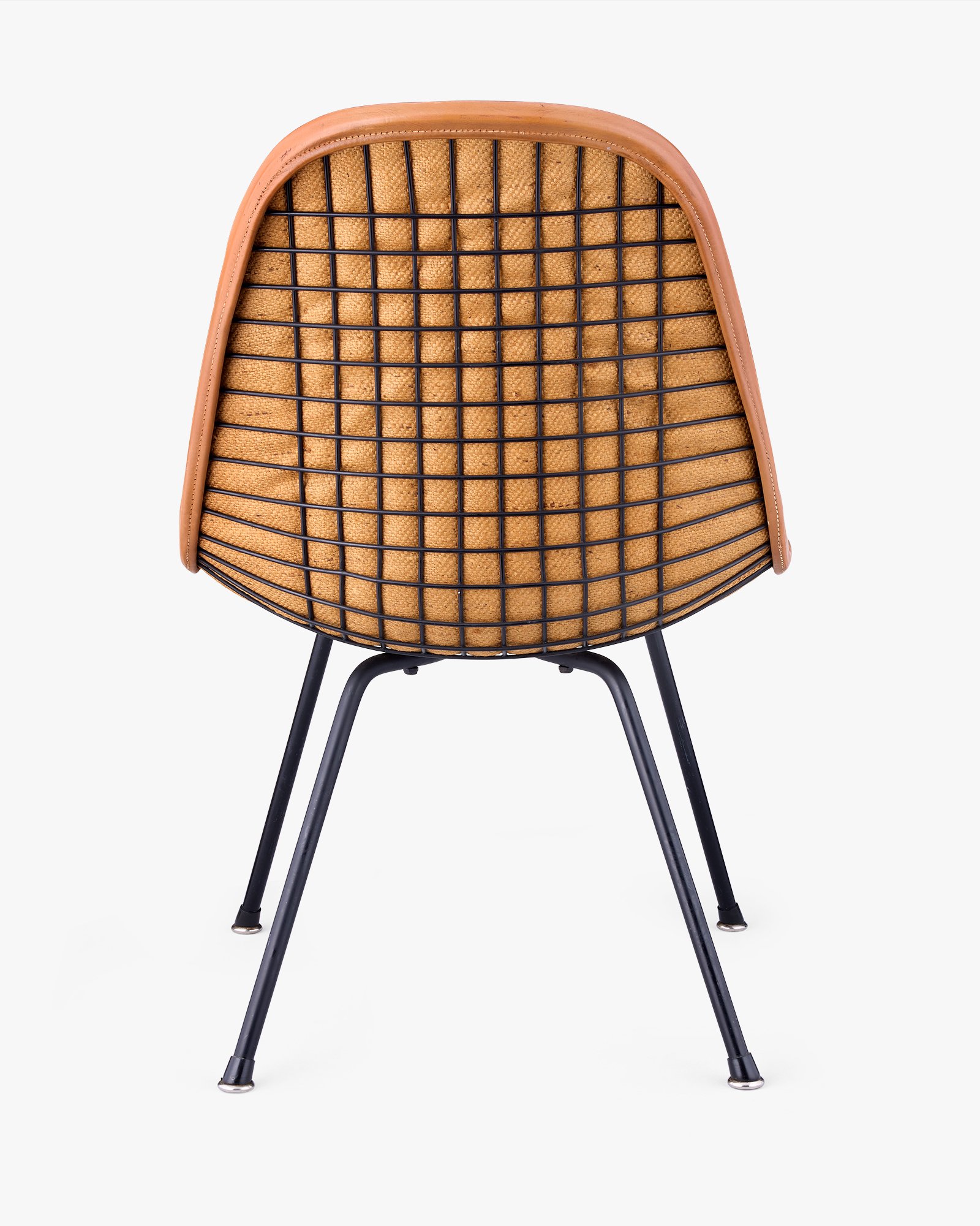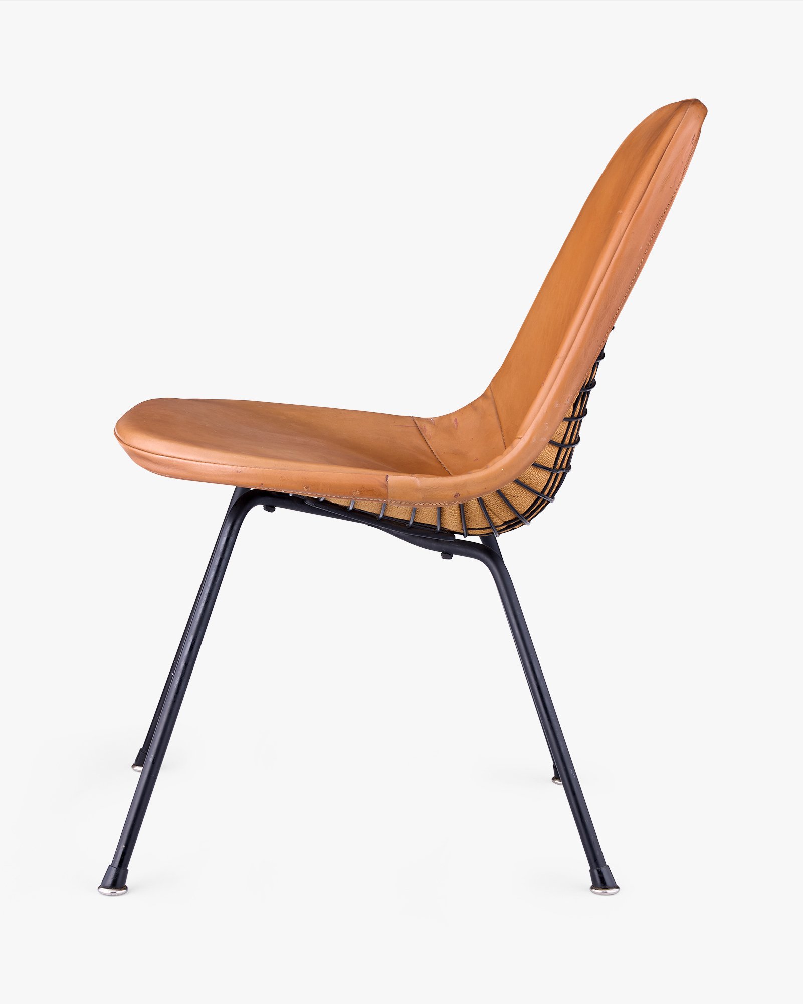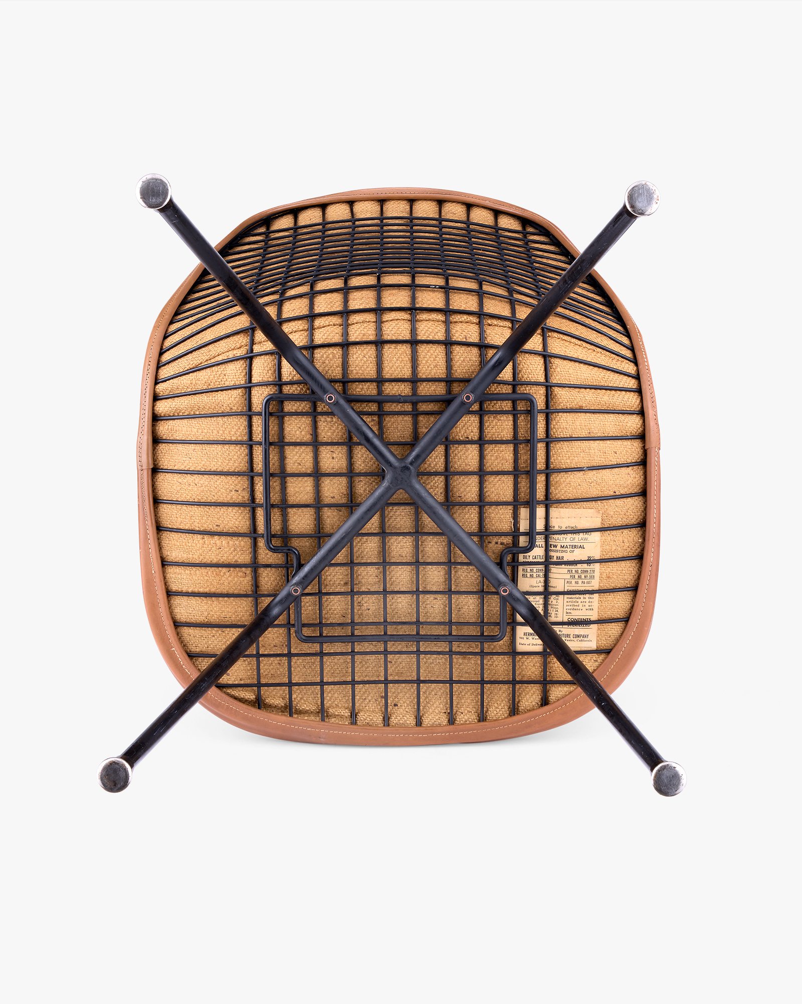 For the first few years of production, the upholstered wire chairs had two options: the “Postman’s Bag Tan Leather” or a lovely black/brown and white crosscheck upholstery, both selections curated by Ray and Charles. MKX-1 stands for Medium (height) K-wire (chair) X (base) 1 (1-piece upholstered pad).