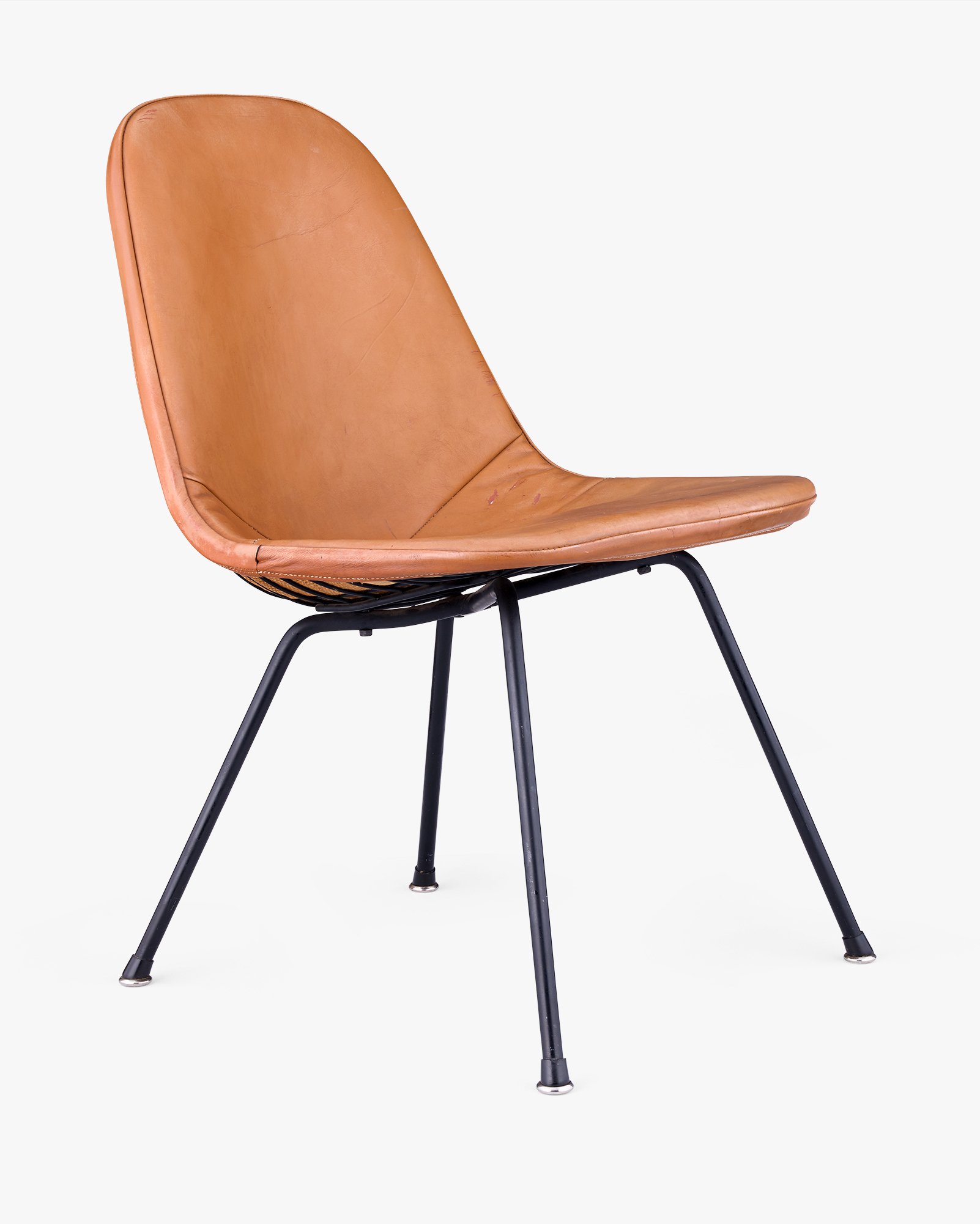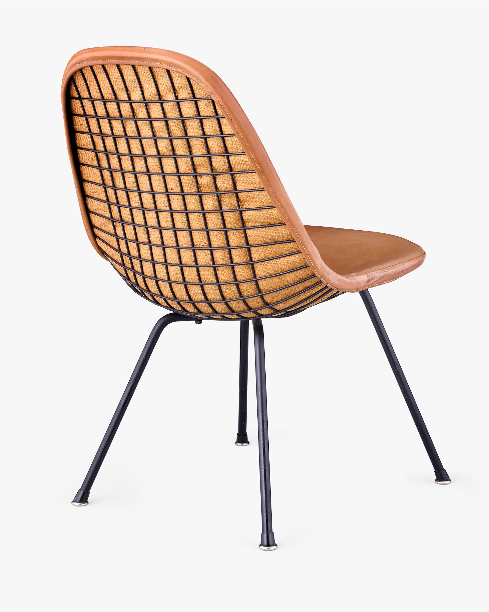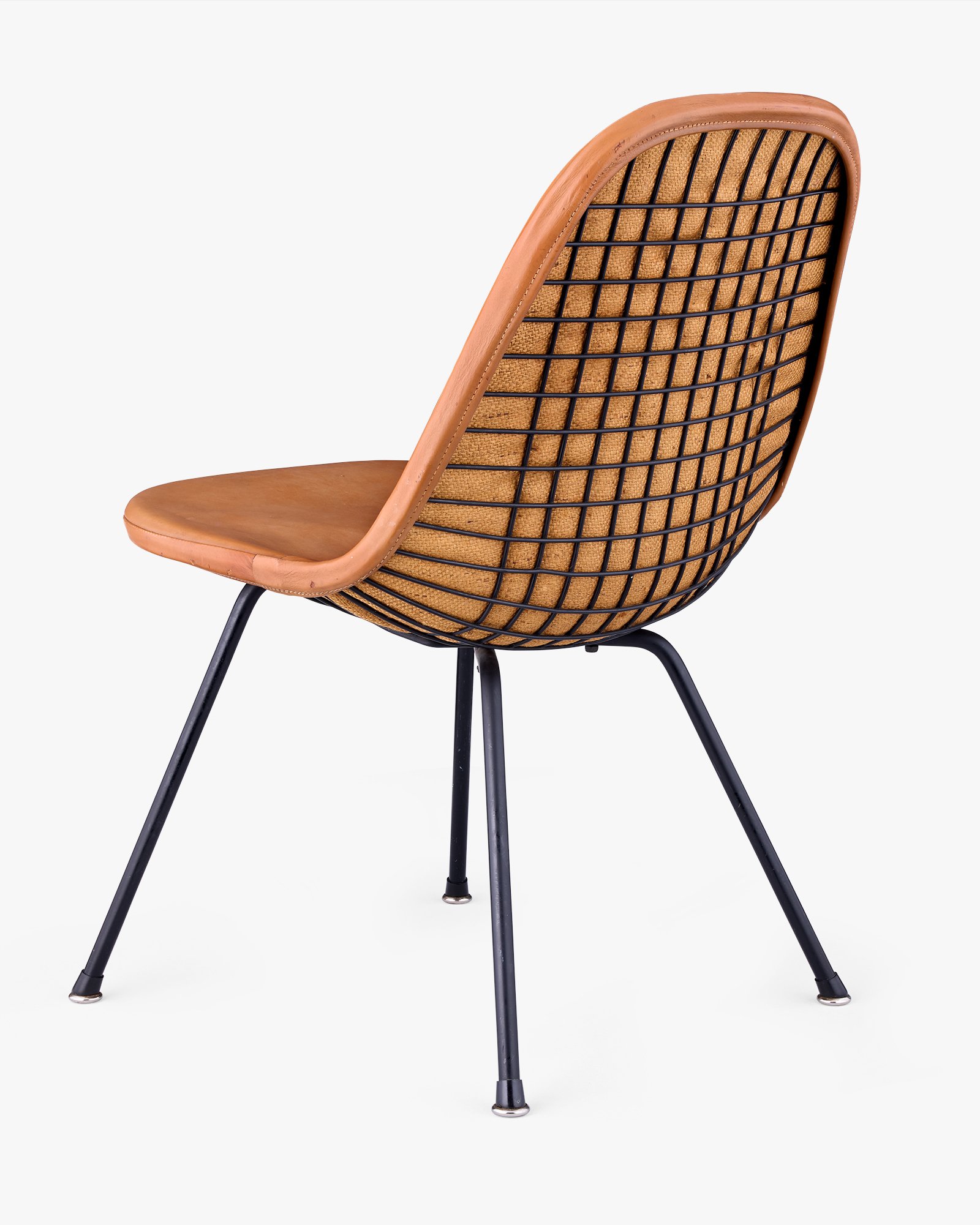 For the first few years of production, the upholstered wire chairs had two options: the “Postman’s Bag Tan Leather” or a lovely black/brown and white crosscheck upholstery, both selections curated by Ray and Charles. MKX-1 stands for Medium (height) K-wire (chair) X (base) 1 (1-piece upholstered pad).
