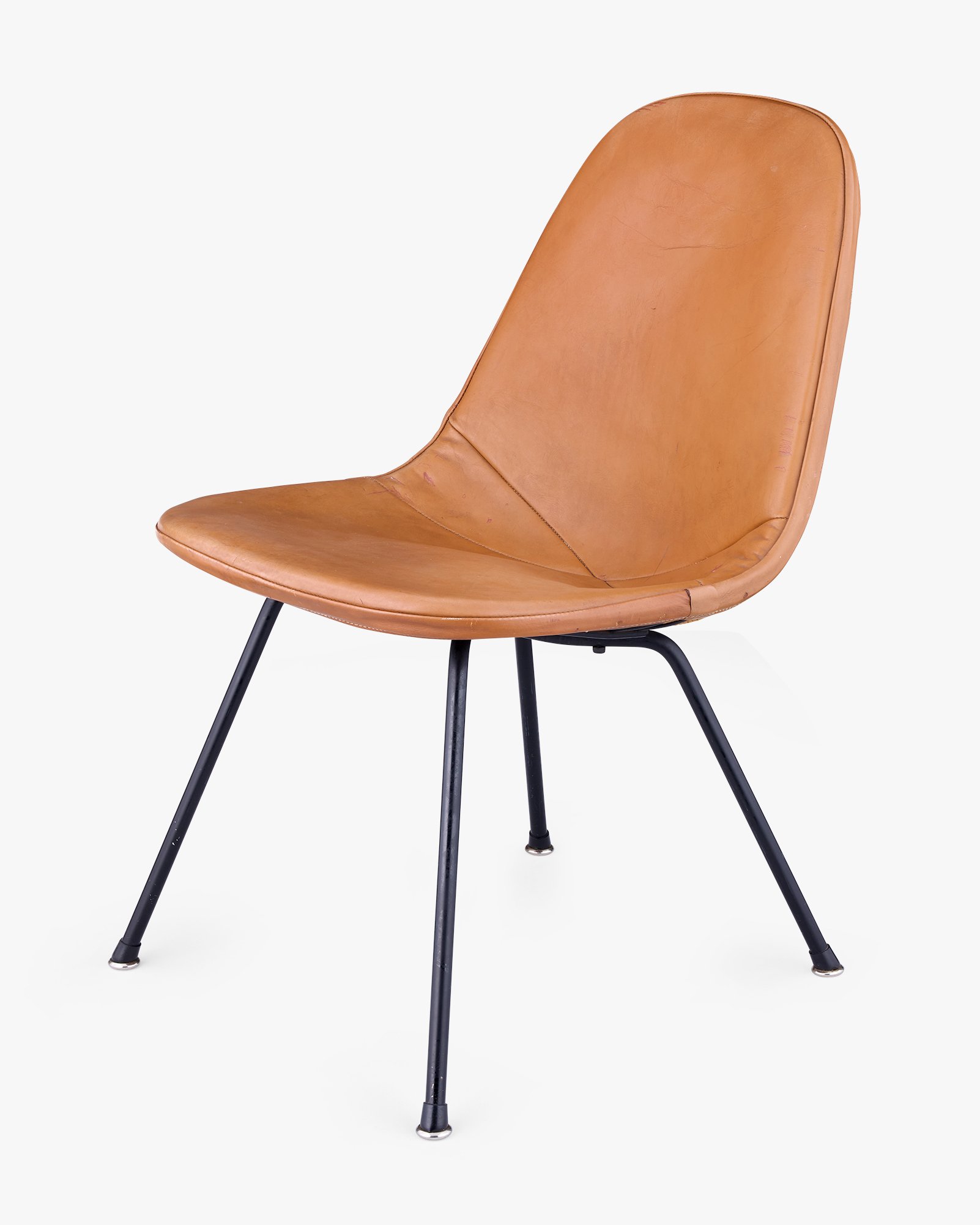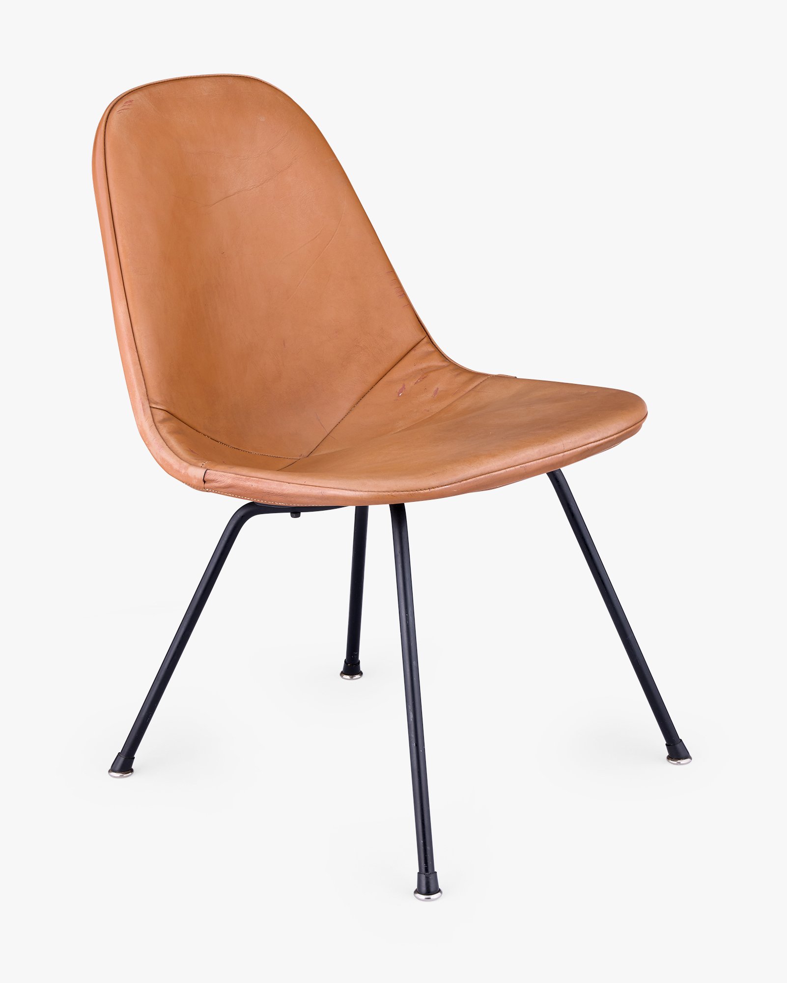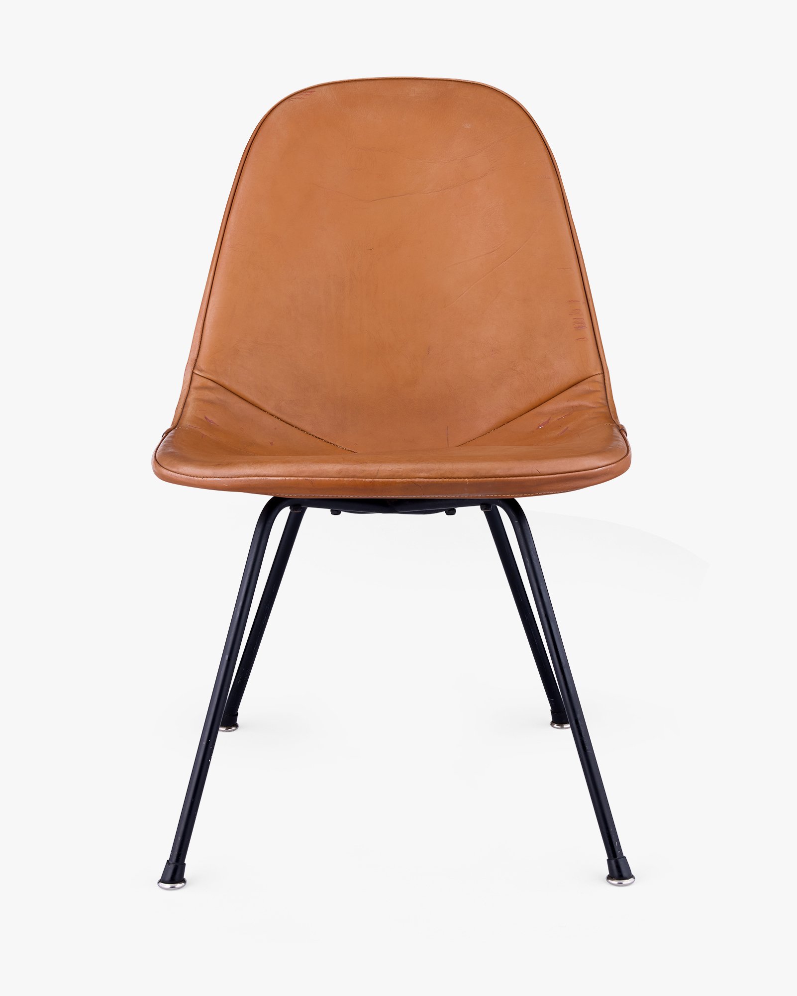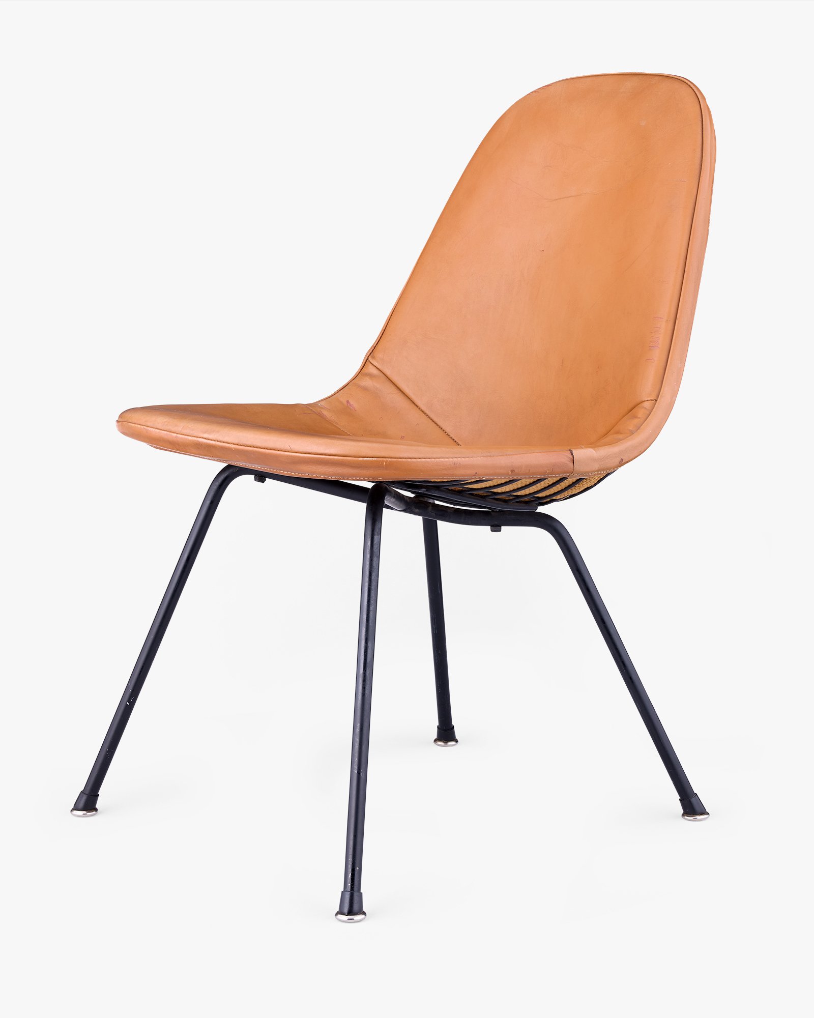 For the first few years of production, the upholstered wire chairs had two options: the “Postman’s Bag Tan Leather” or a lovely black/brown and white crosscheck upholstery, both selections curated by Ray and Charles. MKX-1 stands for Medium (height) K-wire (chair) X (base) 1 (1-piece upholstered pad).