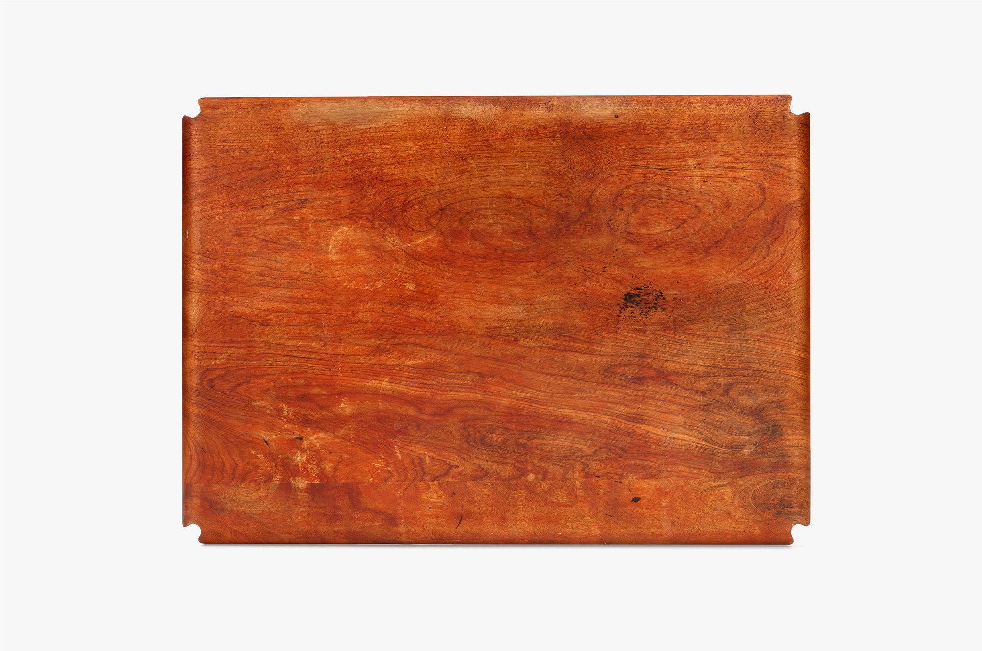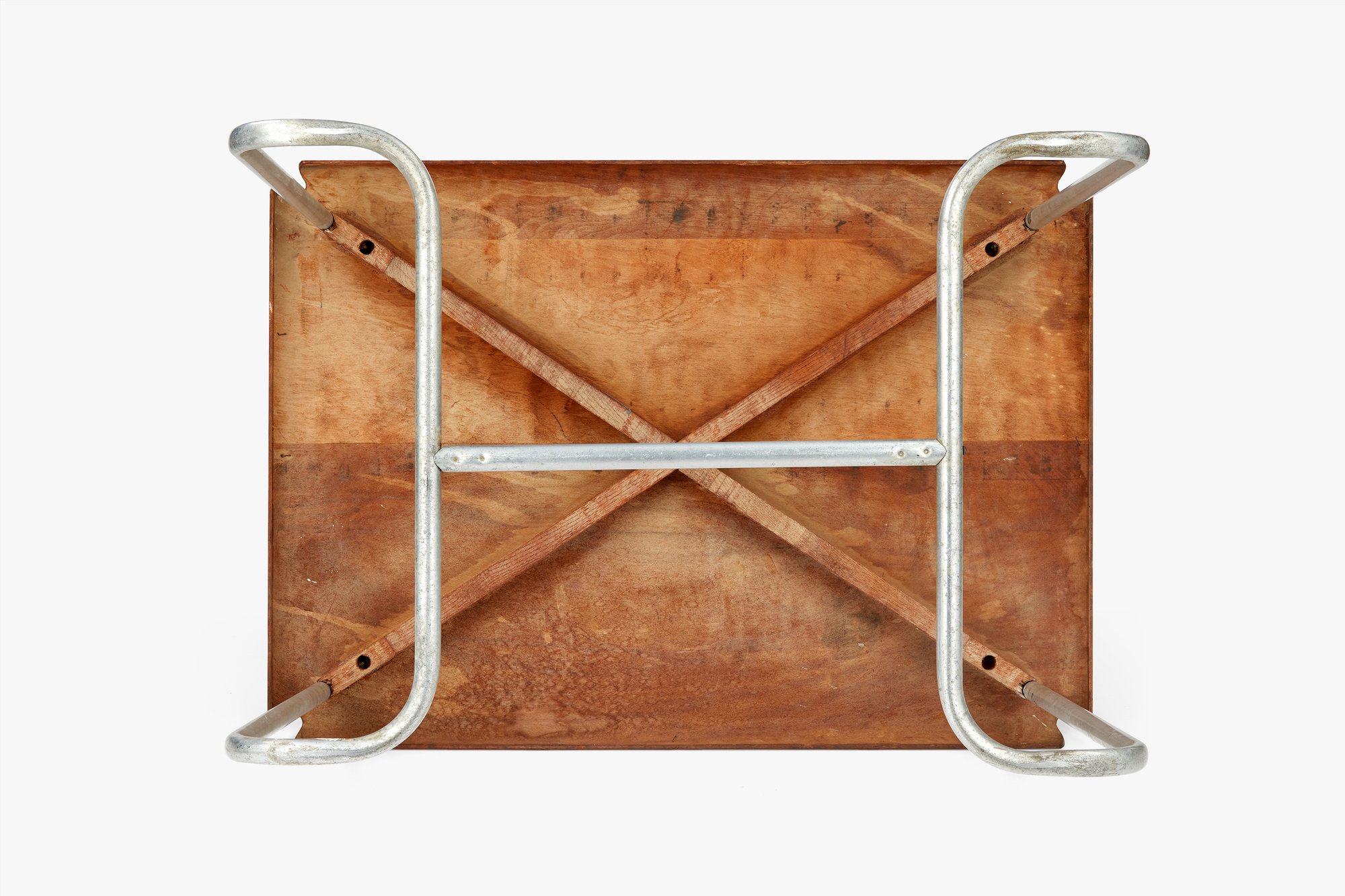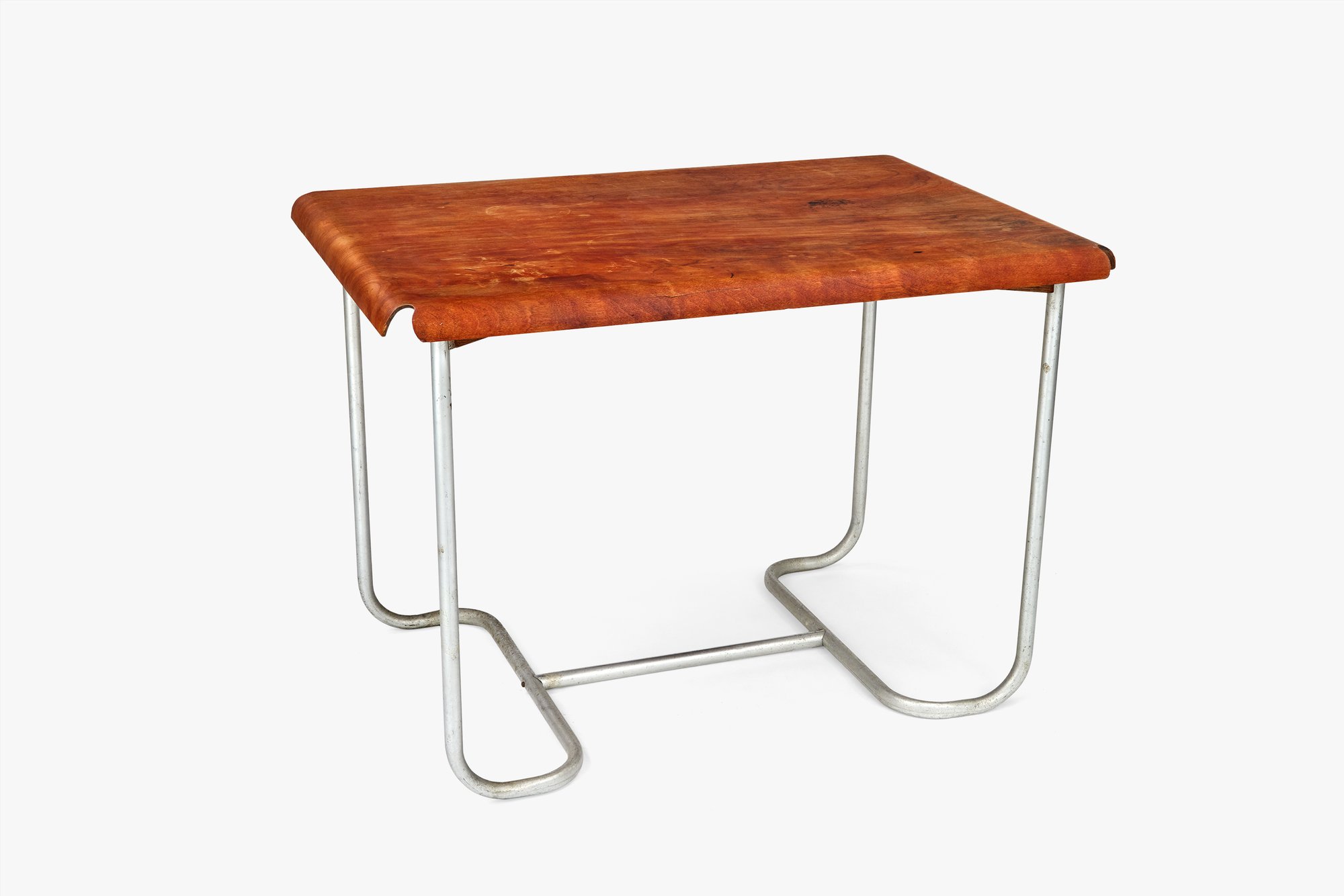This is the first table that Ray and Charles Eames made together. It features a molded plywood tabletop and tubular aluminum base—an early instance of the designers’ interest in combining materials. The Eameses began experimenting with molded plywood in 1941. While they did not originate the technique (using heat to bend plywood into curving forms dates to the mid-19th century), they were the first to establish a process for the mass production of molding plywood into complex curves. After experimenting with chair seats, the Eameses turned their attention toward leg splints, which they designed for the US Navy. As the war was winding down, they sought other applications for three-dimensionally molded plywood, including tables. To form a surface with a gently folded edge, they cut out the corners to allow each side to bend freely. The table’s base connects underneath its top at five points, and the top could be detached from the base for convenient shipping and storage. This particular example was used for decades in an Oklahoma dentist’s office. The table was made by industrial manufacturer Evans Products’ Molded Plywood Division, which the Eameses ran at the time.