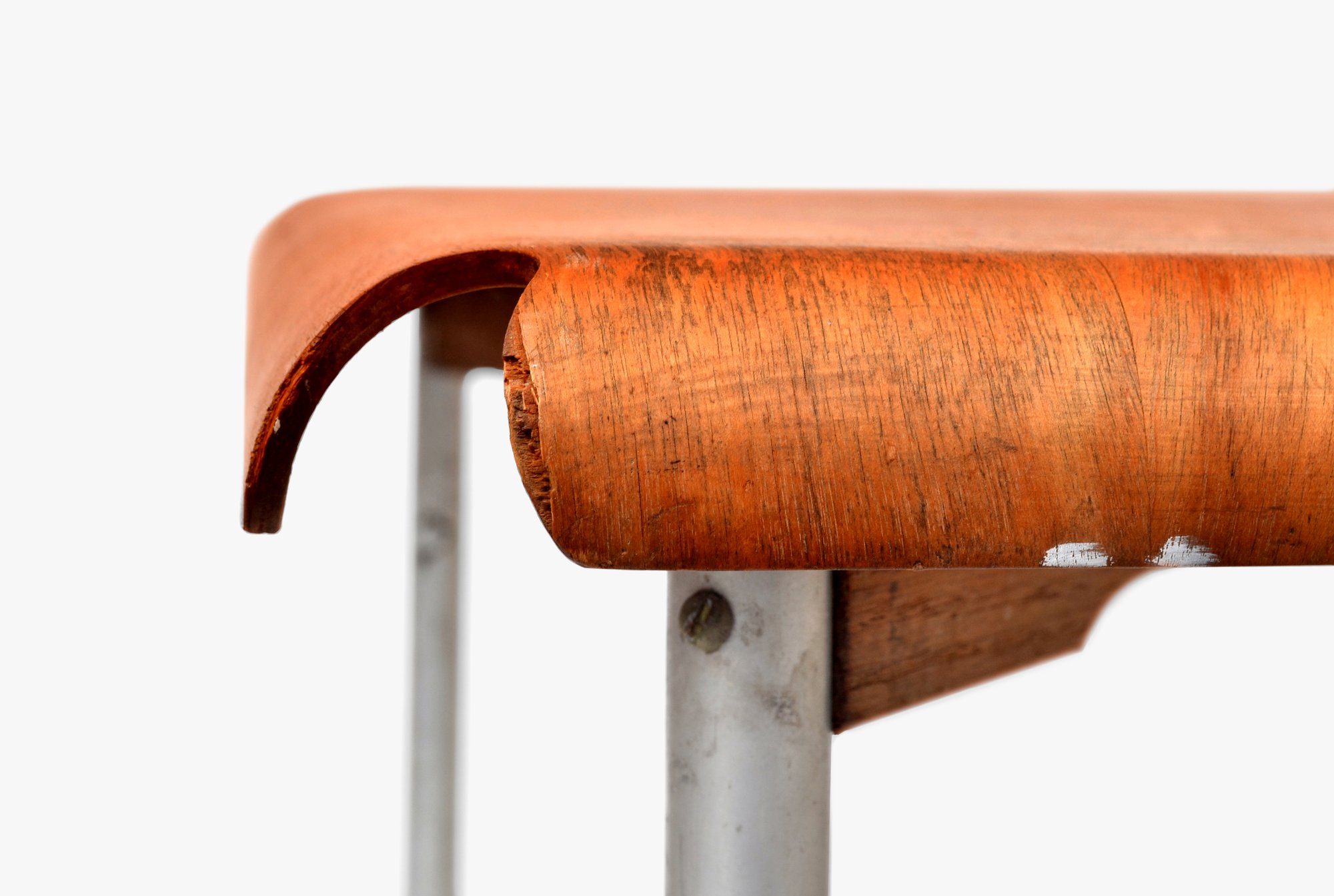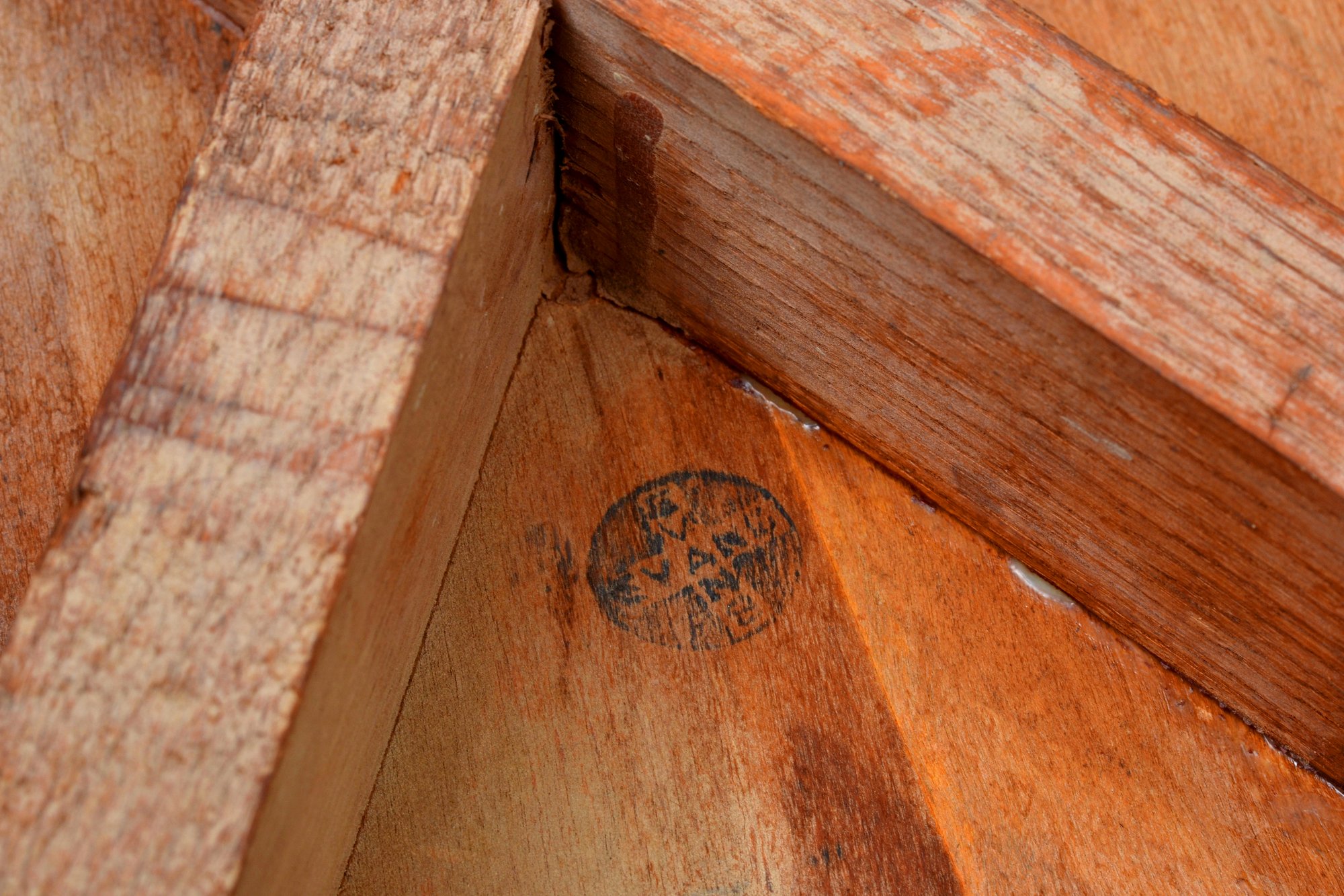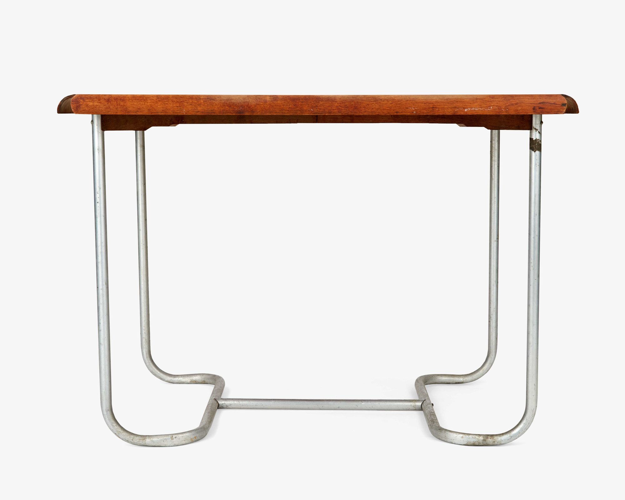 This is the first table that Ray and Charles Eames made together. It features a molded plywood tabletop and tubular aluminum base—an early instance of the designers’ interest in combining materials. The Eameses began experimenting with molded plywood in 1941. While they did not originate the technique (using heat to bend plywood into curving forms dates to the mid-19th century), they were the first to establish a process for the mass production of molding plywood into complex curves. After experimenting with chair seats, the Eameses turned their attention toward leg splints, which they designed for the US Navy. As the war was winding down, they sought other applications for three-dimensionally molded plywood, including tables. To form a surface with a gently folded edge, they cut out the corners to allow each side to bend freely. The table’s base connects underneath its top at five points, and the top could be detached from the base for convenient shipping and storage. This particular example was used for decades in an Oklahoma dentist’s office. The table was made by industrial manufacturer Evans Products’ Molded Plywood Division, which the Eameses ran at the time.