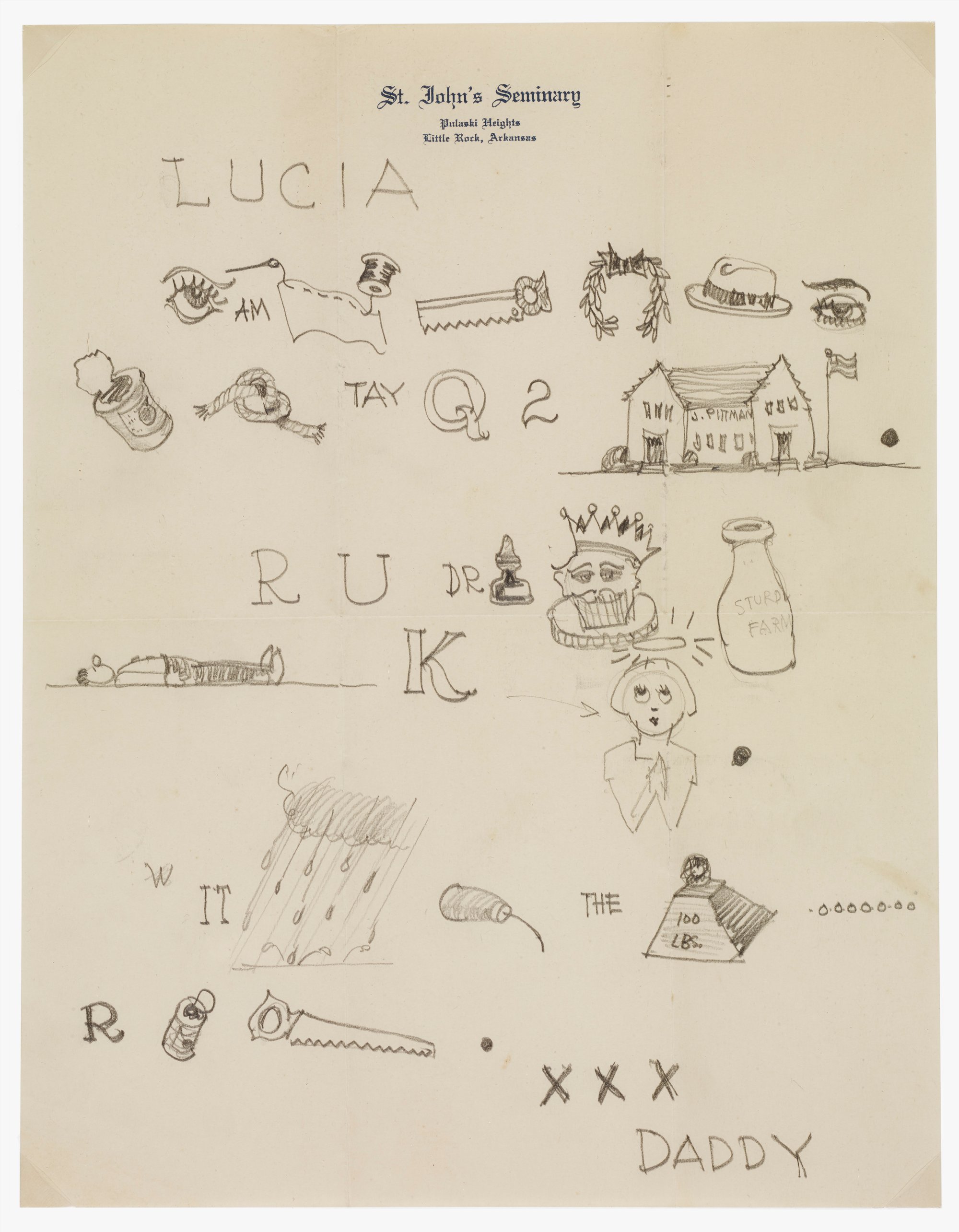 Lucia Eames, Charles’s only child, received this rebus letter from her father. A rebus uses simple images to string together sounds into a word or phrase. This game of coding and decoding letters carried on throughout Lucia’s childhood. Charles wrote this letter while working on one of the two churches he designed and built in Arkansas.