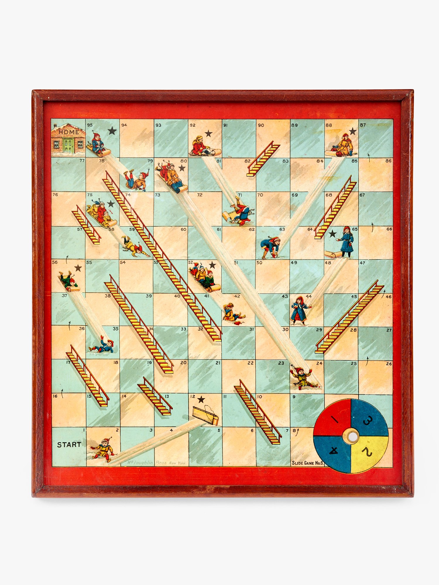 The Eameses often favored multipurpose designs for the convenience they afforded users, and they likely appreciated the two-for-one quality of this double-sided game board. On one side, a version of the Slide Game—better known today as Chutes & Ladders—features a checkerboard traversed by staircases and snowy “slides” that show children before and after an exhilarating sled ride. On the reverse, the Red Riding Hood Game invites players to race side by side along two numbered paths, one designated for Red Riding Hood, the other for the Wicked Wolf. The board was produced by McLoughlin Bros., a New York–based publishing company that operated in the late 19th and early 20th centuries until it was acquired by Milton Bradley Company in 1920. Known for its use of cutting-edge color printing technologies, the firm specialized in children’s books and board games and hired an impressive roster of artists to create delightfully detailed images that transformed simple board games into colorful adventures.
