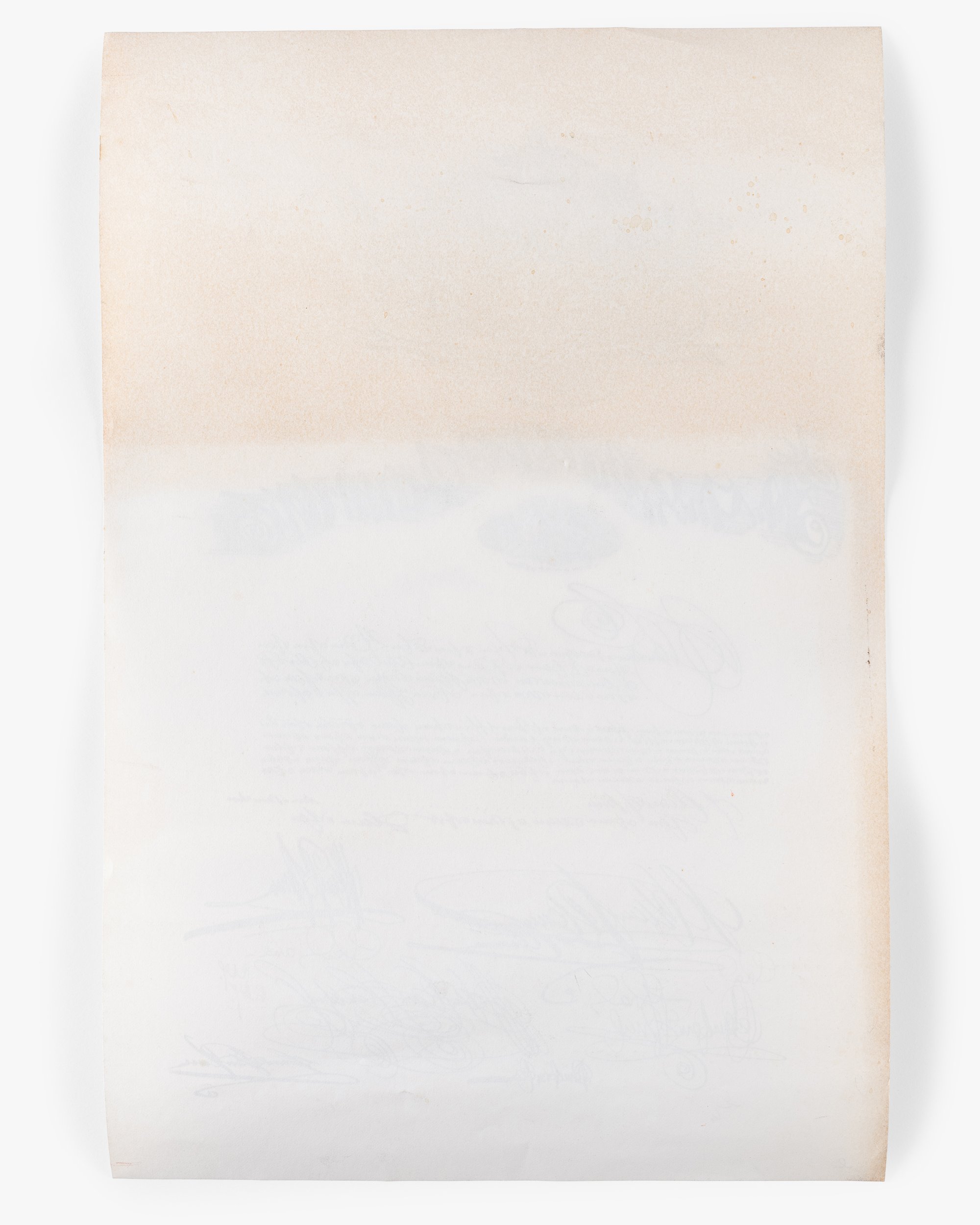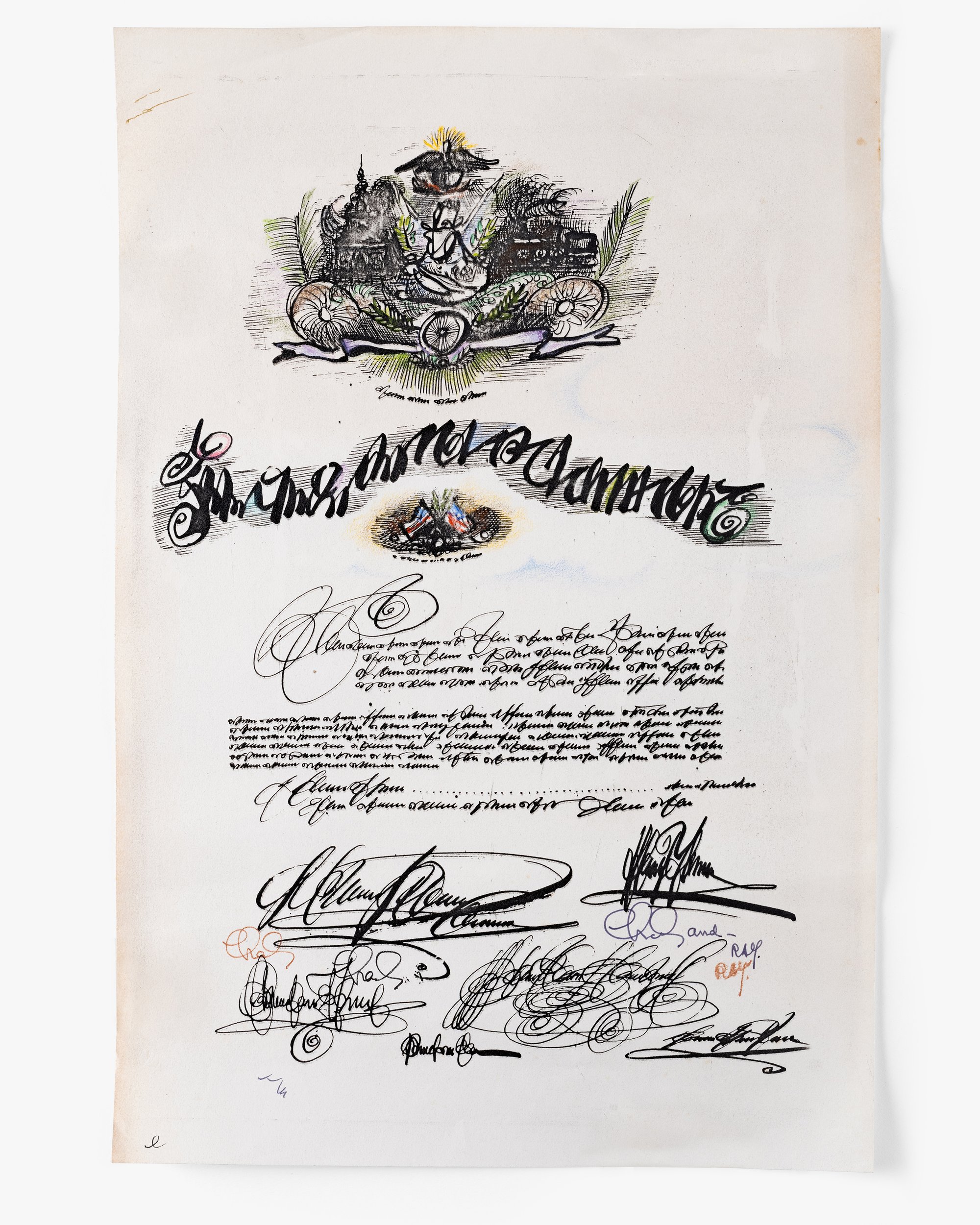 This fake diploma is one of many so-called “false documents” that Saul Steinberg made beginning in the 1940s, often as gifts for friends. The sense of absurdity is heightened by the realization that much of the document’s text is not just difficult to parse, it is in fact gibberish. Steinberg’s visual tricks reveal his simultaneous fascination, frustration, and amusement with the complexities of modern bureaucracy, with its endless bouts of paperwork and permissions. Like the rest of Steinberg’s false documents, this example imitates the conventions of real ones, with embellished calligraphy and an array of signatures. In this case, Charles’s signature appears three times and Ray’s appears twice—an abundance that veers towards absurdity. The inclusion of their signatures suggests that this diploma was commissioned by Ray and Charles to be given as a gift or to mark a special occasion.