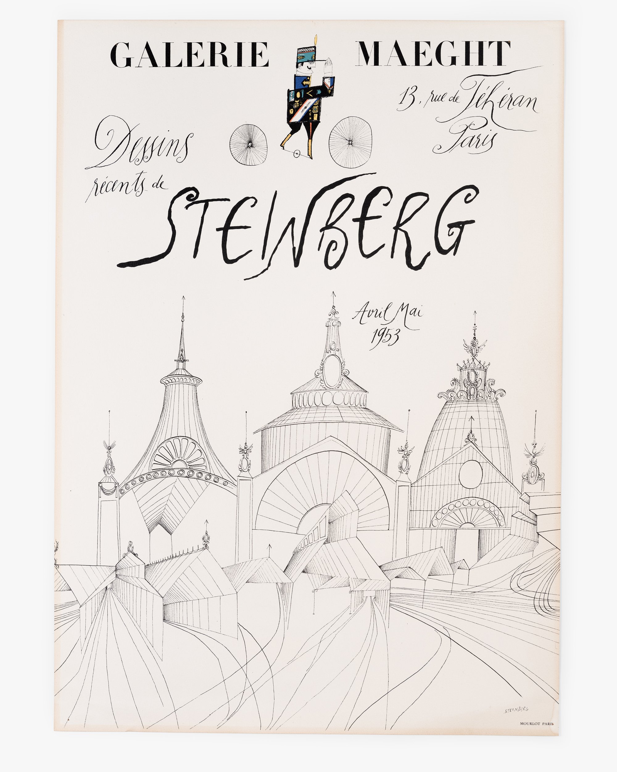 Saul Steinberg’s work was exhibited at the Galerie Maeght in Paris for the first time in the spring of 1953. The gallery, which was founded in 1936 in Cannes and opened a Paris location in 1946, was known for representing an impressive international roster of artists, including Georges Braque, Henri Matisse, Joan Miró, Marc Chagall, and Alexander Calder, among others. Steinberg created this poster to promote his show, simply called “Recent drawings by Steinberg.” This title, along with the rest of the poster’s text, appears in the upper half of the page, with Steinberg’s hand-drawn letters offering a spirited contrast to the Roman type of the gallery’s logotype. Amidst the text, a gendarme performs a balancing act fit for a circus, and his uniform offers the only spots of color in an otherwise black-and-white design. The poster’s lower half is filled by a fanciful scene of turreted buildings and train sheds with chaotic lines of tracks that spill out towards the viewer. The structures call to mind the kind of ironwork that is a hallmark of Parisian architecture, appearing everywhere from Metro stops to the Eiffel Tower, and they suggest a view of Paris as seen through Steinberg’s eyes.
