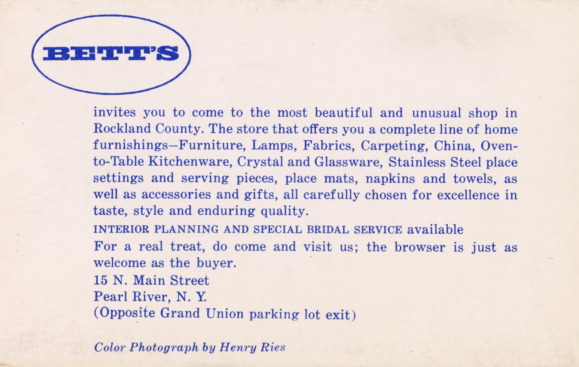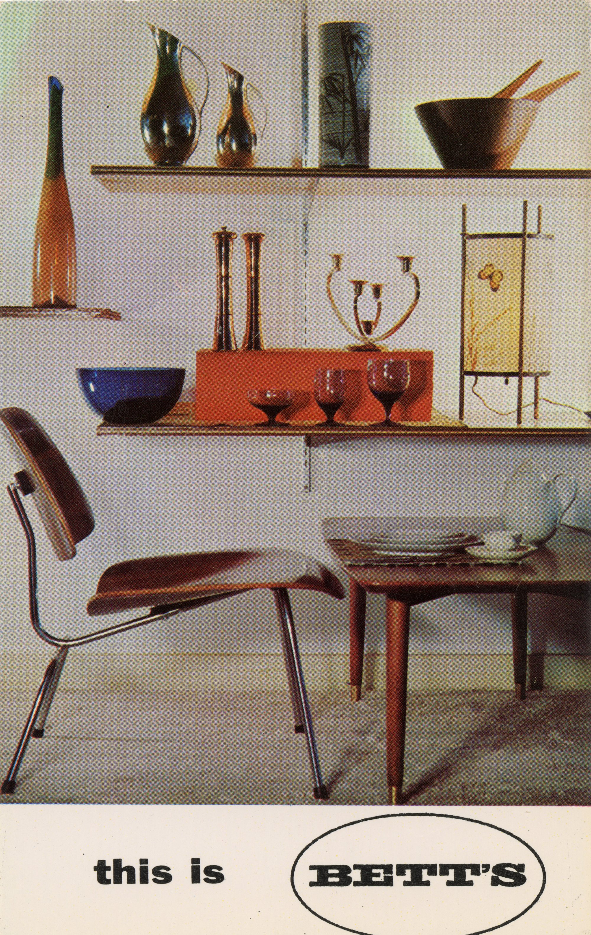 Long before Etsy and eBay, when “mid-century modern” was simply “modern,” in lots of places it looked just like this. Amidst a somewhat generic selection of glass, lighting, ceramics, and dinnerware, an Eames LCM takes center stage. During this period, Herman Miller, in addition to fulfilling orders through its own showrooms and sales force, also offered furniture through retailers such as Bett’s. With no space given for a message, address, or postage, this postcard was likely offered as an in-store promotional item or distributed at other nearby locations to help drum up interest and sales.