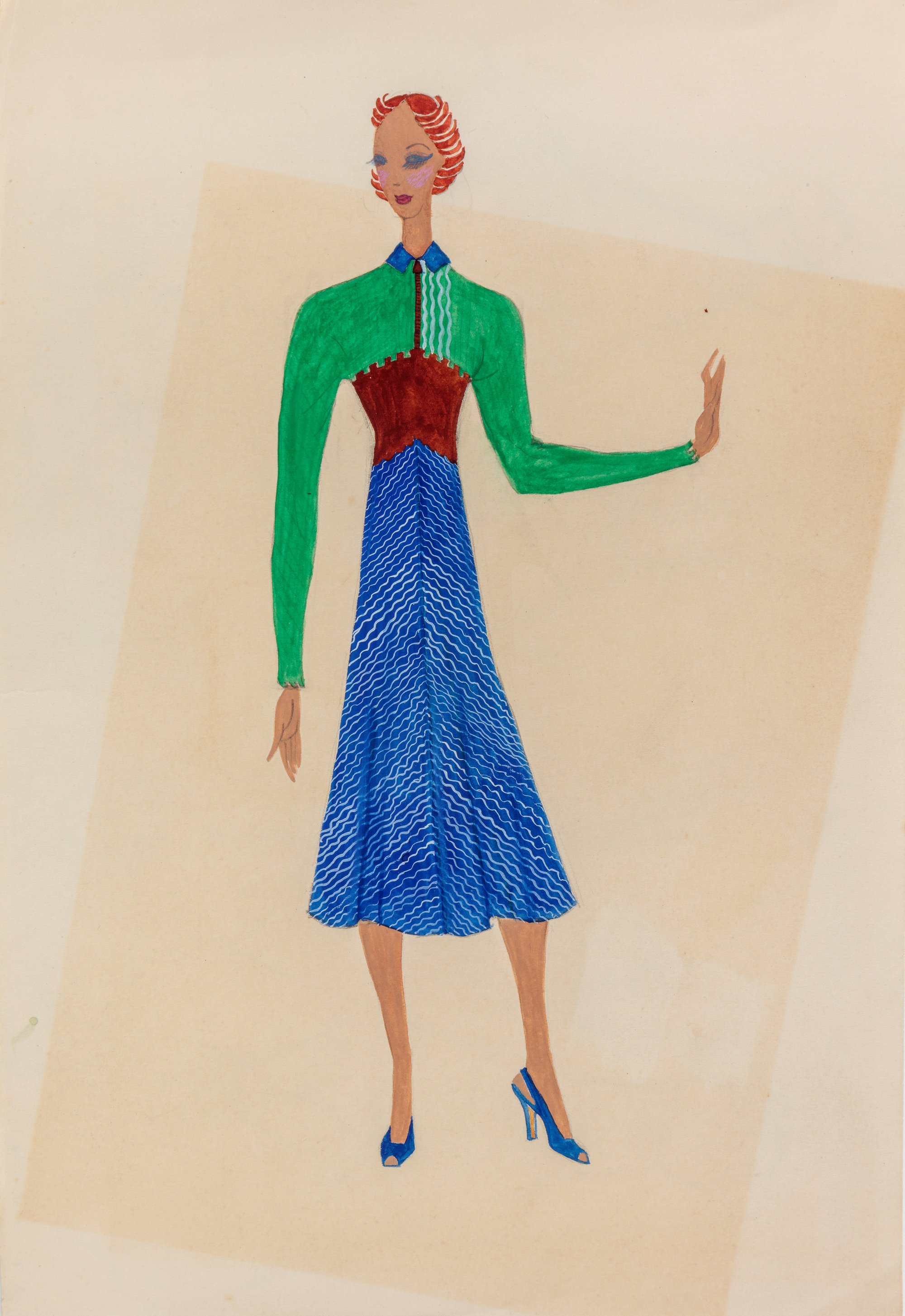 The model’s pose, with her left arm extended away from the torso and bent at the elbow, is seen in three other drawings of Ray’s from this period (A.2019.2.029, .030, and .032), indicating they were all done at approximately the same time, in 1938 or 1939 when Ray was still living in New York City. Here too, as in Yellow Day Dress with Black and Yellow Jacket (A.2019.2.029), the sling-back pumps did not come into fashion until 1938.