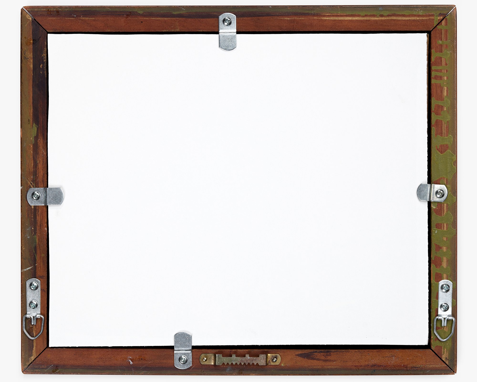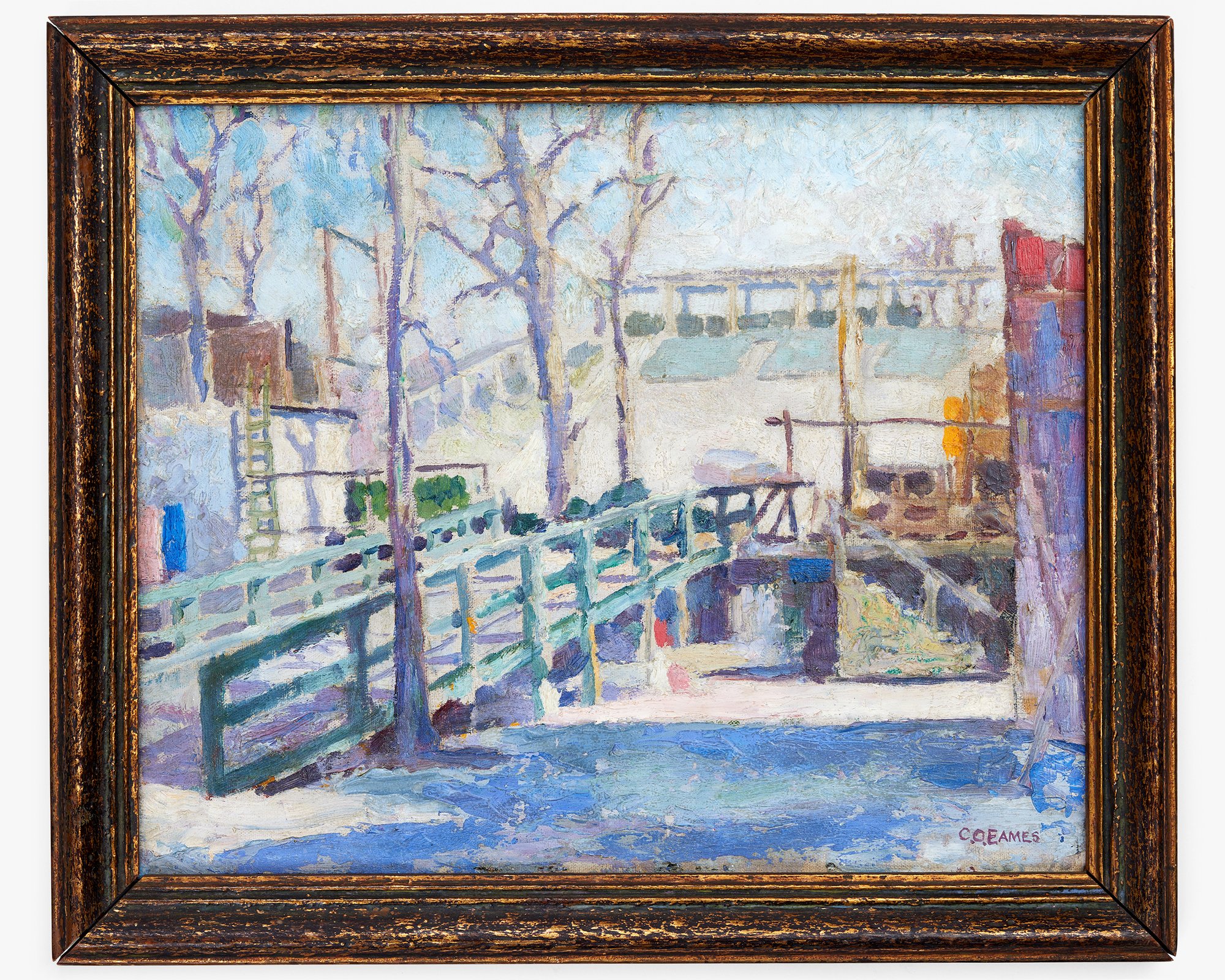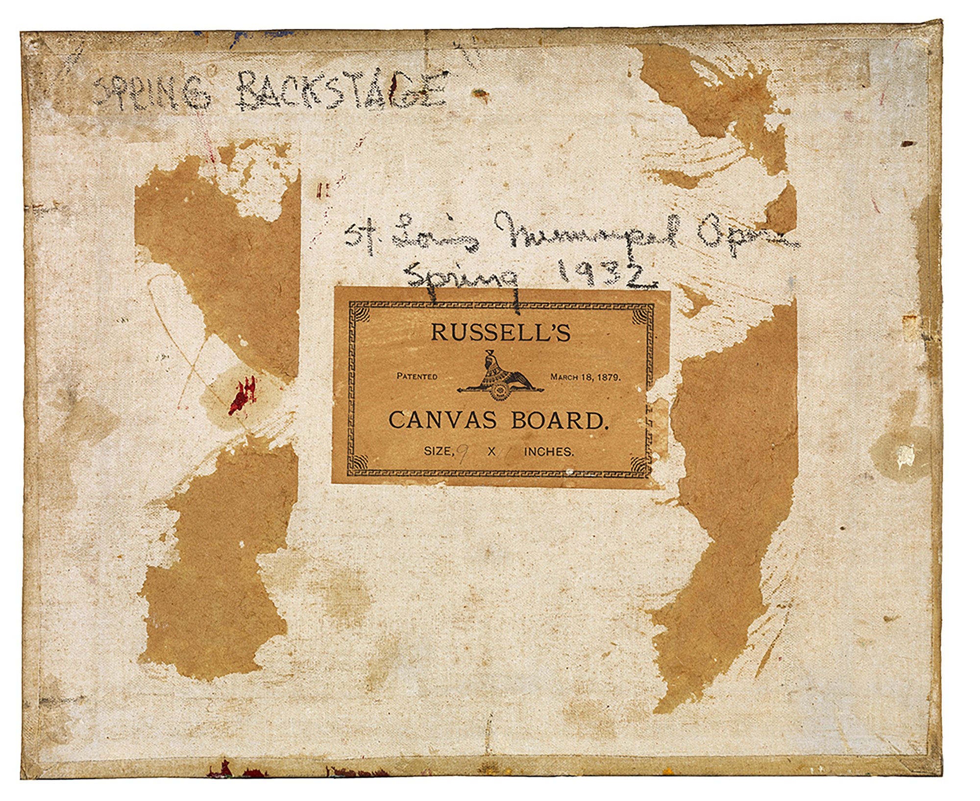 Obverse: Signed “C. O. Eames” in lower right. Reverse: “SPRING BACKSTAGE, St. Louis Municipal Opera, Spring 1932” handwritten above an attached label with a decorative border and “RUSSELL’S PATENTED [Image of Sphinx] MARCH 18, 1879. CANVAS BOARD. SIZE, 9 X 11 INCHES” printed in black ink.