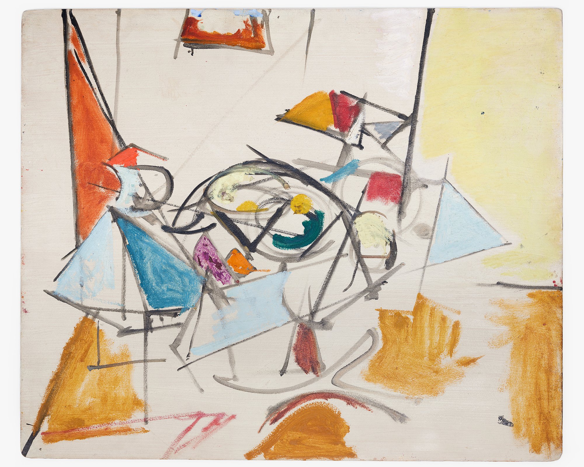 This is an abstract painting from April 1938 when Ray studied at the Hans Hofmann School of Fine Arts in New York City. Ray was painting in the Hofmann School at 52 West 9th Street, located on the top floor of a brownstone lit by skylights and reached by an open stairwell. This large still life represents a very early, very brief, and possibly influential foray into expressionism.