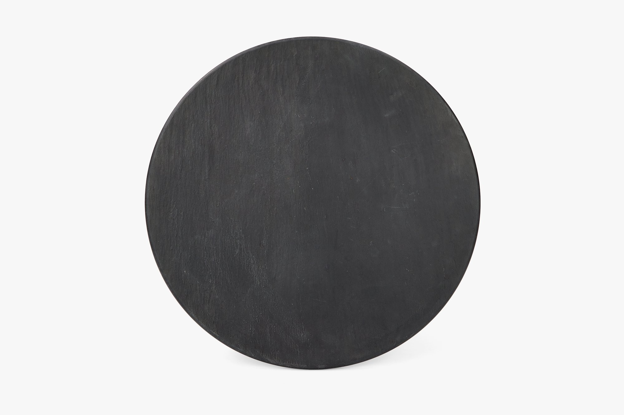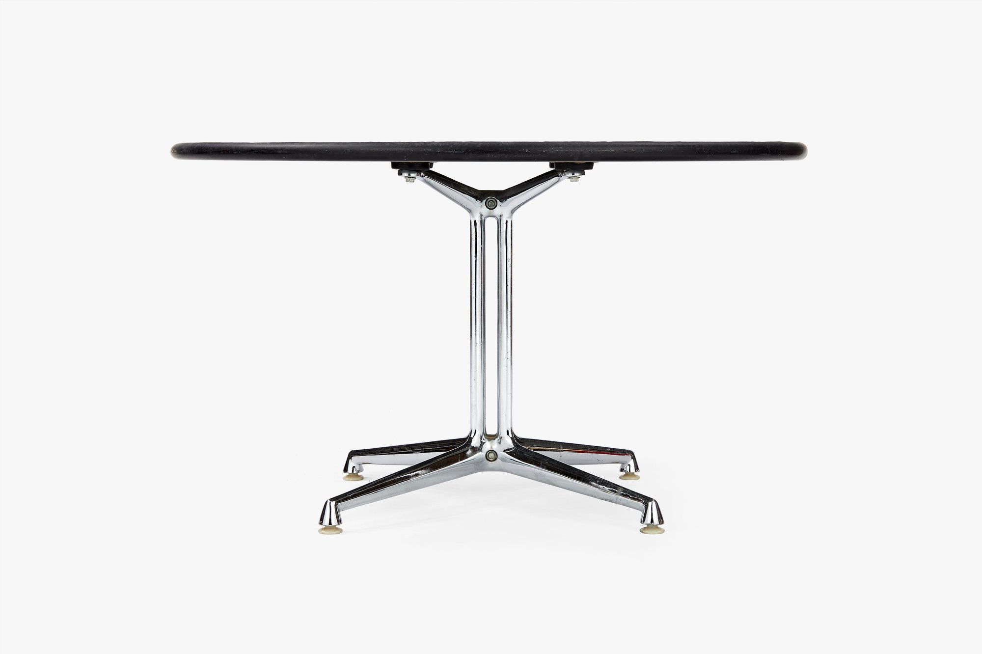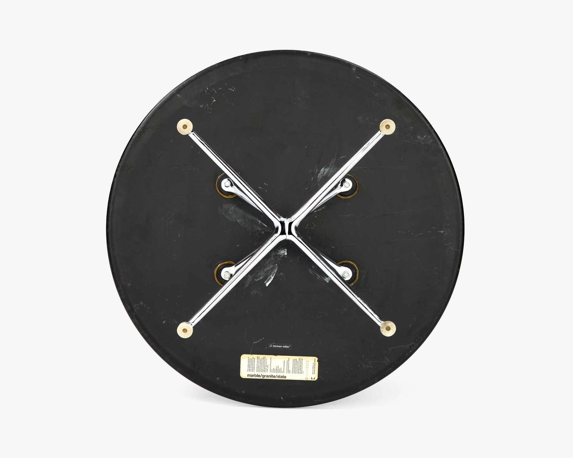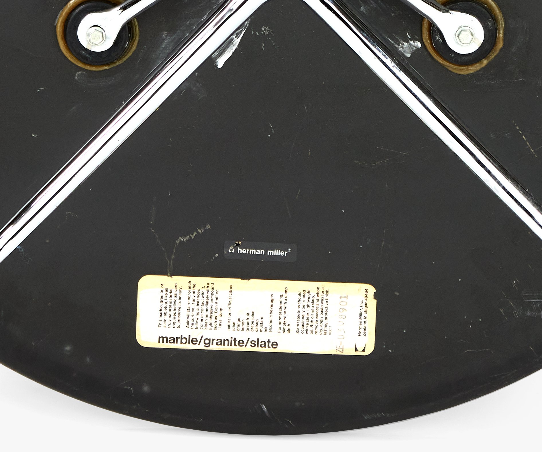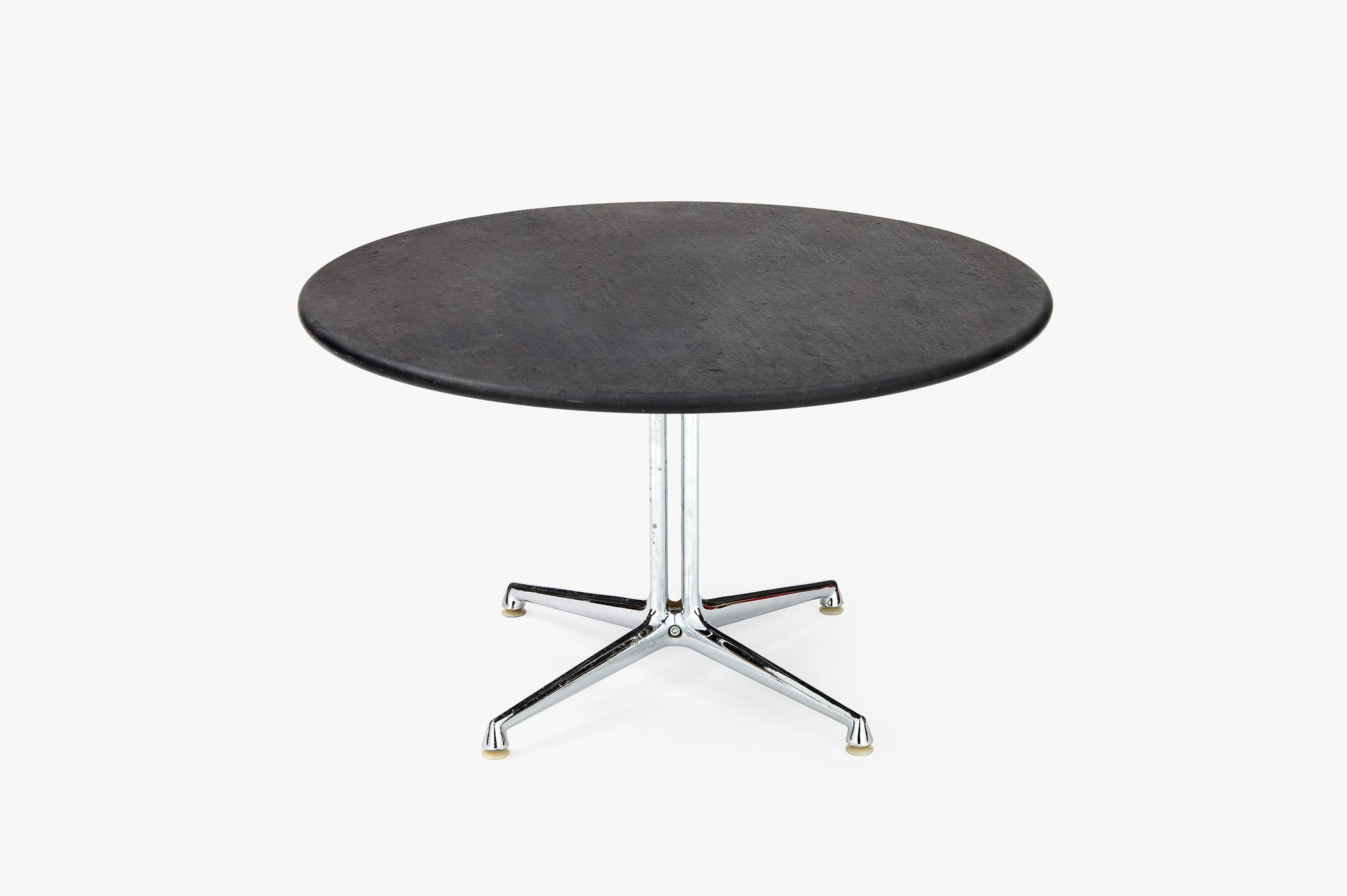 This table is officially dubbed model 3679 but is familiarly known as the La Fonda Coffee Table because of the relation of its base to the La Fonda chairs the Eameses designed at the behest of Alexander Girard for the La Fonda del Sol restaurant in New York City. Girard’s only stipulation was that the chairs’ backs rise no higher than the dining tables. To meet this requirement, the Eameses designed new fiberglass shell chair forms with lower profiles than their existing models. The other major innovation of the group was new base designs: a four-part, four-columned pedestal which the Eameses adapted to a two-part base for a series of tables. To achieve a base made of only two parts, the Eameses devised a cast aluminum form with a column that flared into a four-pronged spider. Welded together at the columns’ ends, one spider became the base and the other the tabletop attachment. Requiring a single mold, this innovation streamlined the aluminum casting process. The side tables were sold with natural stone tops such as the black slate option seen here, as well as white onyx with brown veins, and Carrara, Perlato, and Botticino marbles.