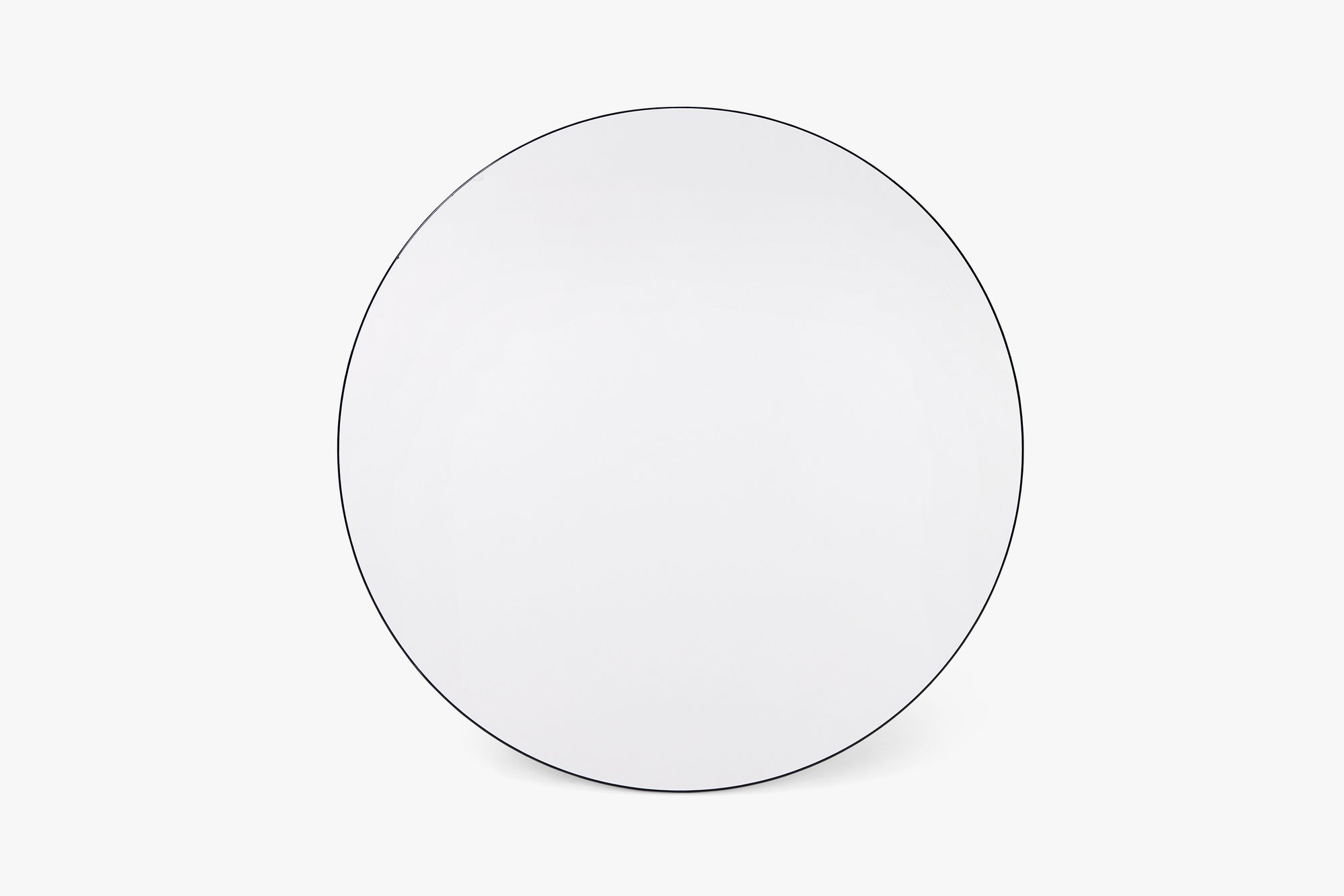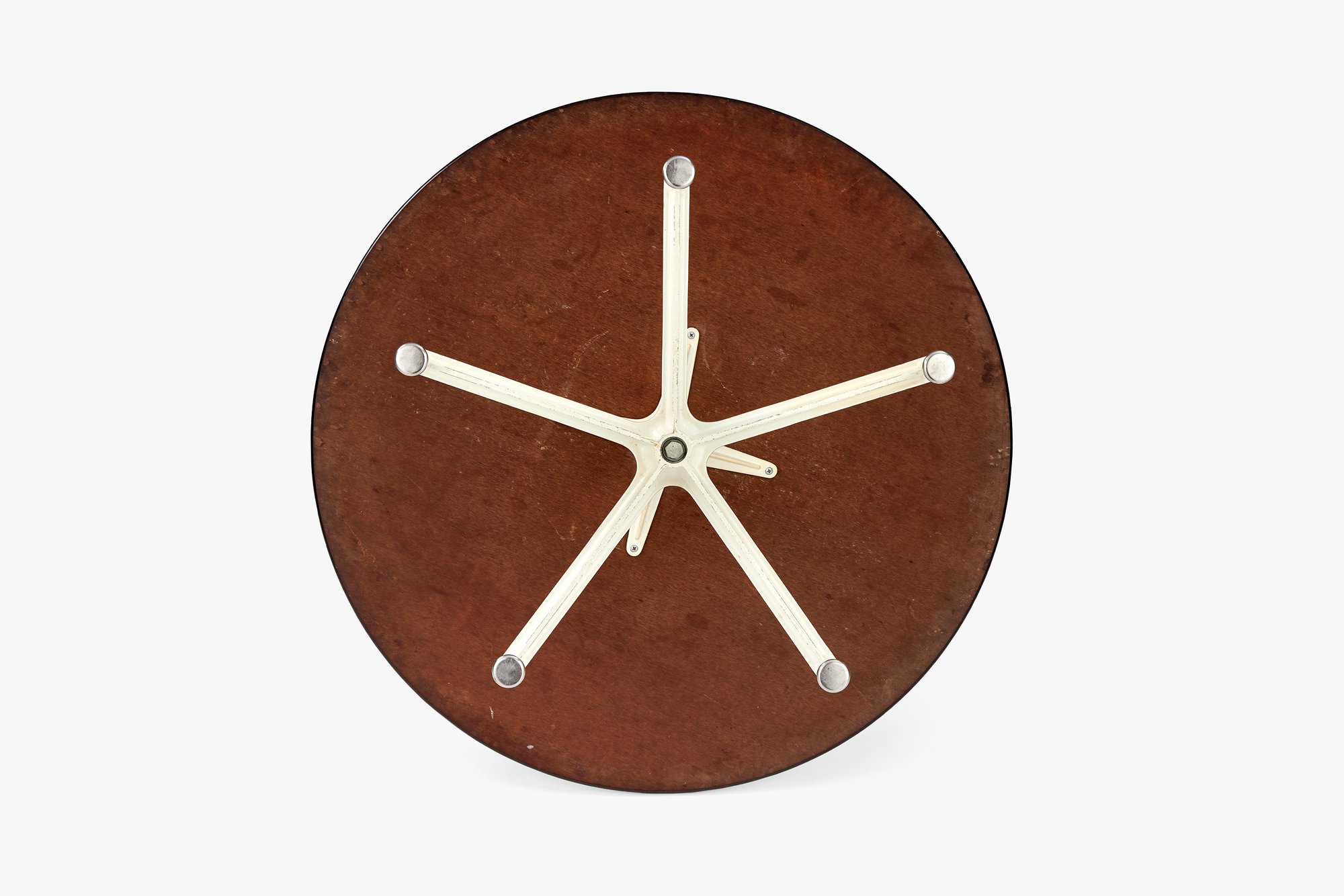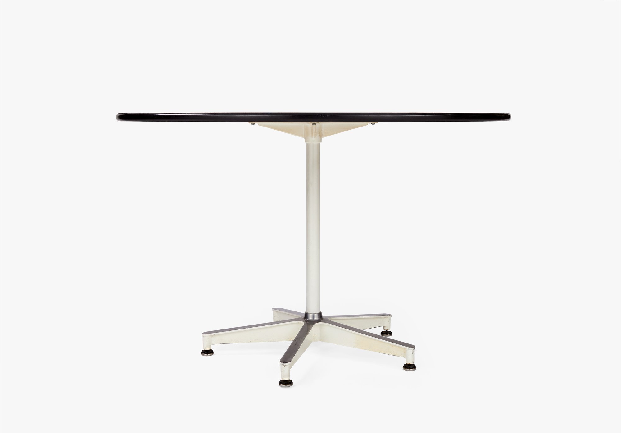 This dining table was the Eameses’ first mass-market table design that did not utilize plywood. It is surfaced with a white plastic laminate, edged with dark grey vinyl, and stands on a cast aluminum base—the first such base the Eameses introduced to the market. Like later similar versions, the base consists of three parts: a spider-shaped cast aluminum element that attaches underneath the tabletop, a rolled steel column, and a five-pronged cast aluminum foot. The sides of each prong are painted with a durable white enamel (it was also available in black), while their tops are left uncoated with the polished aluminum visible. Pedestal bases were favored by the Eameses—and other designers—in part because they provided users with more leg room. Pedestals were also an ideal solution to two of the Eameses’ chief design concerns: minimizing materials and dispelling unnecessary attention from a room’s furniture. This table was only in production for four years, but it lay the groundwork for other long-lasting designs. The 650’s base is roughly identical to those used in both the Stephens Trusonic Loudspeaker as well as the Eames Lounge Chair (model 670)—which remains one of the most iconic Eames furniture designs.
