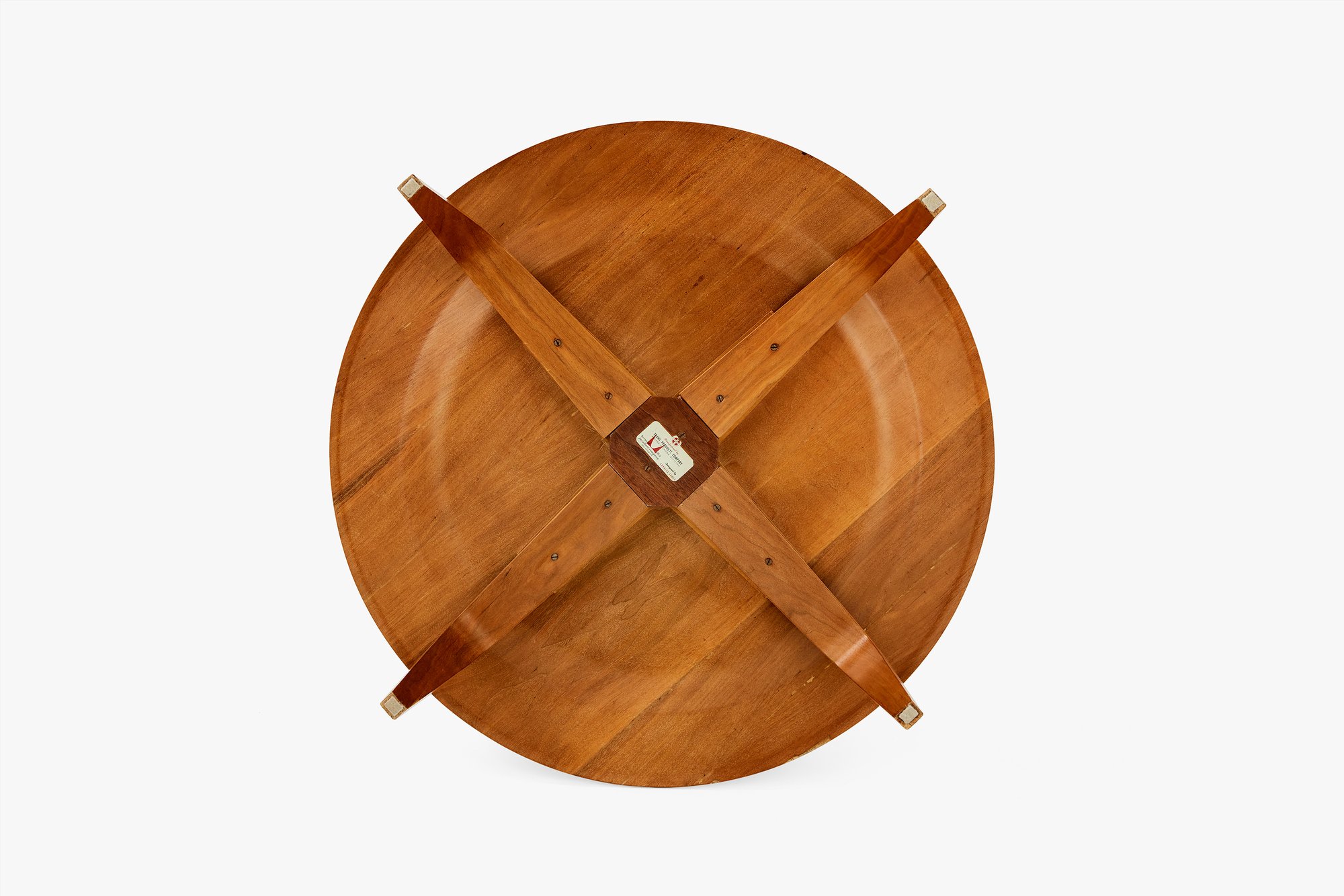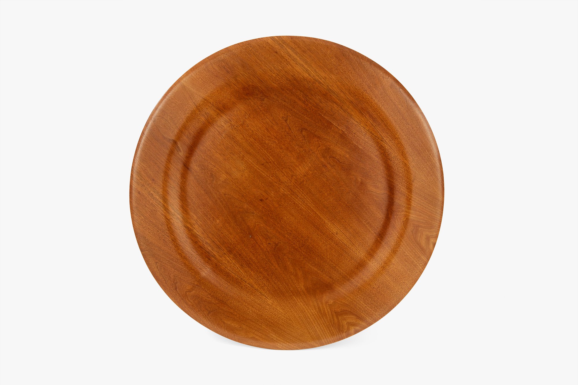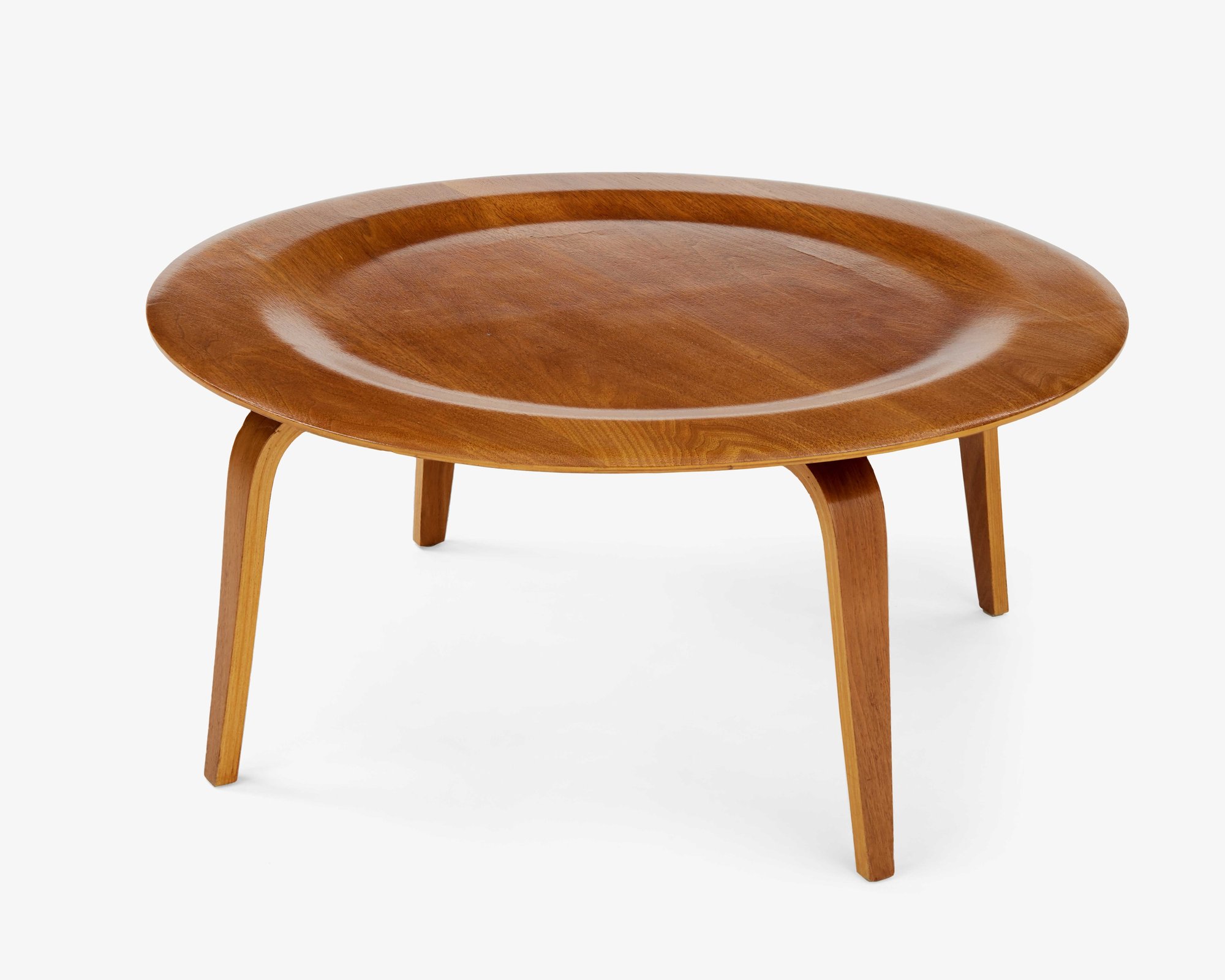 A version of this coffee table design was in the Eameses’ first group of plywood furniture that debuted at the Barclay Hotel in New York City in December, 1945, and was subsequently exhibited at MoMA in March, 1946. Its name, CTW, stands for “Coffee Table Wood." This follows the designers’ practice of naming designs with acronyms that first identify its type, followed by the material used for its base. In this case, the base and tabletop share a material: molded plywood, specifically walnut. The Eameses began experimenting with molded plywood in 1941. While they were not the first to make use of this production process (using heat to bend plywood into curving forms dates to the mid-19th century), they contributed significantly to its refinement and popularization. This table’s round top has a low, wide rim that brings a sense of containment to the surface. The top is also remarkably thin, such that sometimes Herman Miller salespeople would stand on the tables to convince skeptical buyers of their strength. The plywood legs on this model are similar to the legs of Eames plywood dining and lounge chairs, developed around the same time. Wide and flat, the legs curve down from beneath the tabletop before straightening into sturdy prongs.