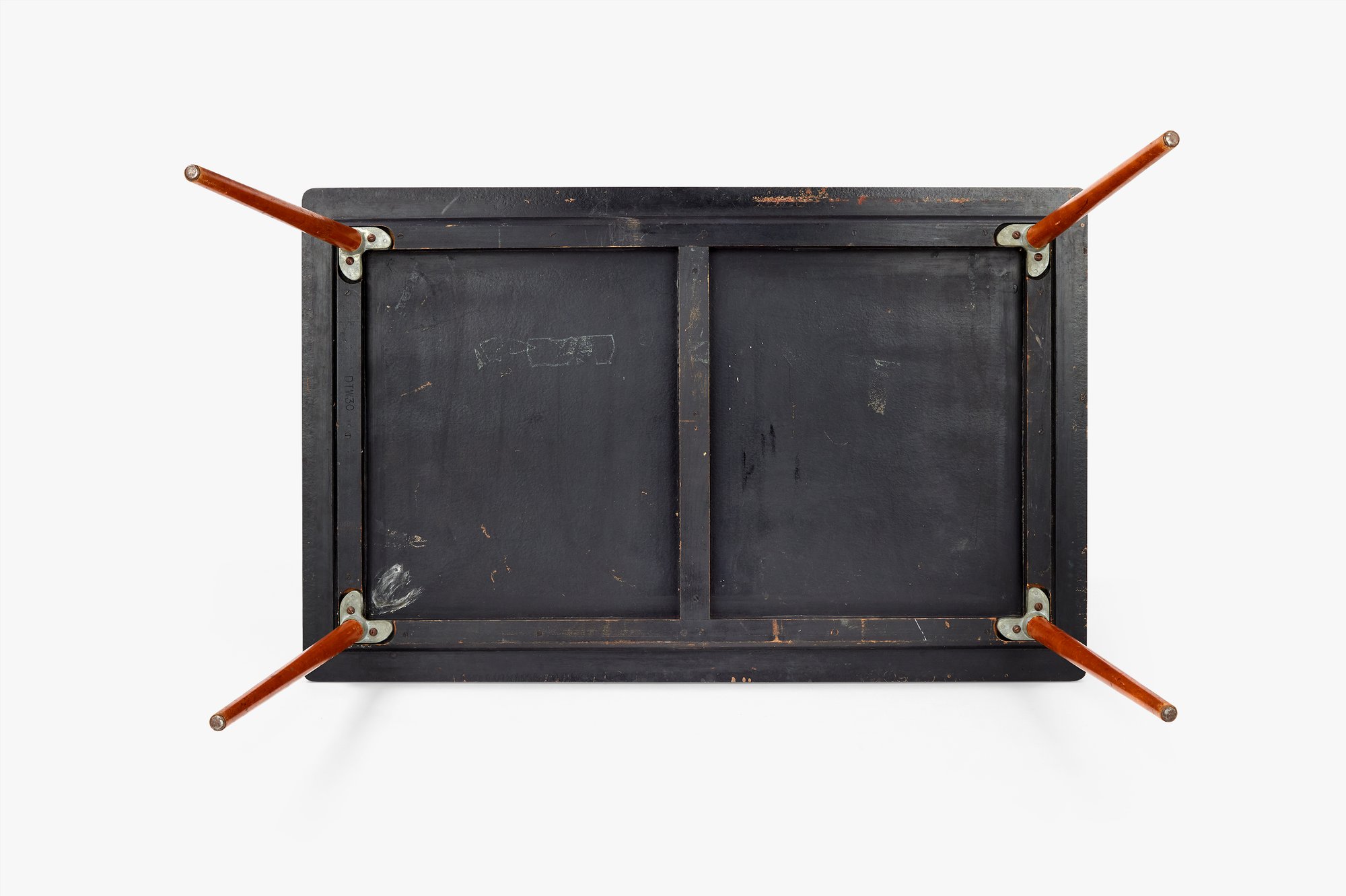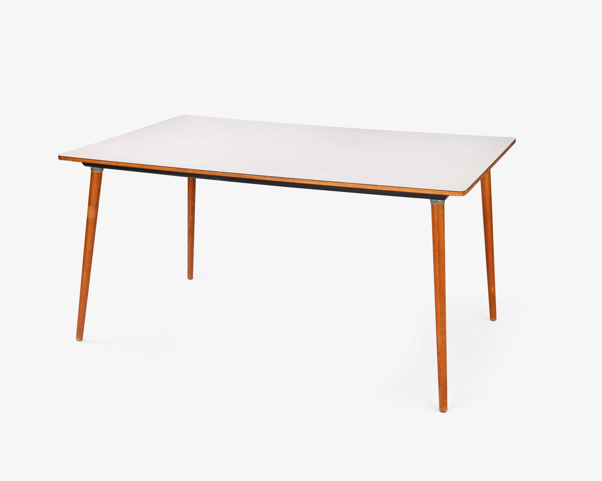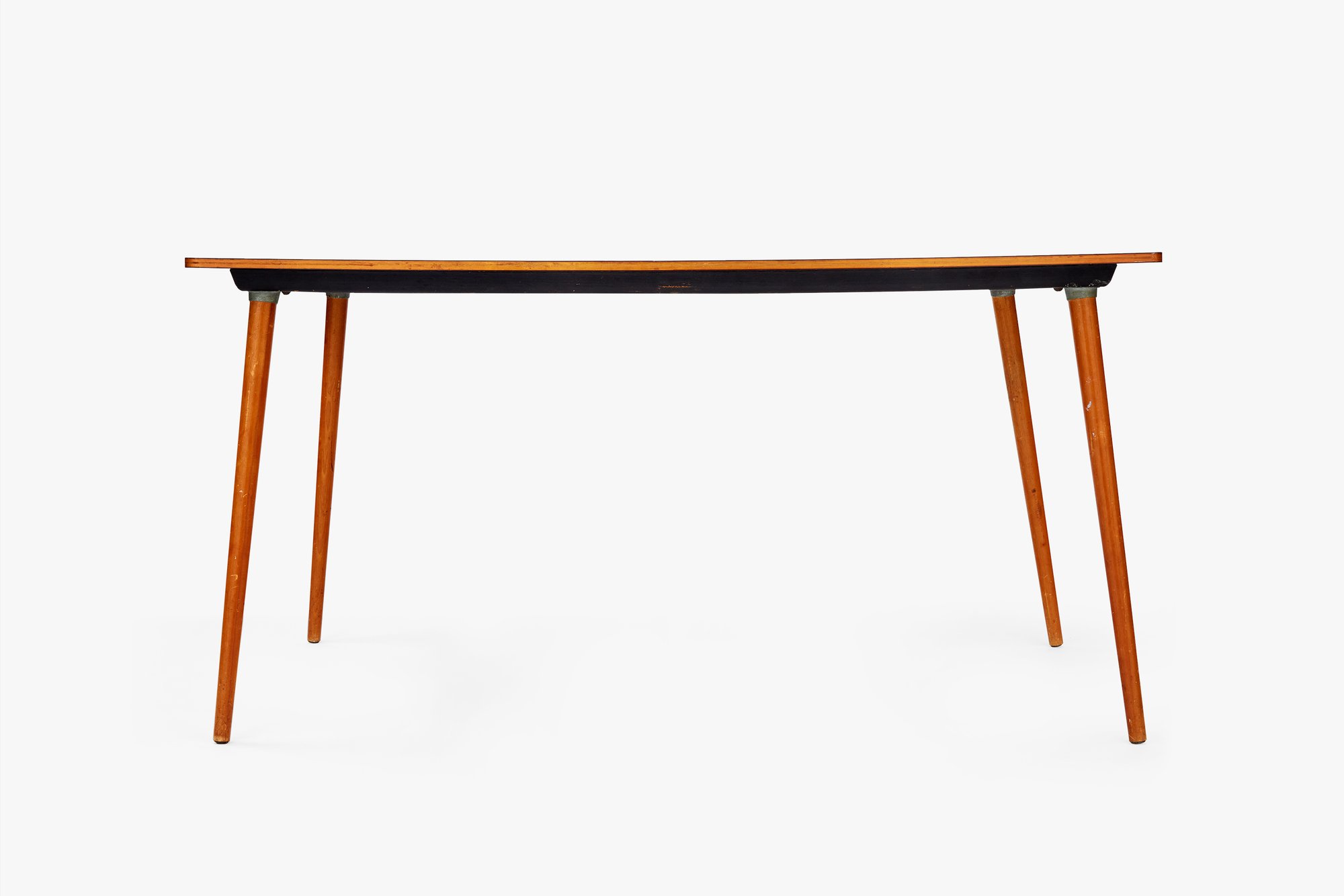 Although the first Dining Table Wood, or DTW, was introduced in 1946, this 1950 model offers a significant revision of the original design. Whereas the earlier DTWs feature tapered molded plywood legs that were creased to form a corner, the new design had solid wooden legs made from round dowels (both versions were detachable for easy shipping and storage). The solid dowels made for a sturdier table than their predecessors. The DTW’s tabletop was also changed in 1950 and made identical to the one used for the metal-legged DTM tables. This example has a plastic laminate surface, however, they were also available in a variety of wood veneers. Consolidating the design of the tops cut down on production costs and rationalized the series in general. The dowel leg tables were discontinued in 1956.
