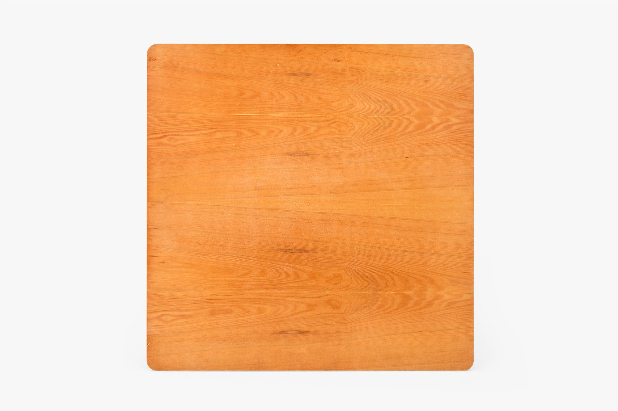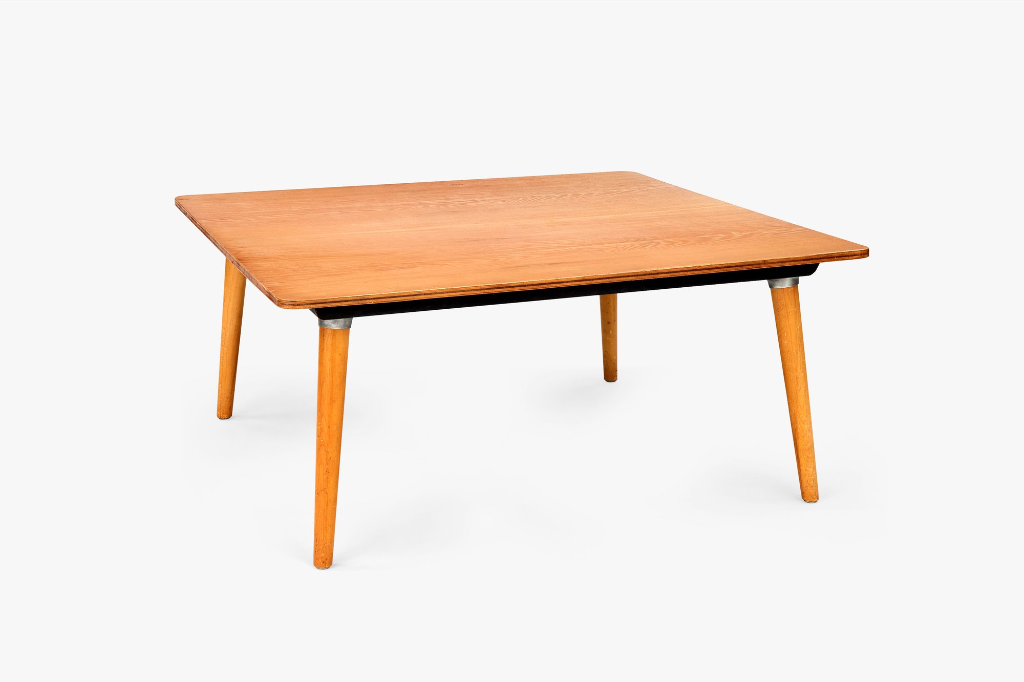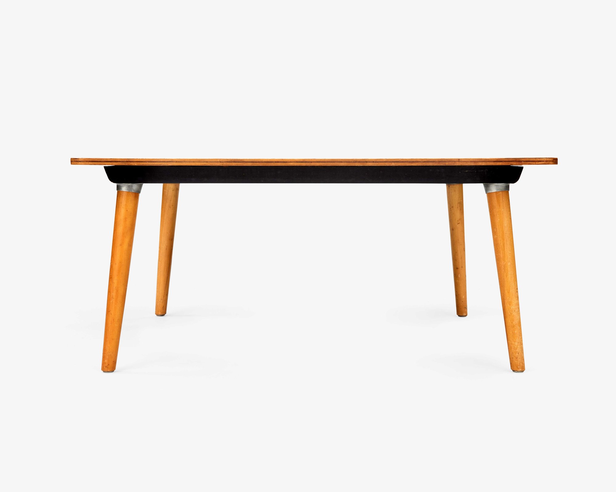Although considered part of the Dining Table Wood, or DTW, series, this DTW-50 was not a dining table but a 15-inch-tall coffee table. Introduced in 1952, it featured the same wood dowel legs that had been used for the series since 1950. While these were new to the Eameses’ commercial designs they were not entirely new to the designers. Charles had first used dowel legs over a decade earlier, as part of the design for casework that he and Eero Saarinen had submitted to the Museum of Modern Art’s Organic Design in Home Furnishing competition. This coffee table utilized the same tabletop as the DTW-40 card table and is therefore typical of the Eameses’ approach to mix-and-match bases. Though it was only in production for two years, the DTW-50 coffee table was offered in several finishes, including the birch veneer seen here, as well as a walnut veneer and black or white laminate.