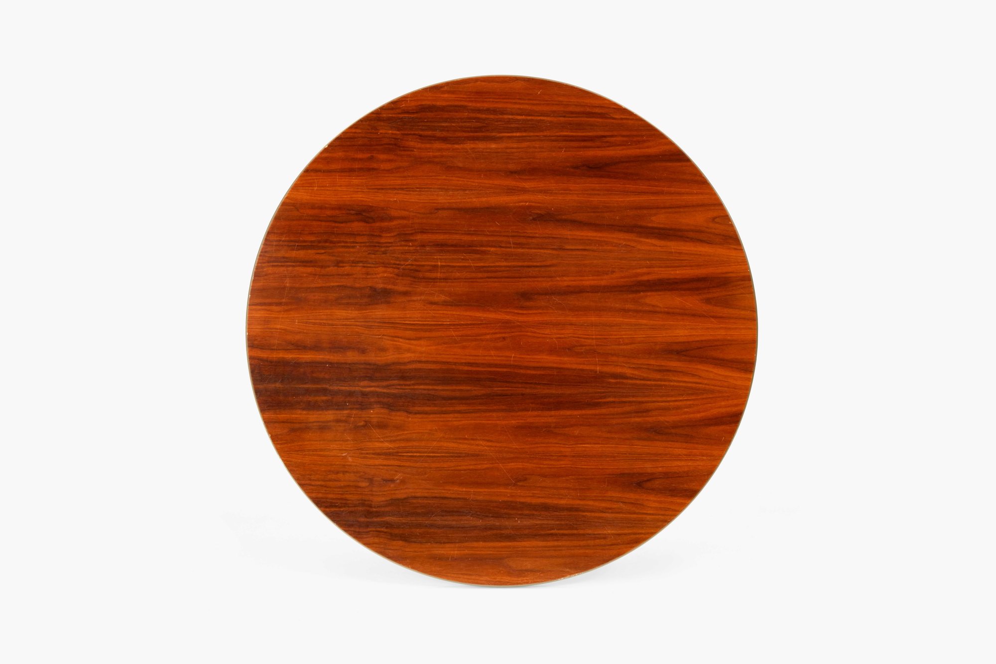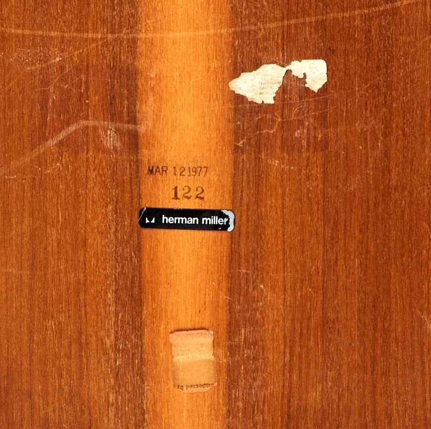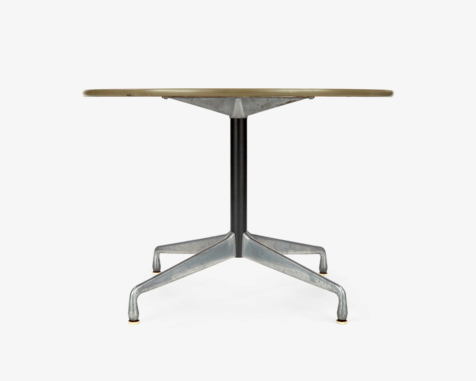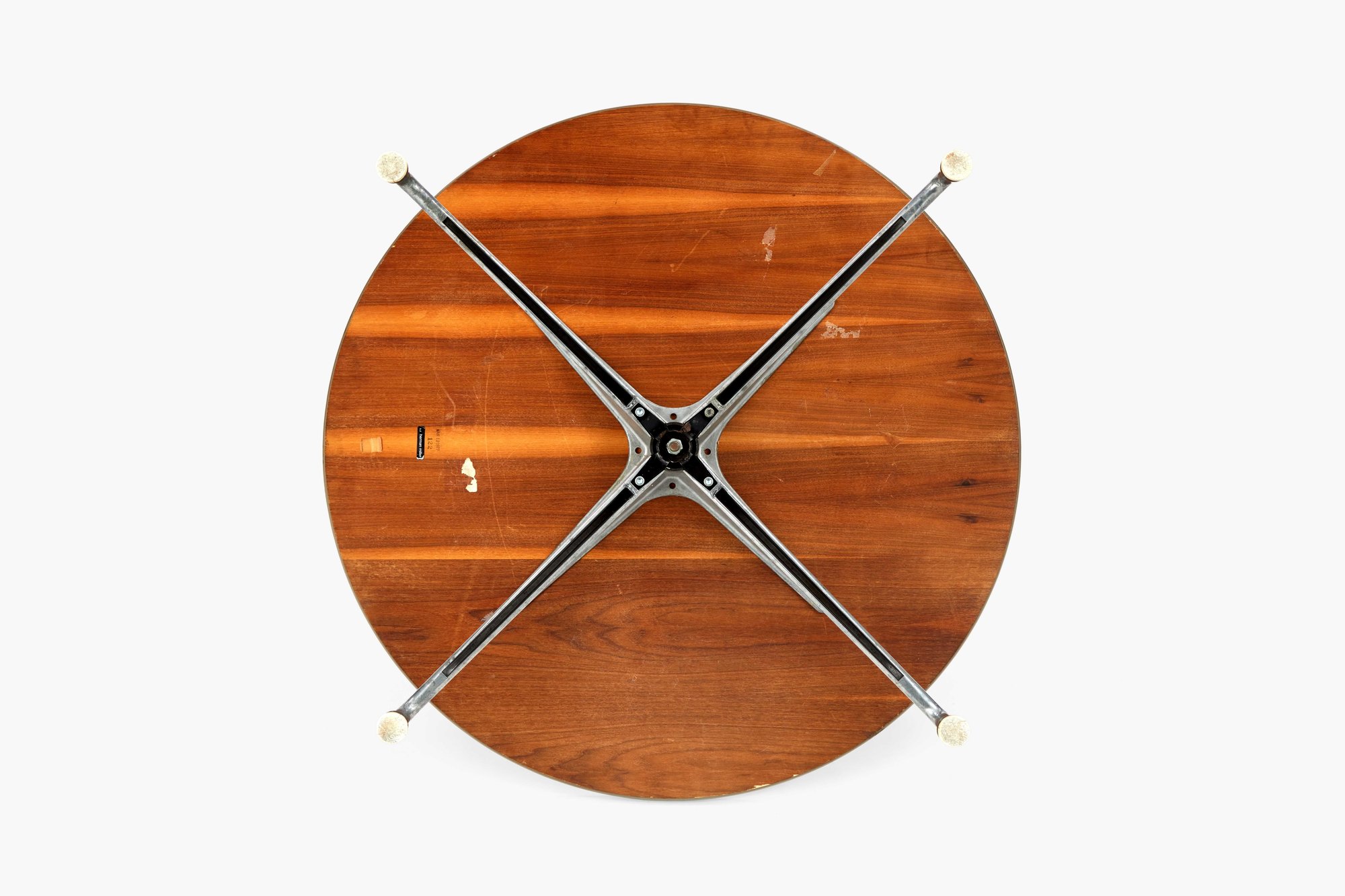 In 1964, Herman Miller introduced the Segmented Base Tables, which utilized a newly developed, highly modular system of bases that was rooted in past approaches but far more versatile. The Eameses had previously sought to create increasingly unified bases, now they took the opposite approach. Each component of the Segmented Base—columns, prongs, feet, and crossbeams—was considered as a discrete element that could be altered uniquely in every specification of the design as it was ordered by customers. A key benefit of this system was its ability to expand and contract as needed to support tables in a wide variety of sizes and shapes (including circles, rectangles, and softly contoured rectilinear ovals) that could be used as dining tables, worktables, conference tables, and more. It also allowed the tables to be packed flat for shipping (in the case of very large conference tables, the tops were also broken down into segments). This example shows the assembly at its most basic, with a single vertical steel column and four cast aluminum legs. Both the surface of the tabletop and its underside are covered in a walnut veneer. This kind of detailing is characteristic of the Eameses, who eschewed cutting corners and believed in making what they called “complete designs,” elegantly finished in all respects.