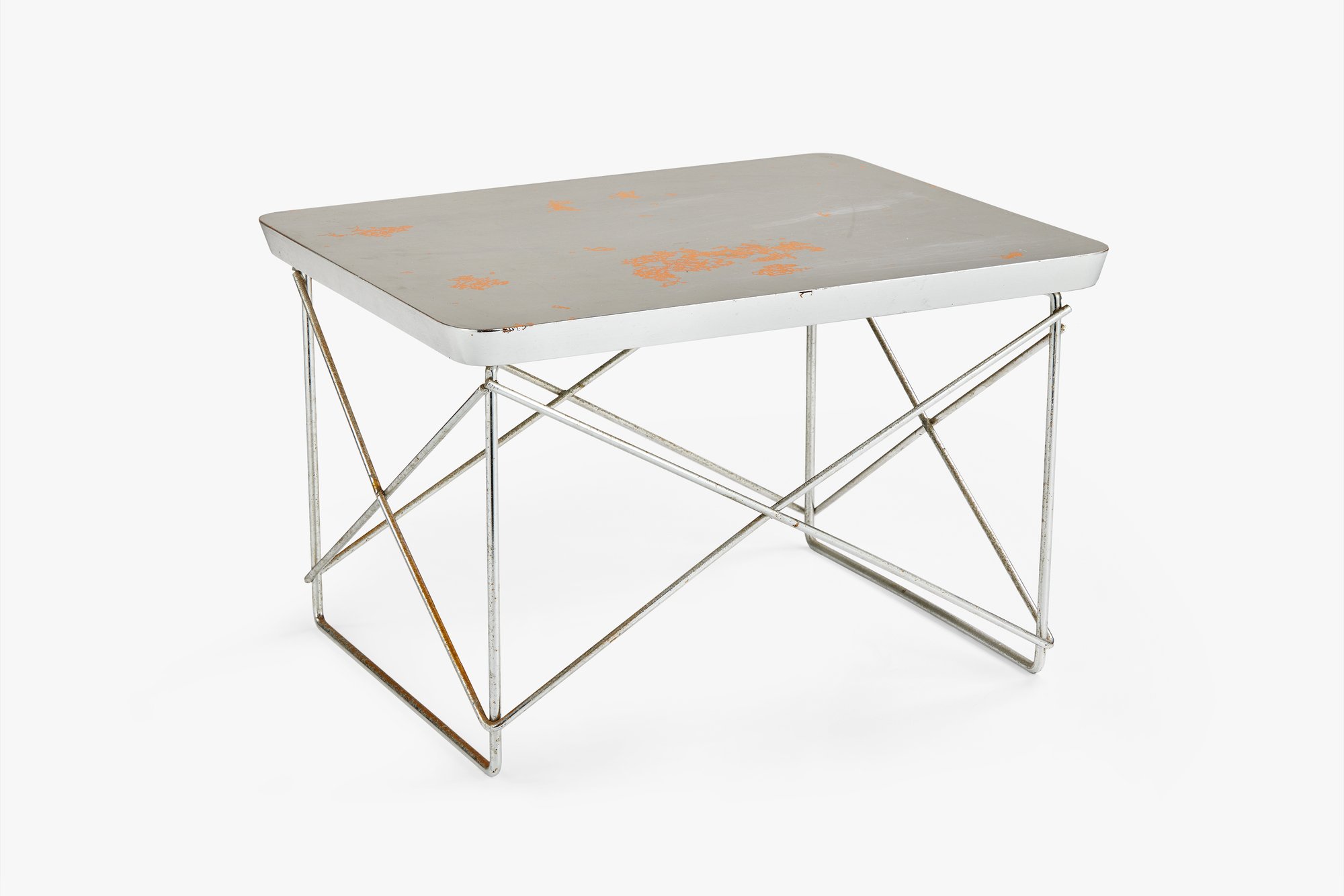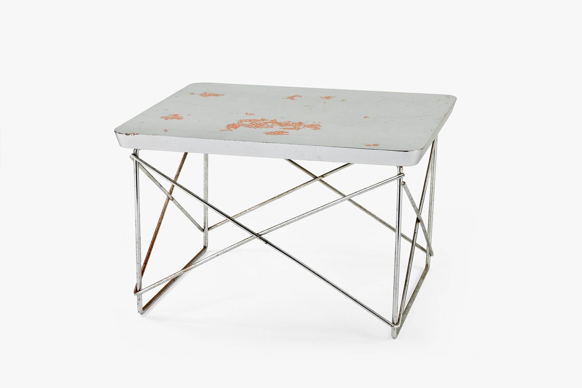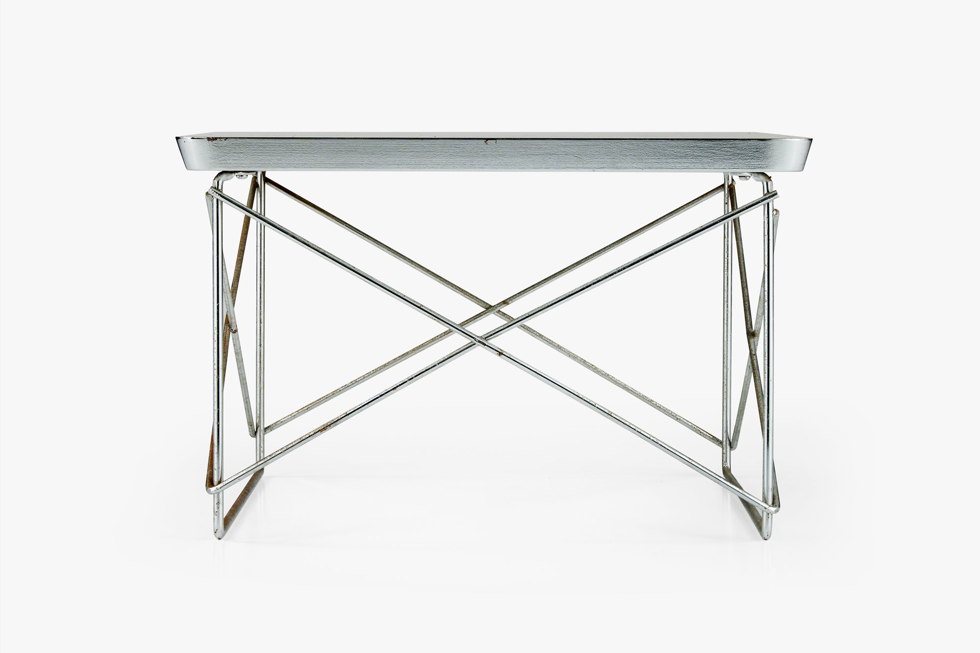 This unique silver-coated table was made at the Eames Office and is a variation on the Low Table Rod, or LTR, production model that was introduced in 1950. The LTRs were occasional tables designed to be used as side tables, children’s play tables, or even stools. They used the same materials and production methods developed for earlier Eames table designs: plywood tops finished with either wood veneer or plastic laminate and metal rod bases attached to slender cross braces for stability. Despite these resemblances, the LTRs were promoted as part of a new wave of Eames furniture that included their molded plastic chairs—in a 1950 Herman Miller catalog the LTR was described as “an ideal companion to the plastic chair.” This example is distinguished from the production model by its silver-coated surface. The Eameses may have been experimenting with options for commercial production, or it is possible that this table was envisioned as something that could be employed for a special use, such as an exhibition installation or unique gift.