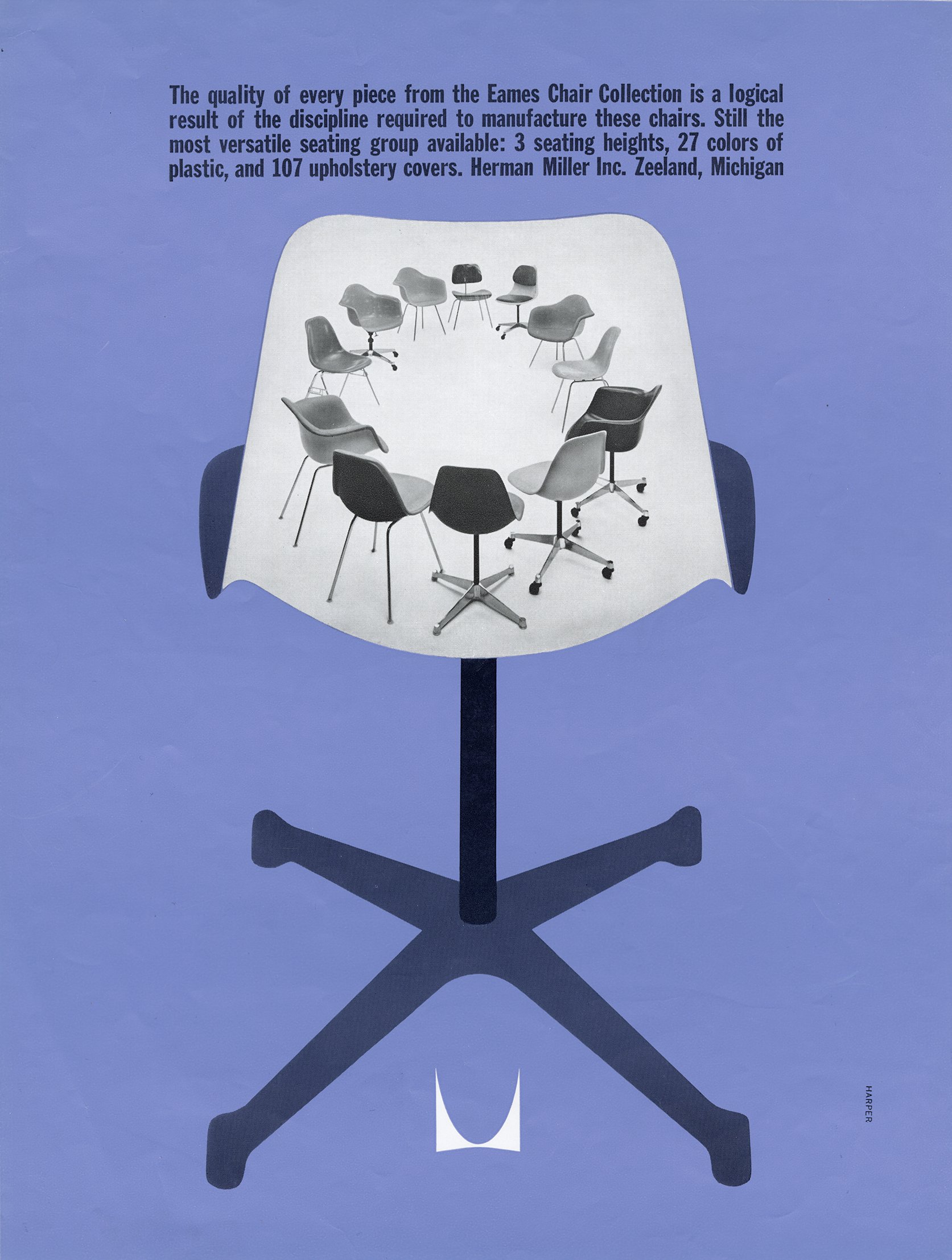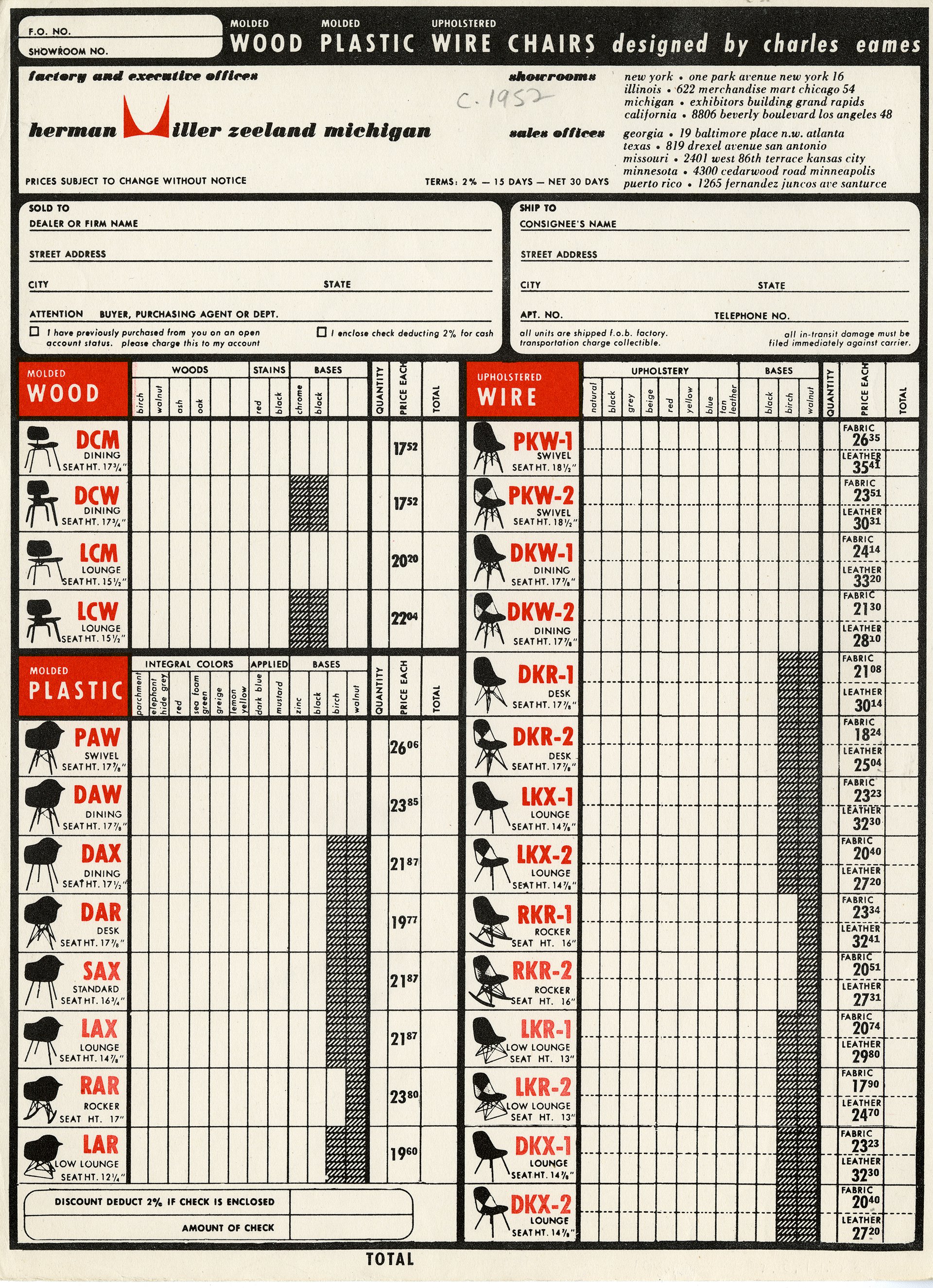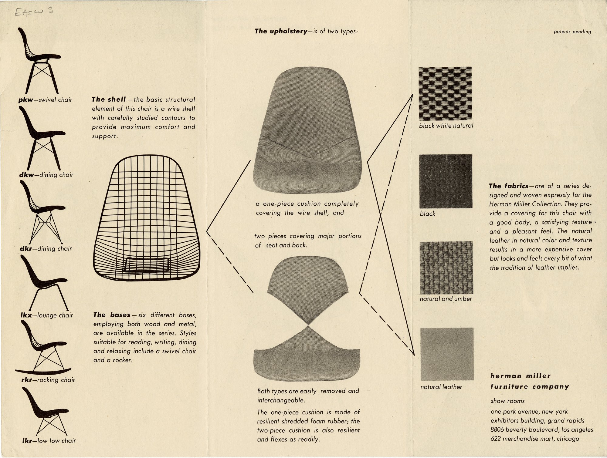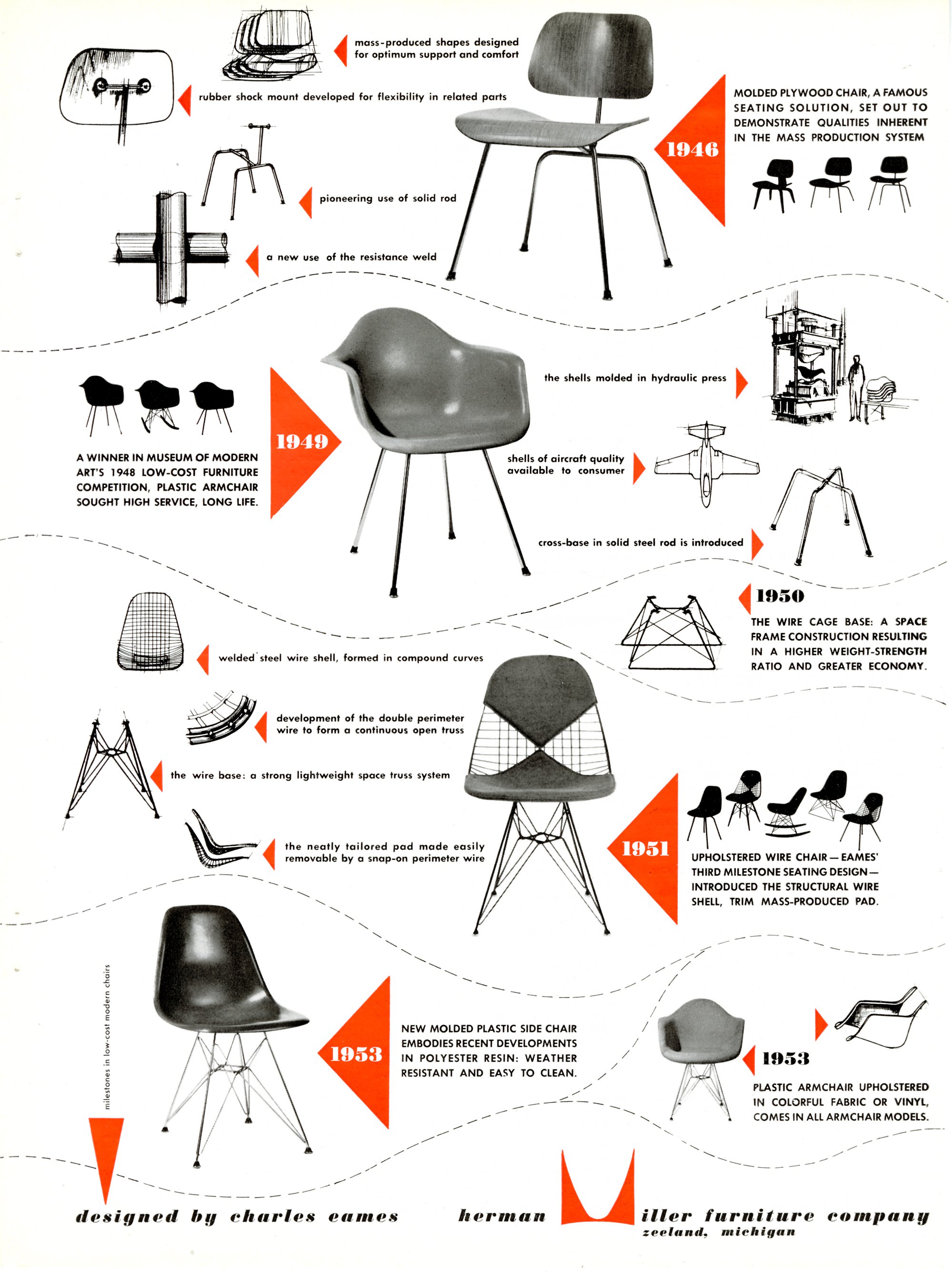 That the Organic chairs never came to fruition offered Ray and Charles an invaluable lesson going forward: determining the technique and viability of manufacture was critical to the successful development of any design. In recognition of this (and the 1940 antecedents) the introductory text for the new chairs read “the form of these chairs is not new nor is the philosophy of seating embodied in them new—but they have been designed to be produced by existing mass production methods at prices that make mass production feasible and in a manner that makes a consistent high quality possible.”