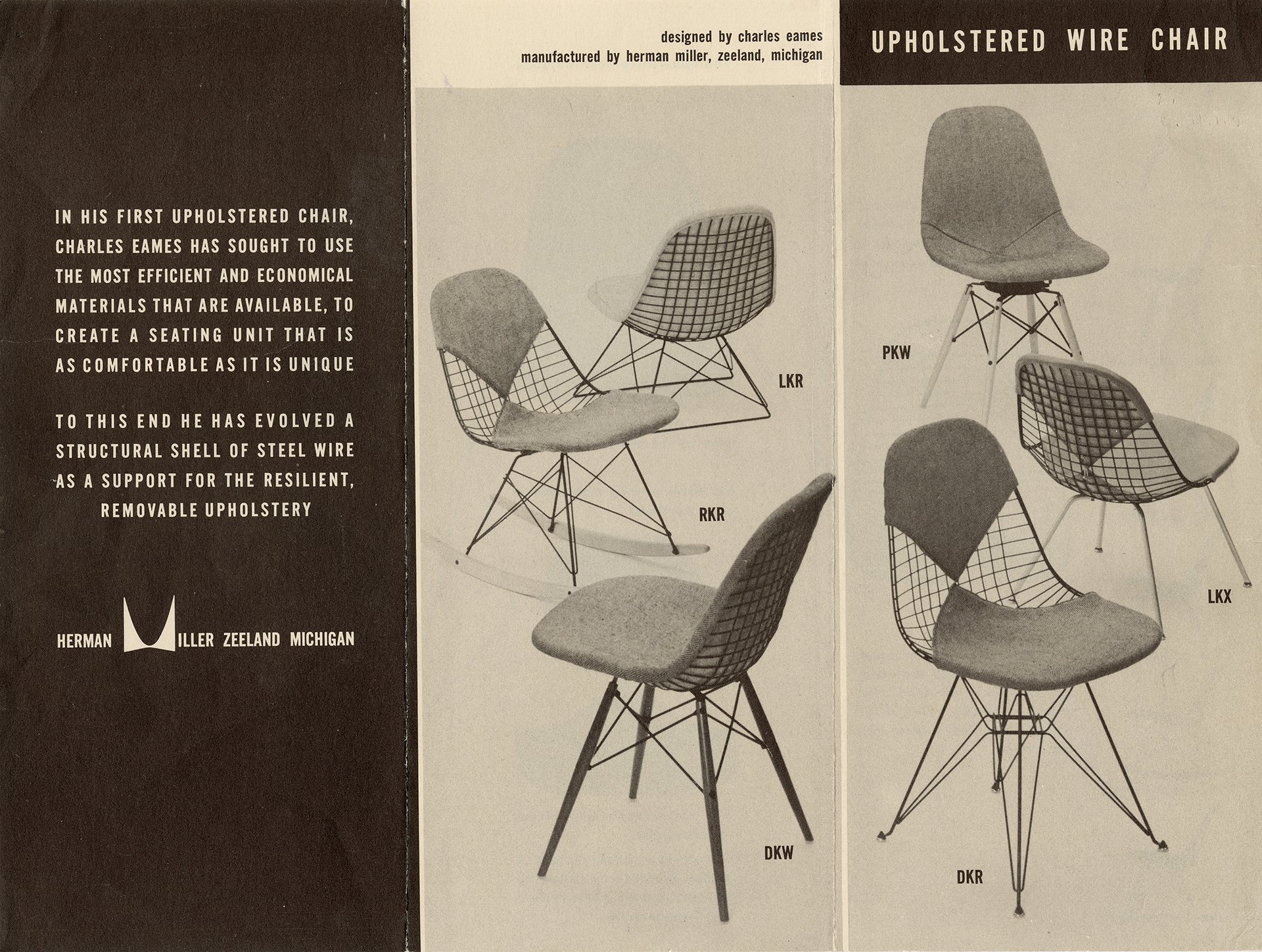 The Eameses and Herman Miller had initially approached the armchair believing it to be the more complex of the two designs. This initial supposition turned out to be erroneous as the arms offered an overall stability to the molded piece whereas the side shells were prone to flexing and cracking. The mass production of the fiberglass side shells proved to be so problematic that in the intervening period the Eameses were able to realize an entirely new design for the side shell in resistance-welded wire. The technique for wire rod construction was familiar to the office from various table and chair bases, and with some minor adaptations, proved to be successful for creating a durable and lightweight seat. Like its fiberglass counterparts, 1951’s Wire Mesh Chair adapted to a number of different bases (albeit without shock mounts) and offered a revolutionary approach to upholstery. The chair was conceived to accept easily replaceable one- or two-piece pads that accounted for only 10 percent of its total cost.