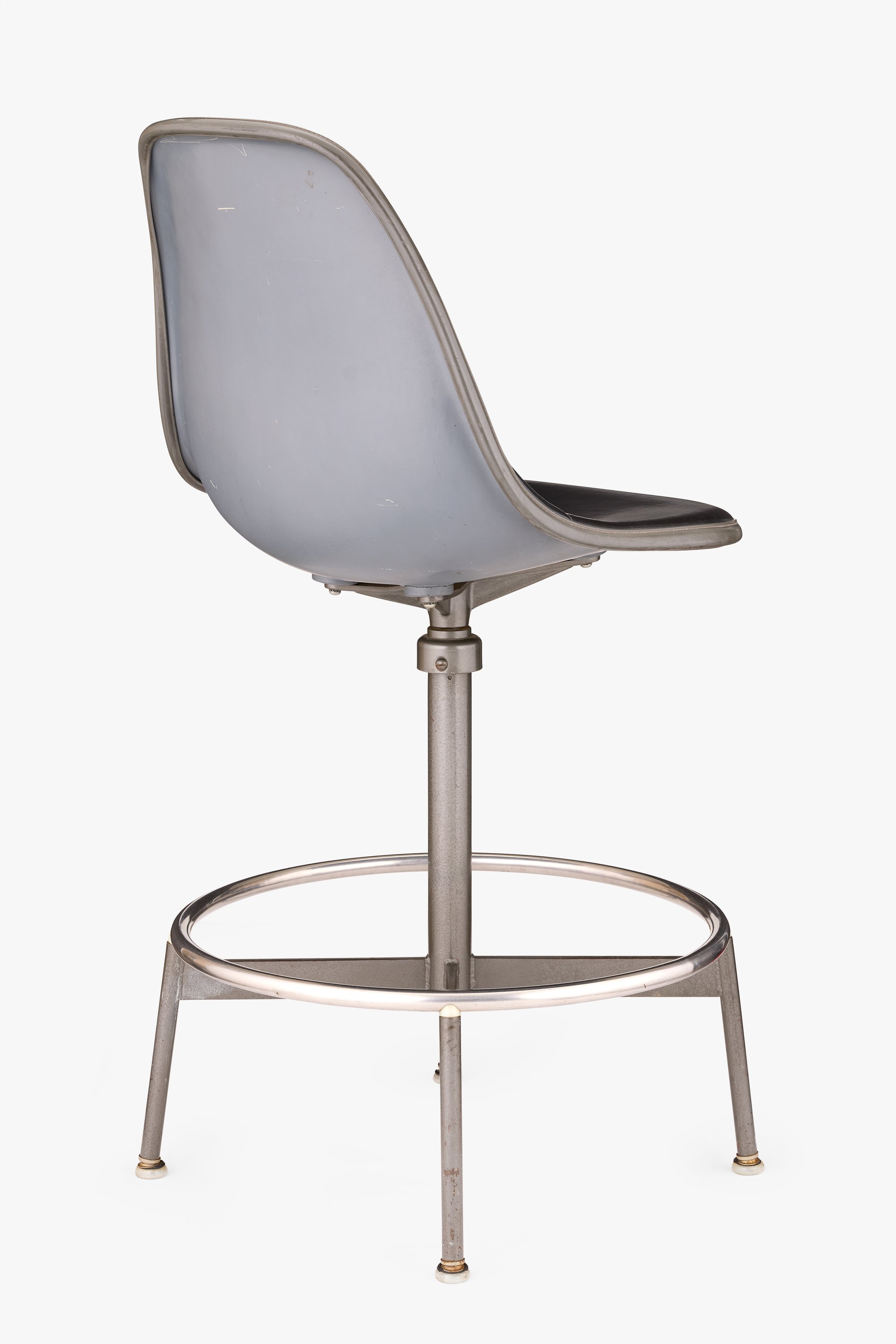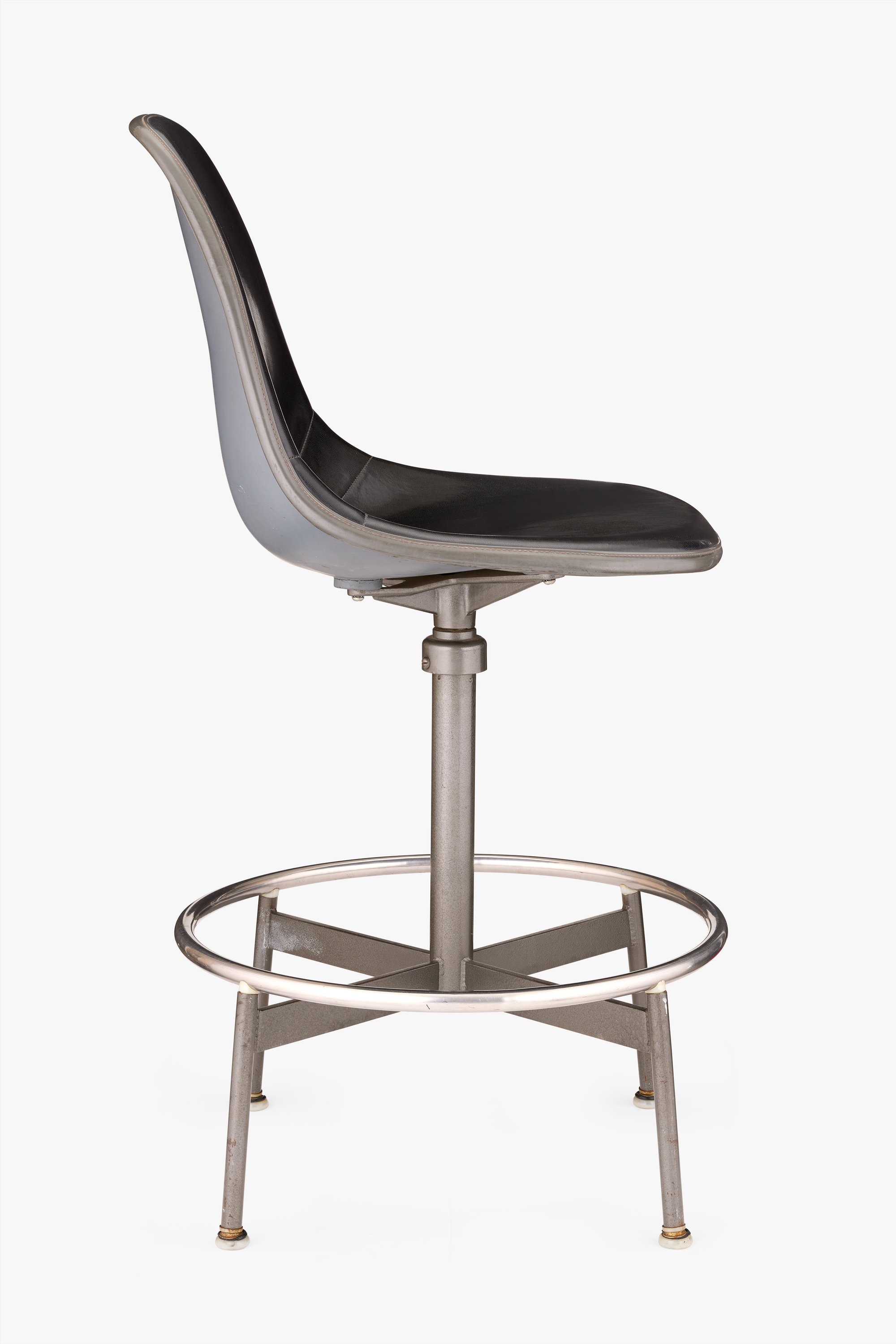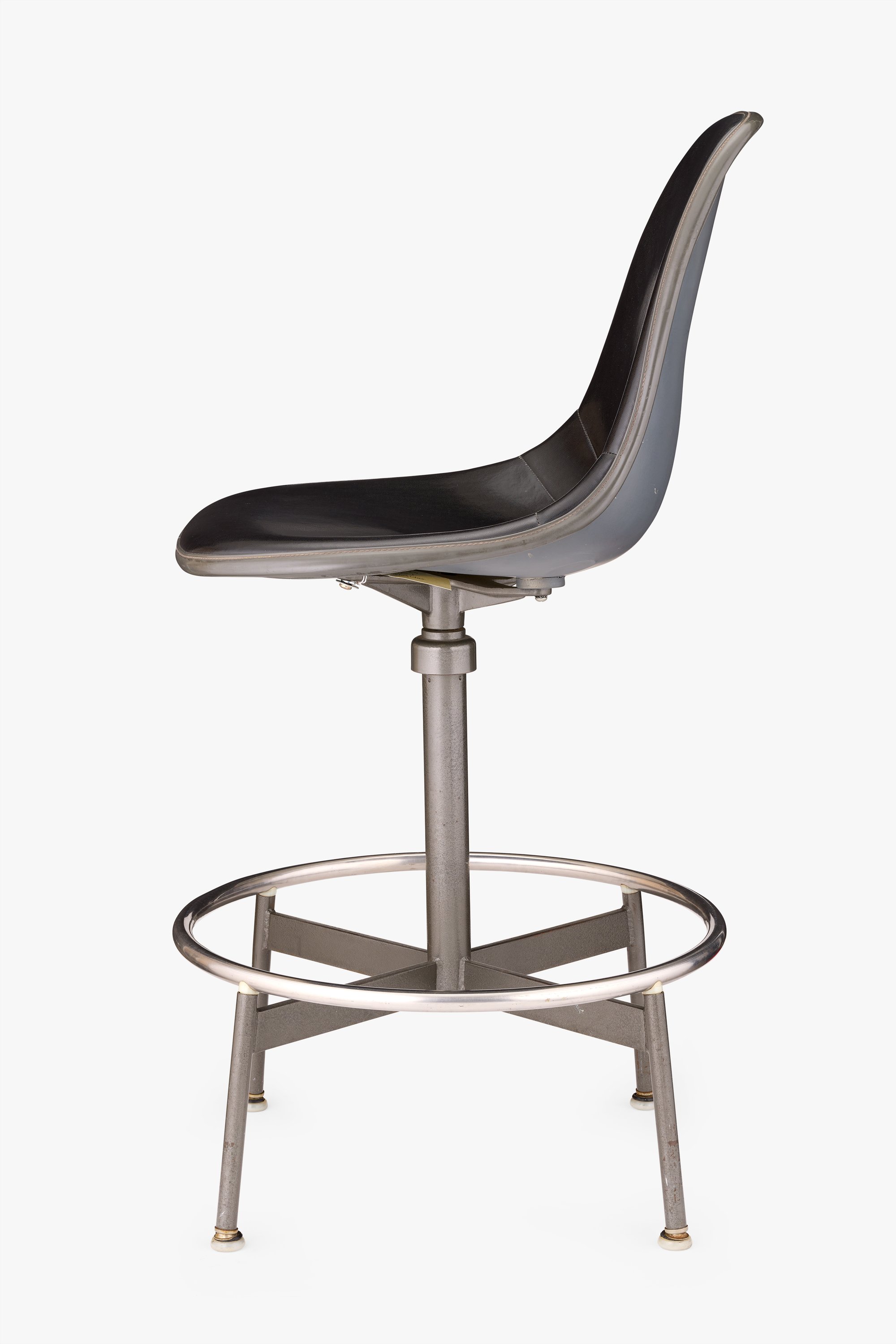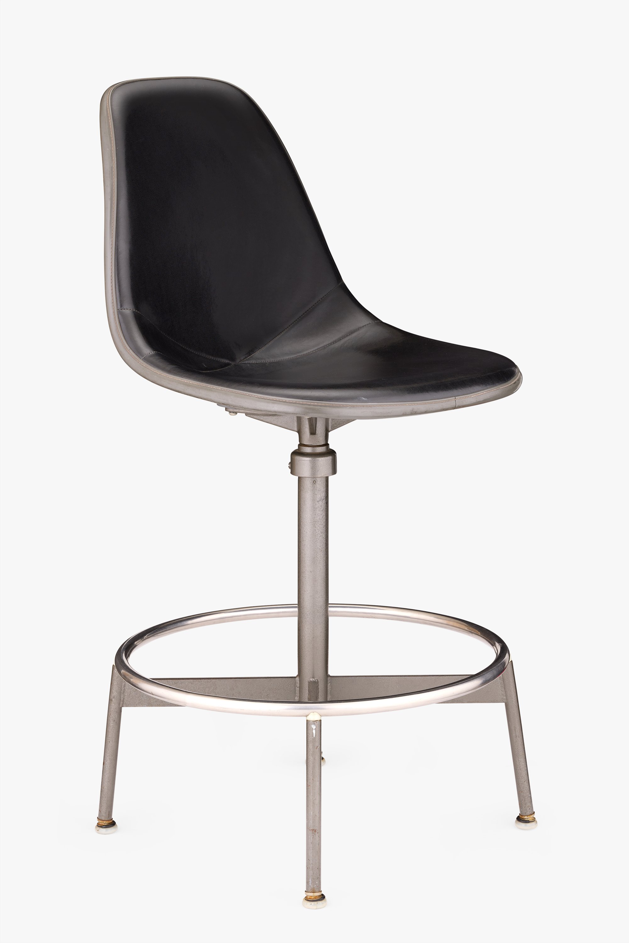 Ray and Charles solved the problem of accommodating various body types by producing the Drafting Chair in three heights: small, medium, and large. This medium height Drafting Chair is the first version, introduced in 1953. A threaded post, located under the seat, offered three additional inches of height adjustability. The Herman Miller sales team, concerned that the Drafting Chair’s expense and fewer features than others on the market would deter sales, later discovered their worries were unfounded as sales exceeded expectations.