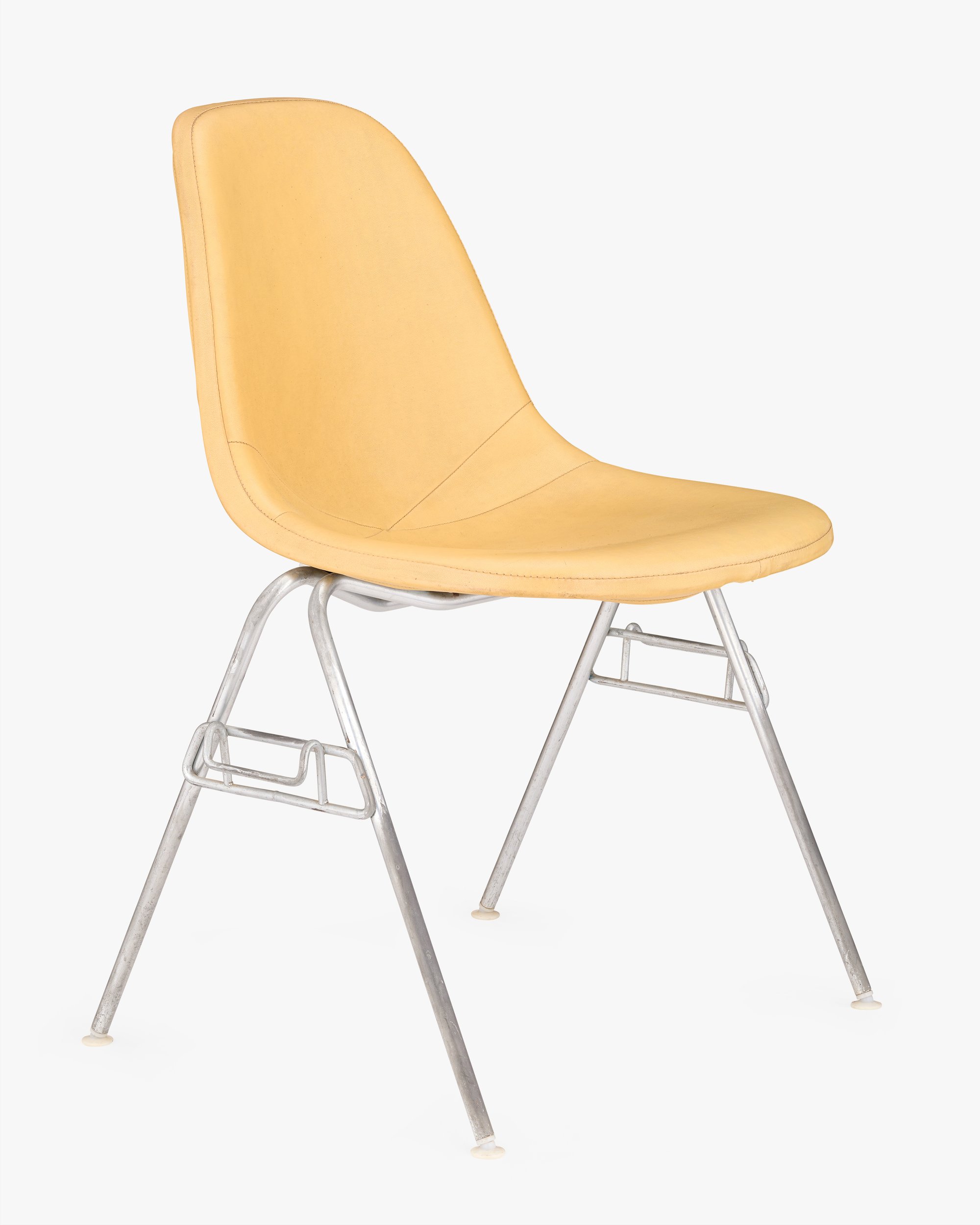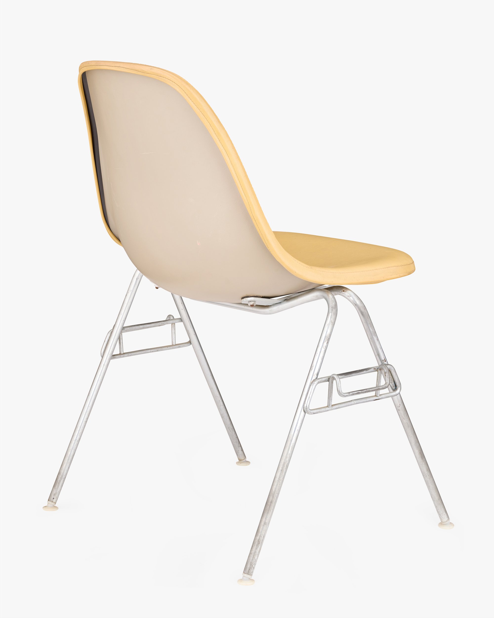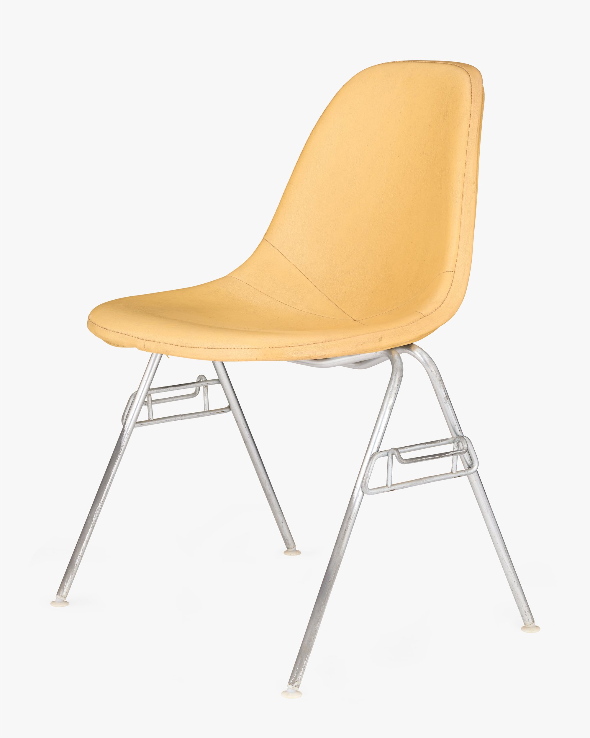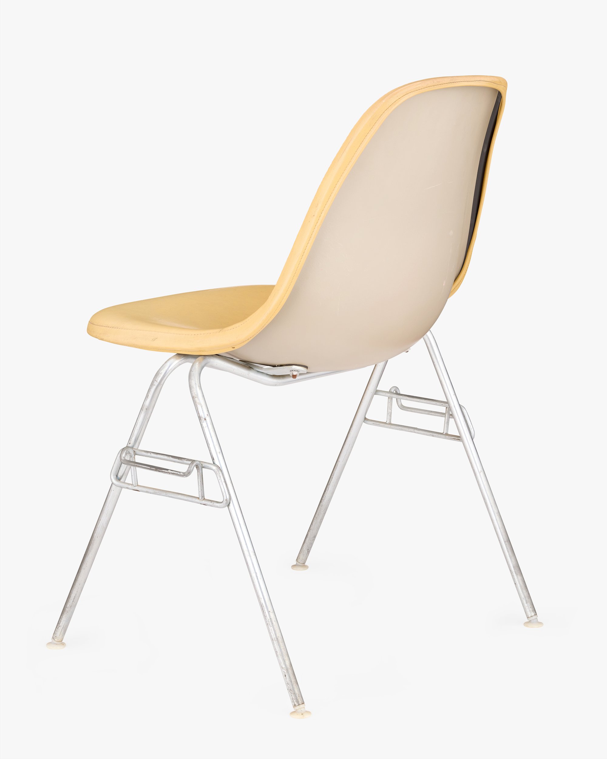 Naugahyde, a brand of synthetic leather, was commonly used to upholster the Side Chairs. This DSS-1 became very popular for schools and auditoriums because they could be stacked for storage and the interlocking side brackets used to create long, orderly rows of chairs. DSS stands for Dining (height) Side (chair) Stacking (base) 1 (upholstered).