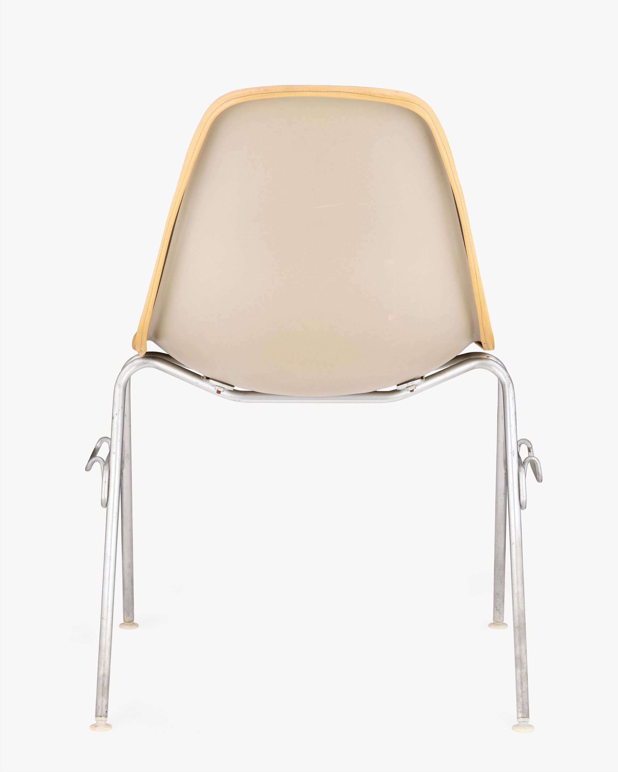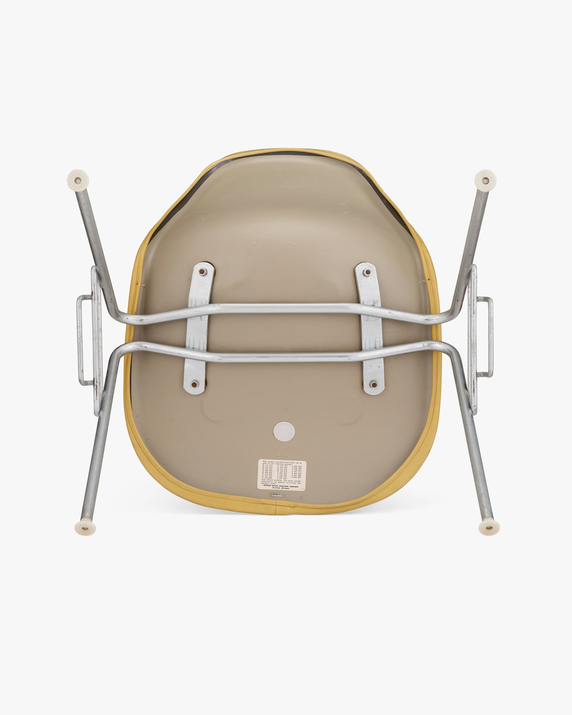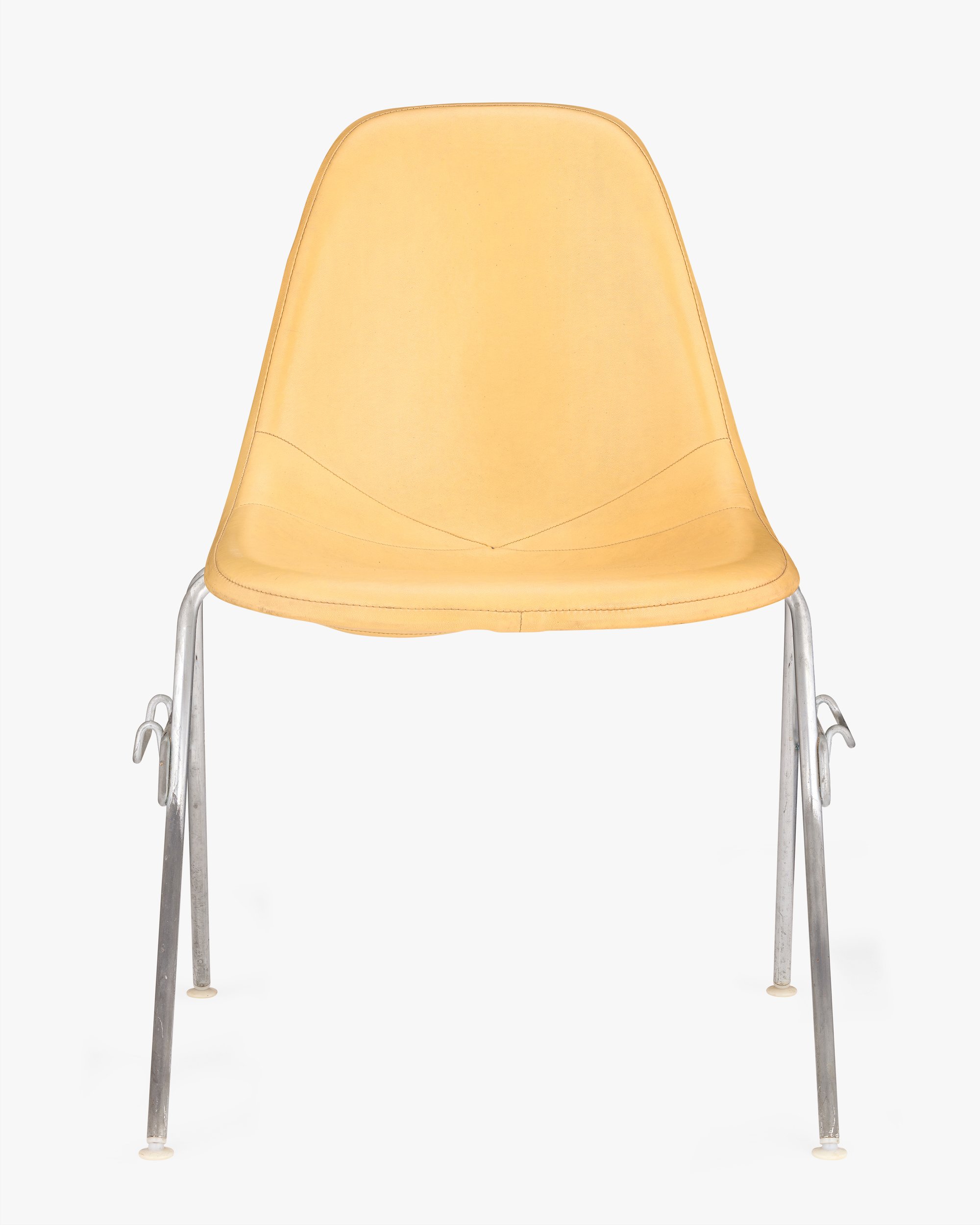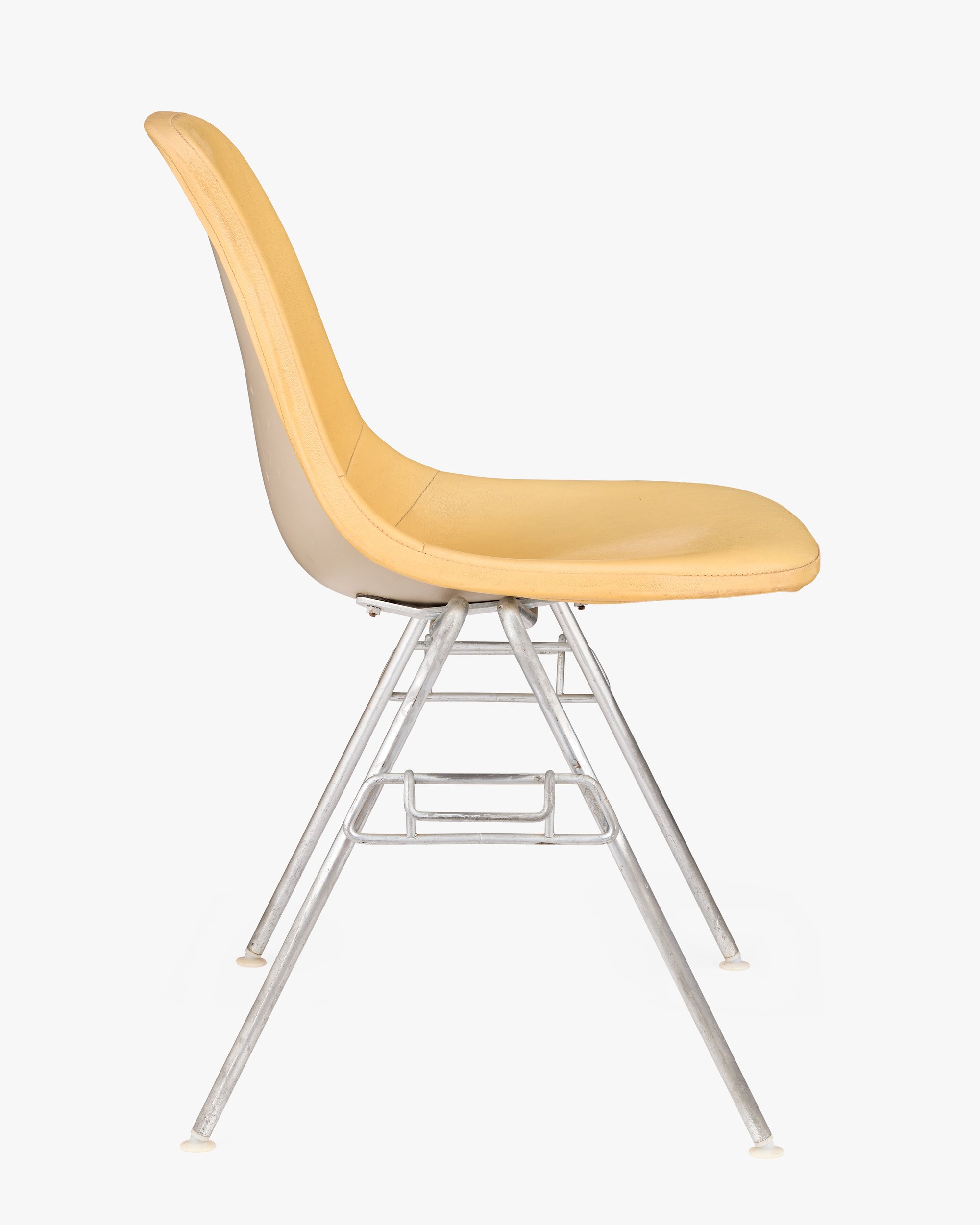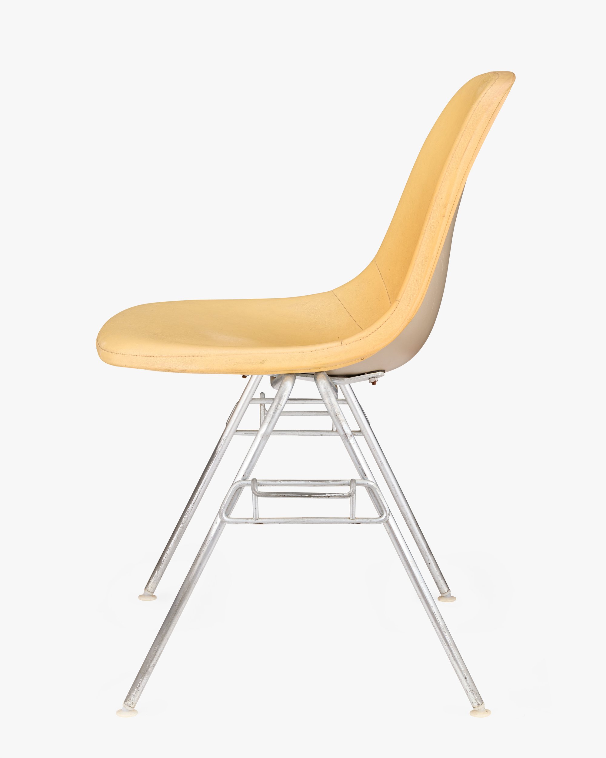 Naugahyde, a brand of synthetic leather, was commonly used to upholster the Side Chairs. This DSS-1 became very popular for schools and auditoriums because they could be stacked for storage and the interlocking side brackets used to create long, orderly rows of chairs. DSS stands for Dining (height) Side (chair) Stacking (base) 1 (upholstered).